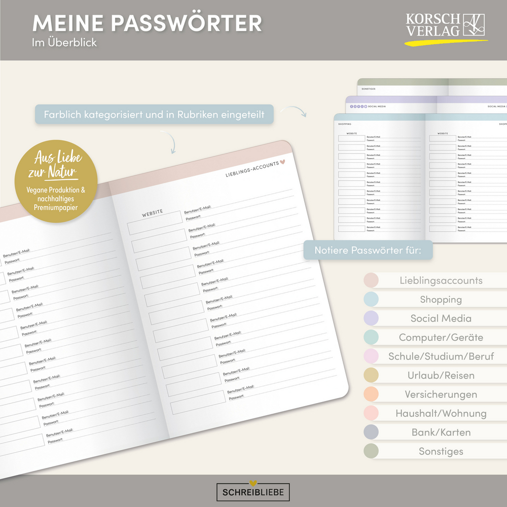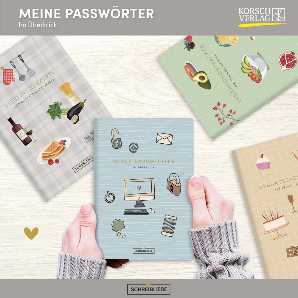 Hier kannst du deine Anmeldedaten, Benutzernamen und Passwörter notieren und nach Rubriken wie Social Media, Online-Banking oder Shopping ordnen.