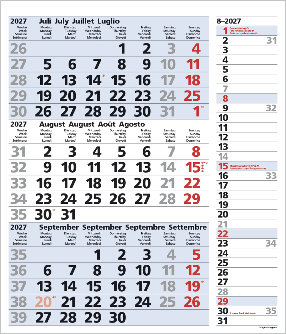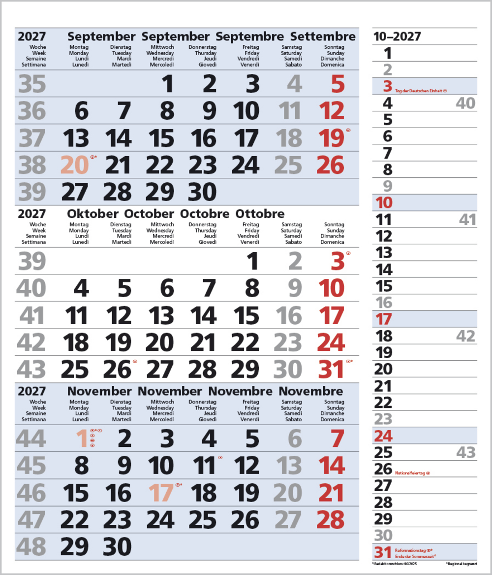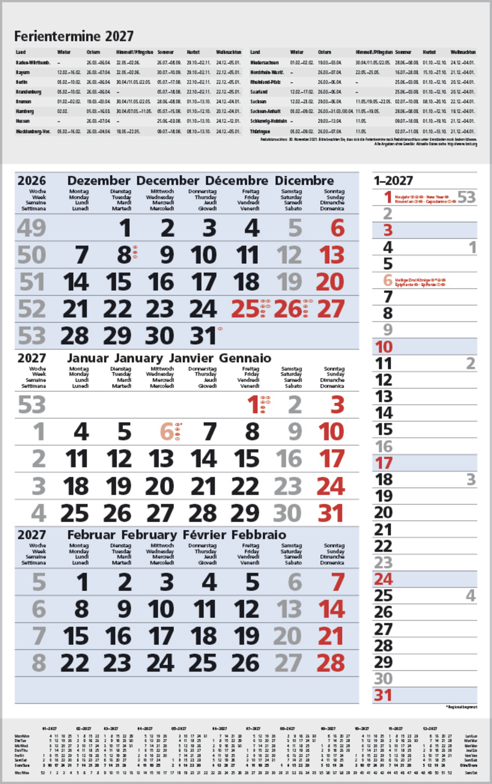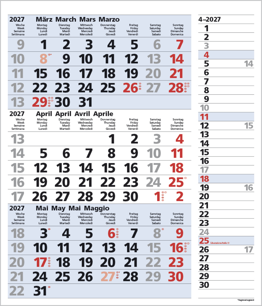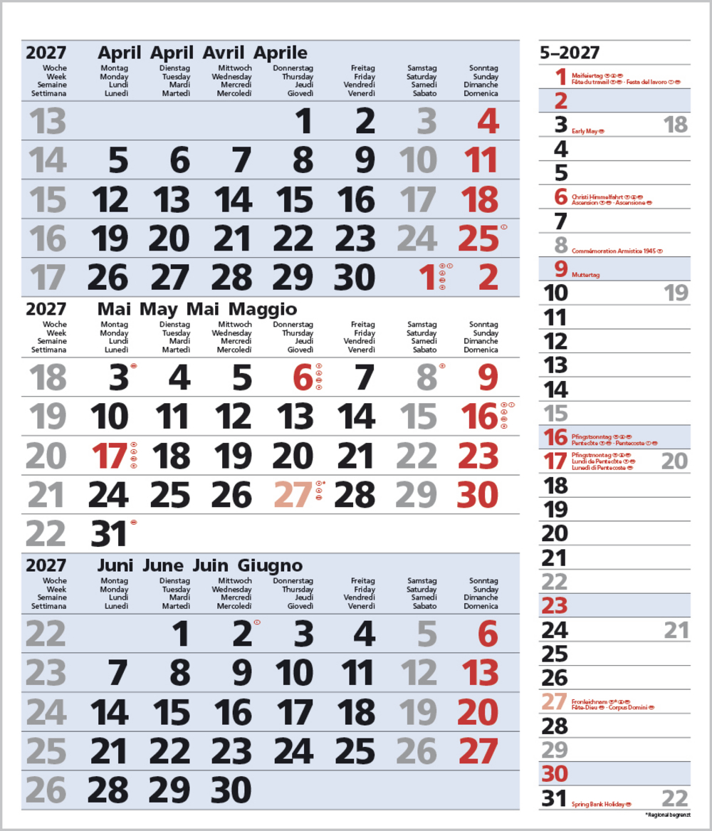 - Kalendarium auf D/E/F/I mit farblich hervorgehobenen Feiertagen für Deutschland, Österreich und Schweiz.