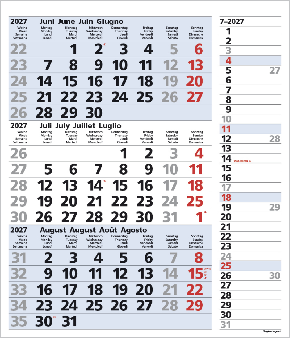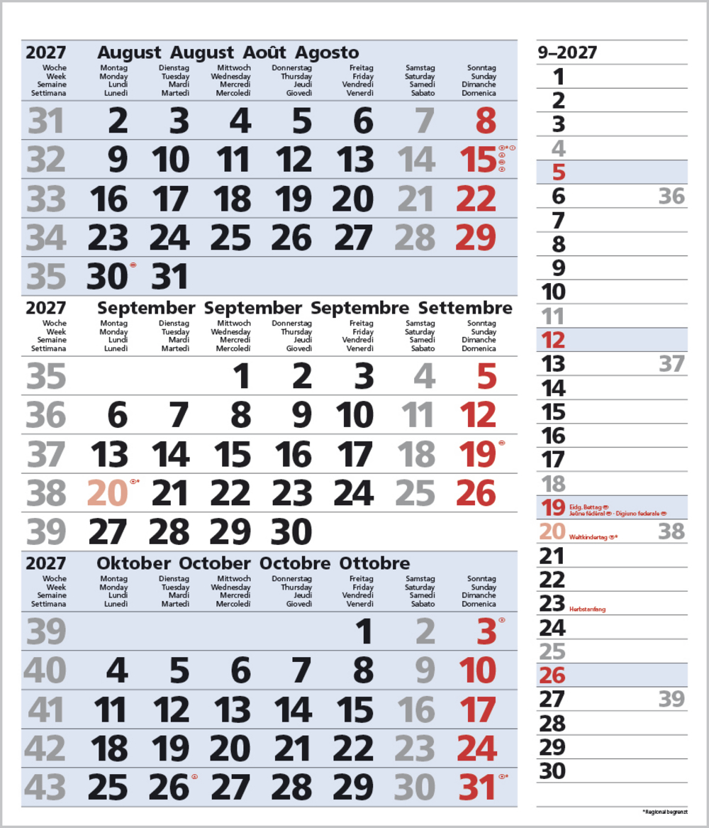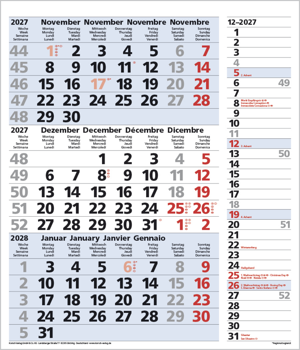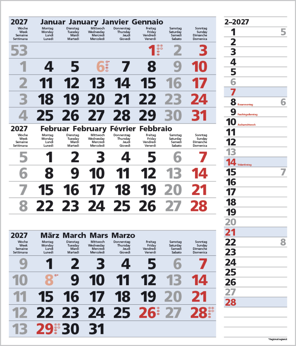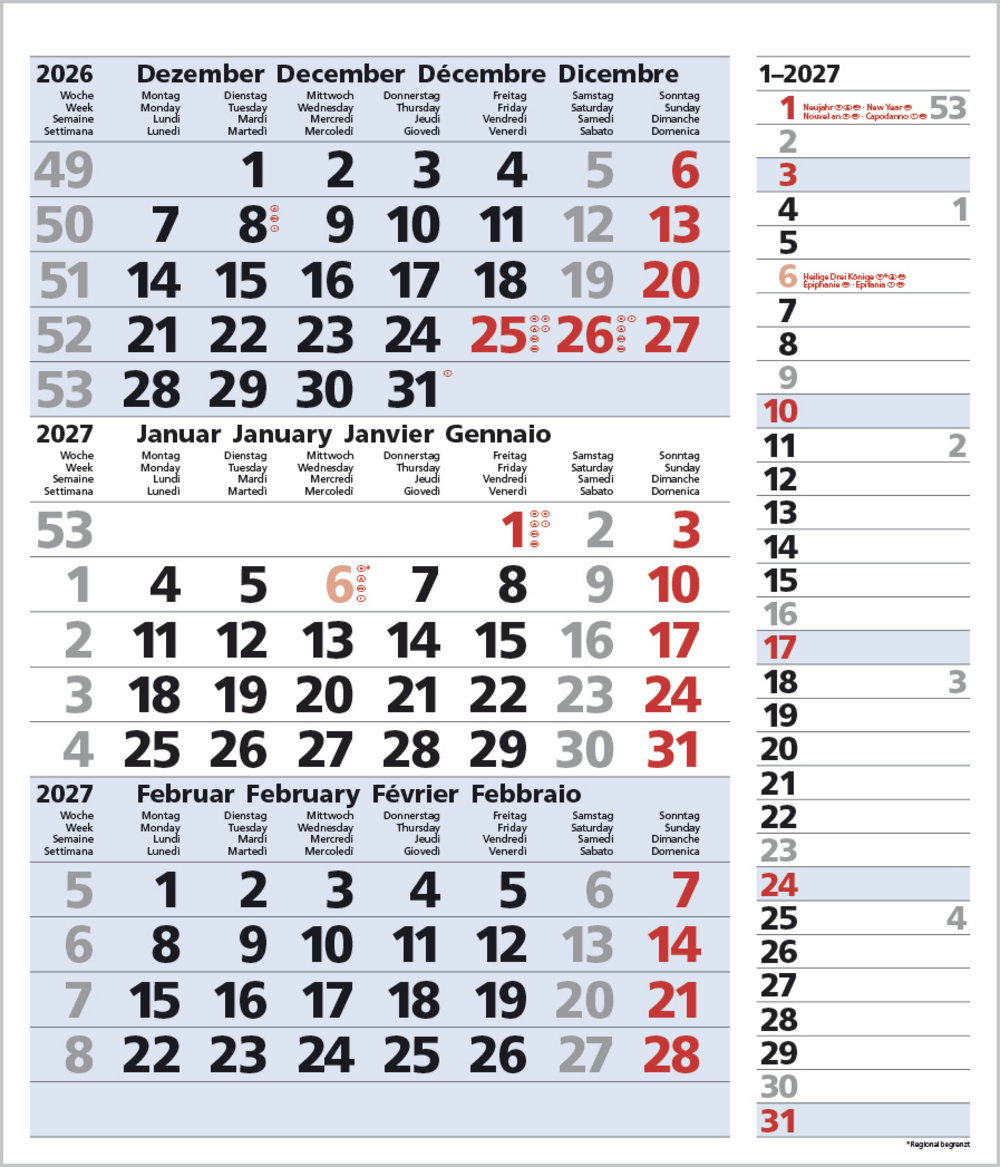 - Kalendarium auf D/E/F/I mit farblich hervorgehobenen Feiertagen für Deutschland, Österreich und Schweiz.