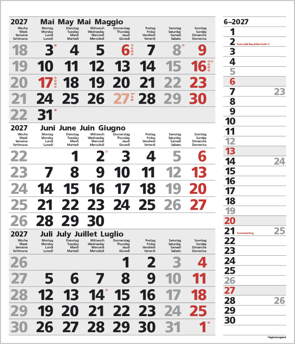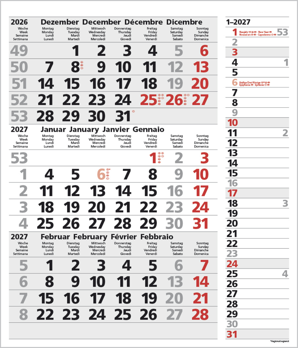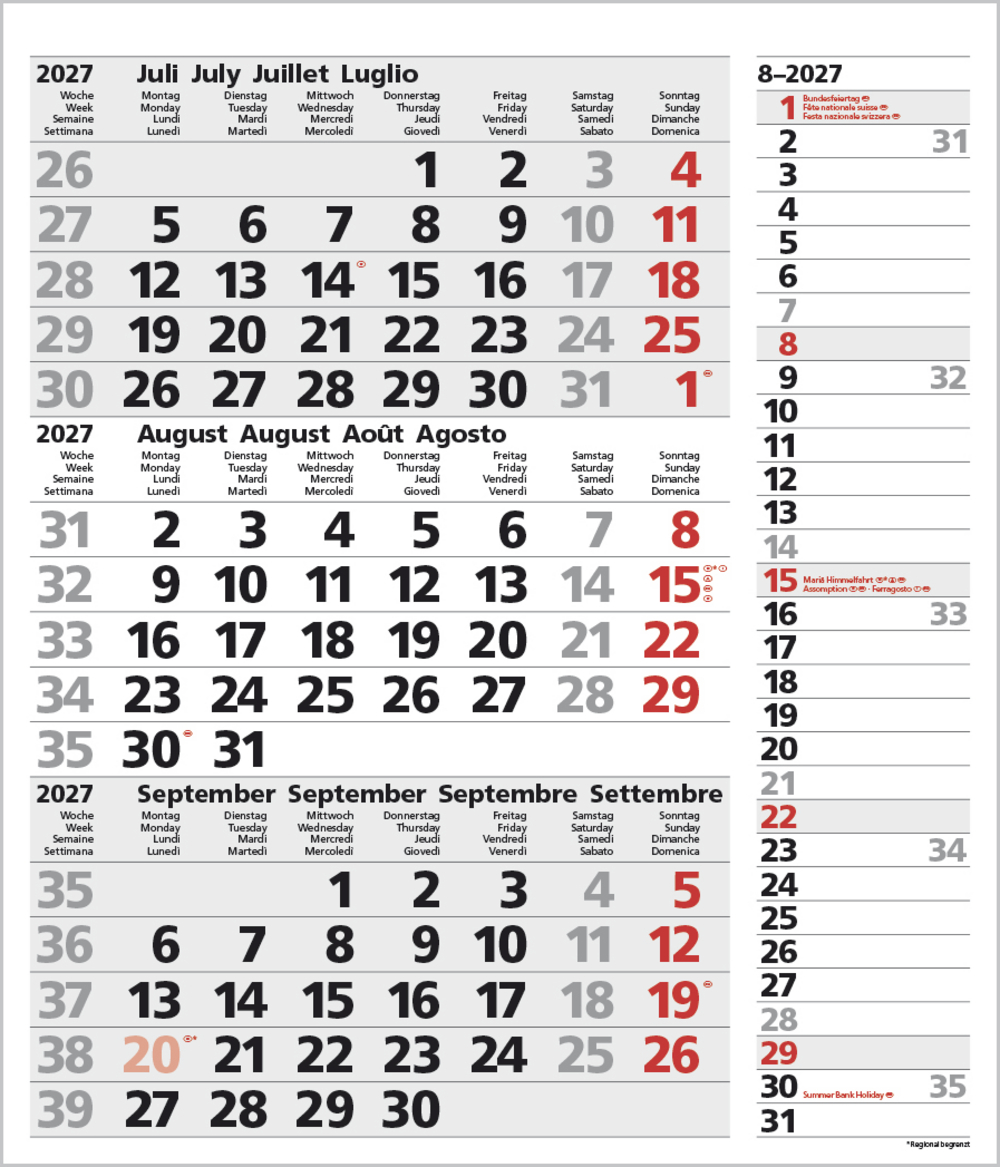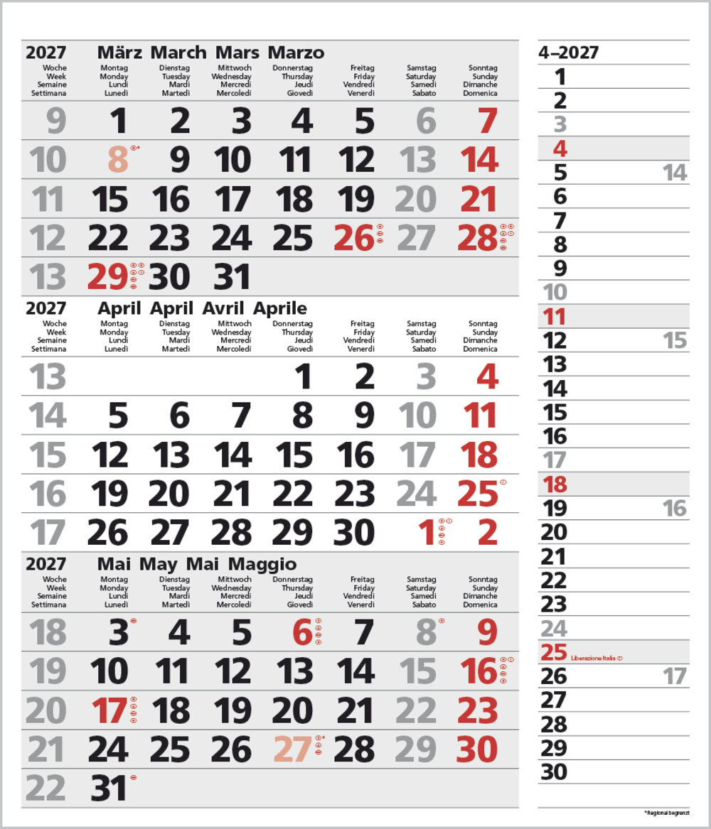 - Kalendarium auf D/E/F/I mit farblich hervorgehobenen Feiertagen für Deutschland, Österreich und Schweiz.