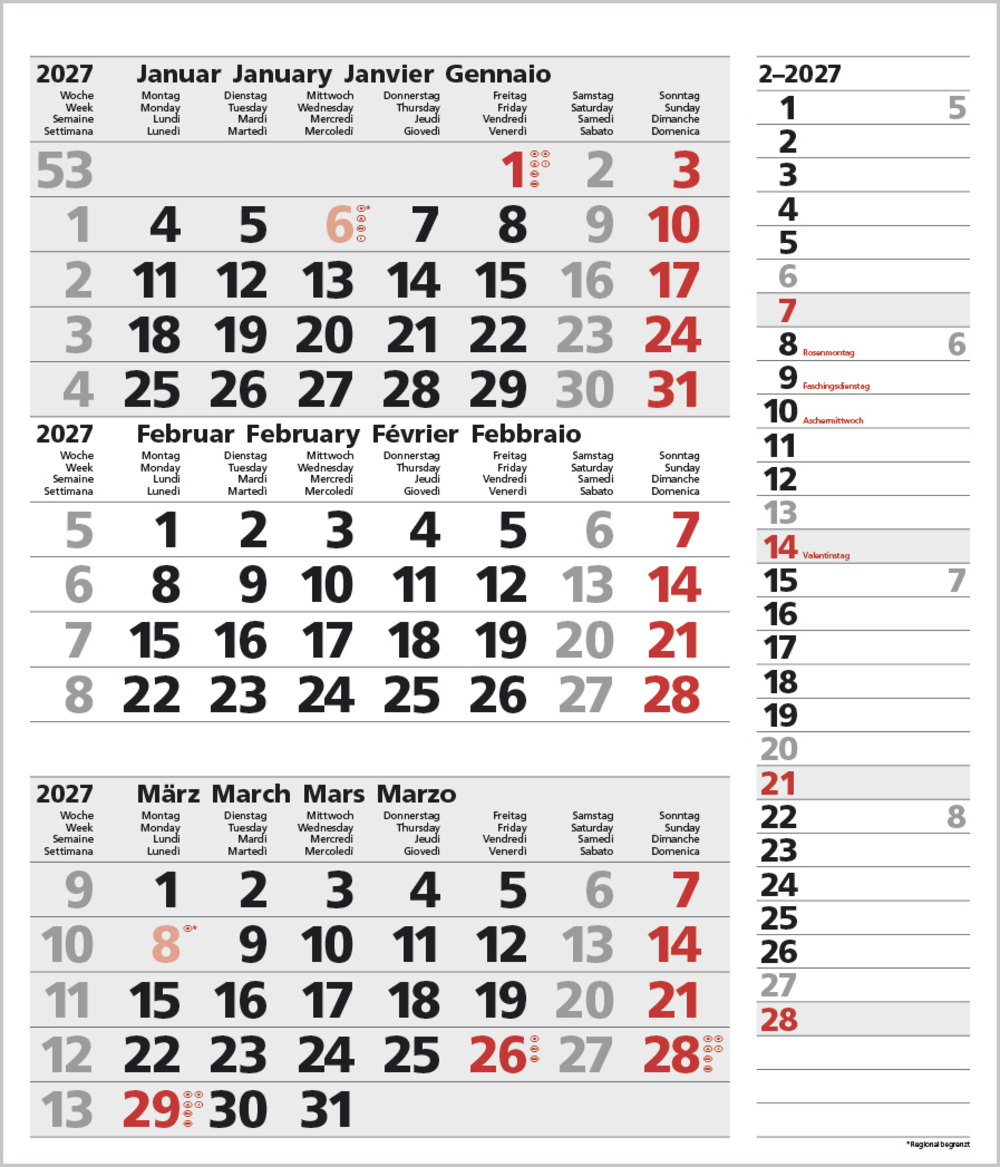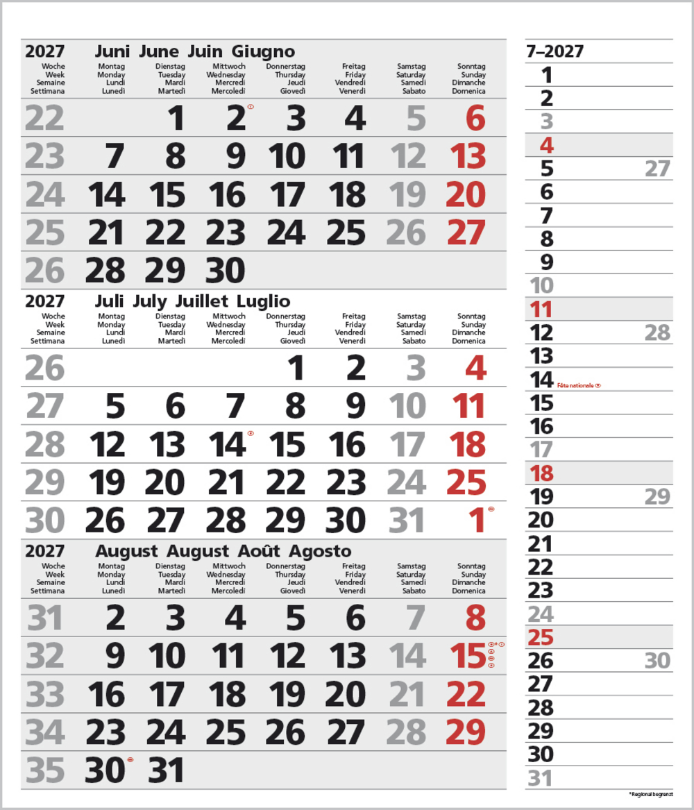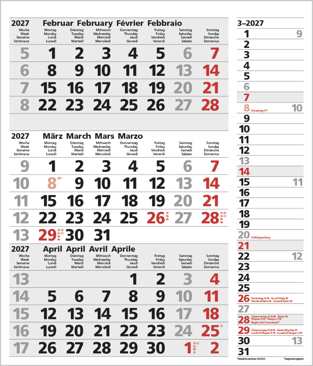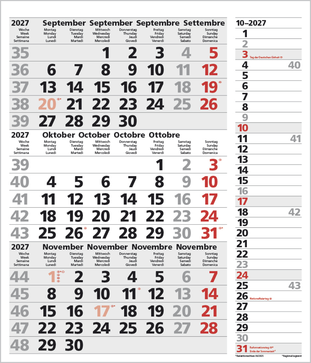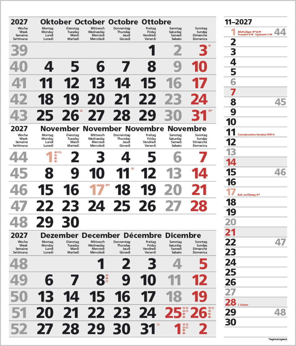 - Kalendarium auf D/E/F/I mit farblich hervorgehobenen Feiertagen für Deutschland, Österreich und Schweiz.