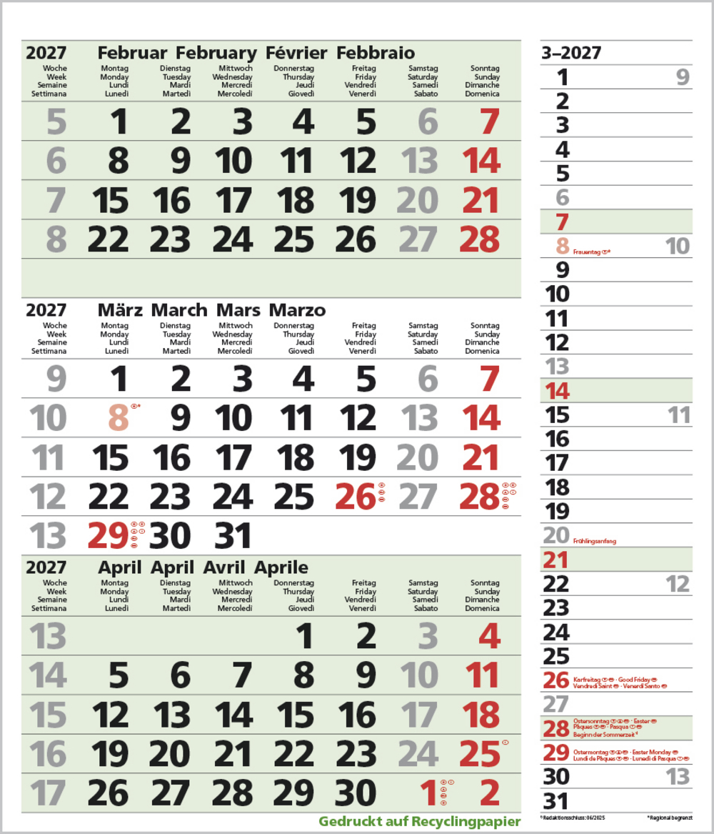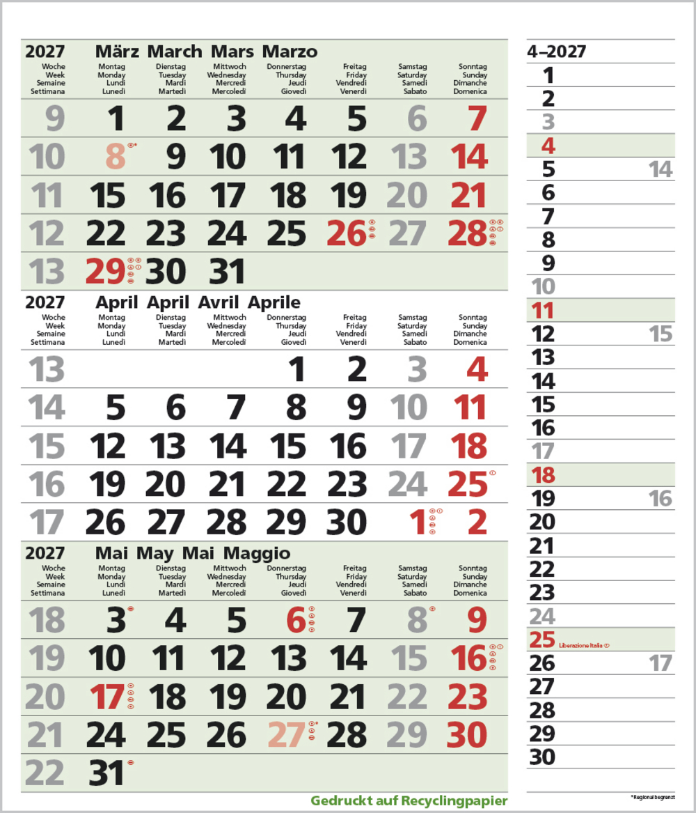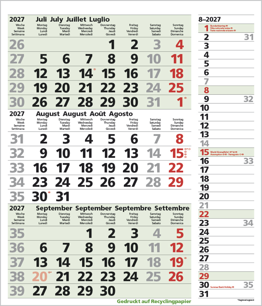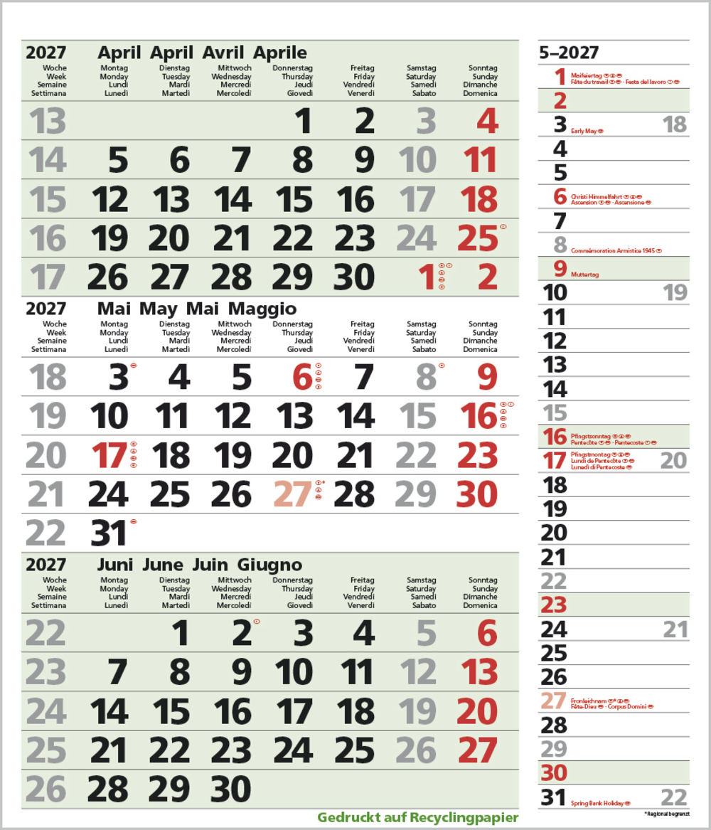 • Kalendarium auf D/E/F/I mit farblich hervorgehobenen Feiertagen für Deutschland, Österreich und Schweiz.