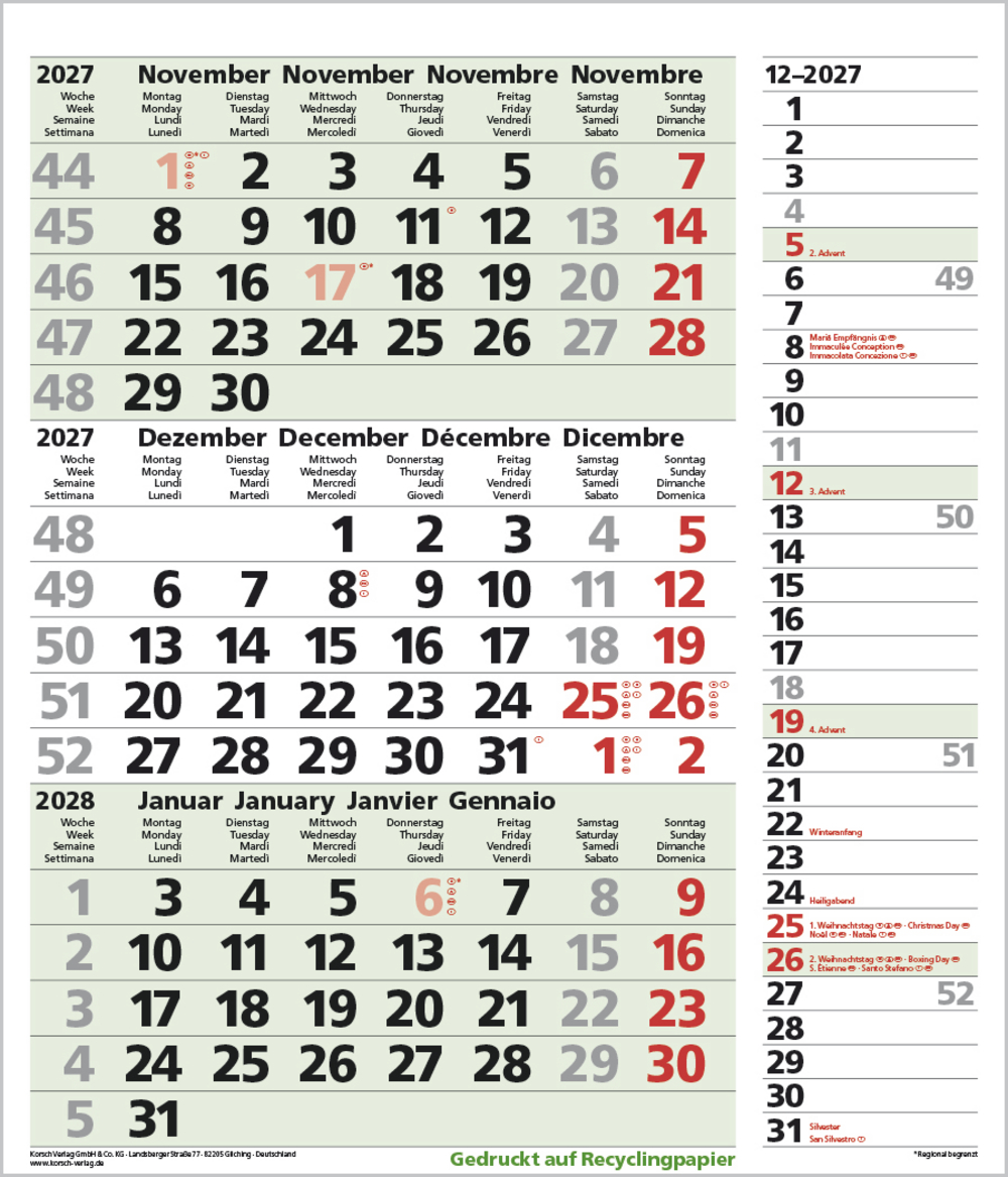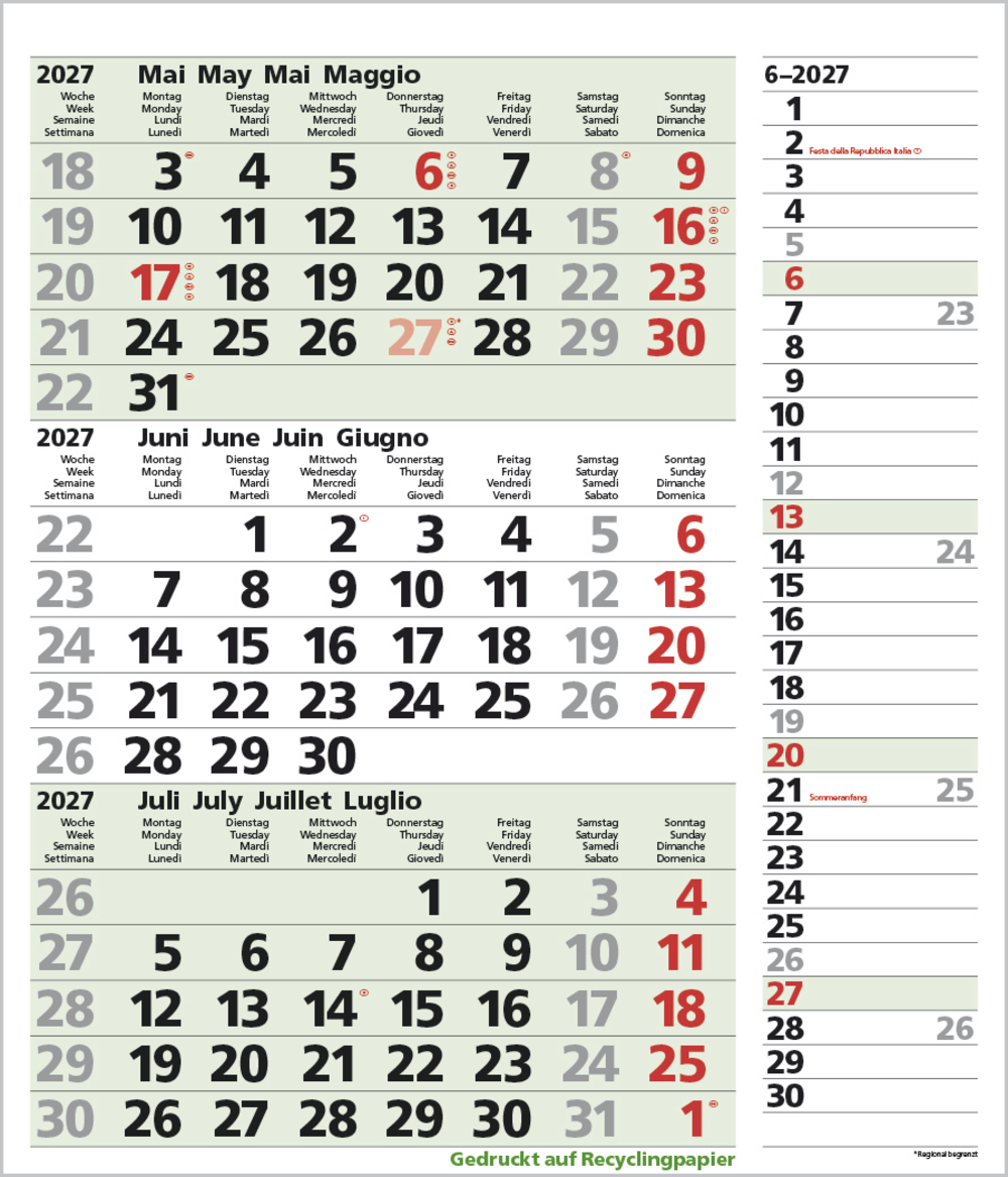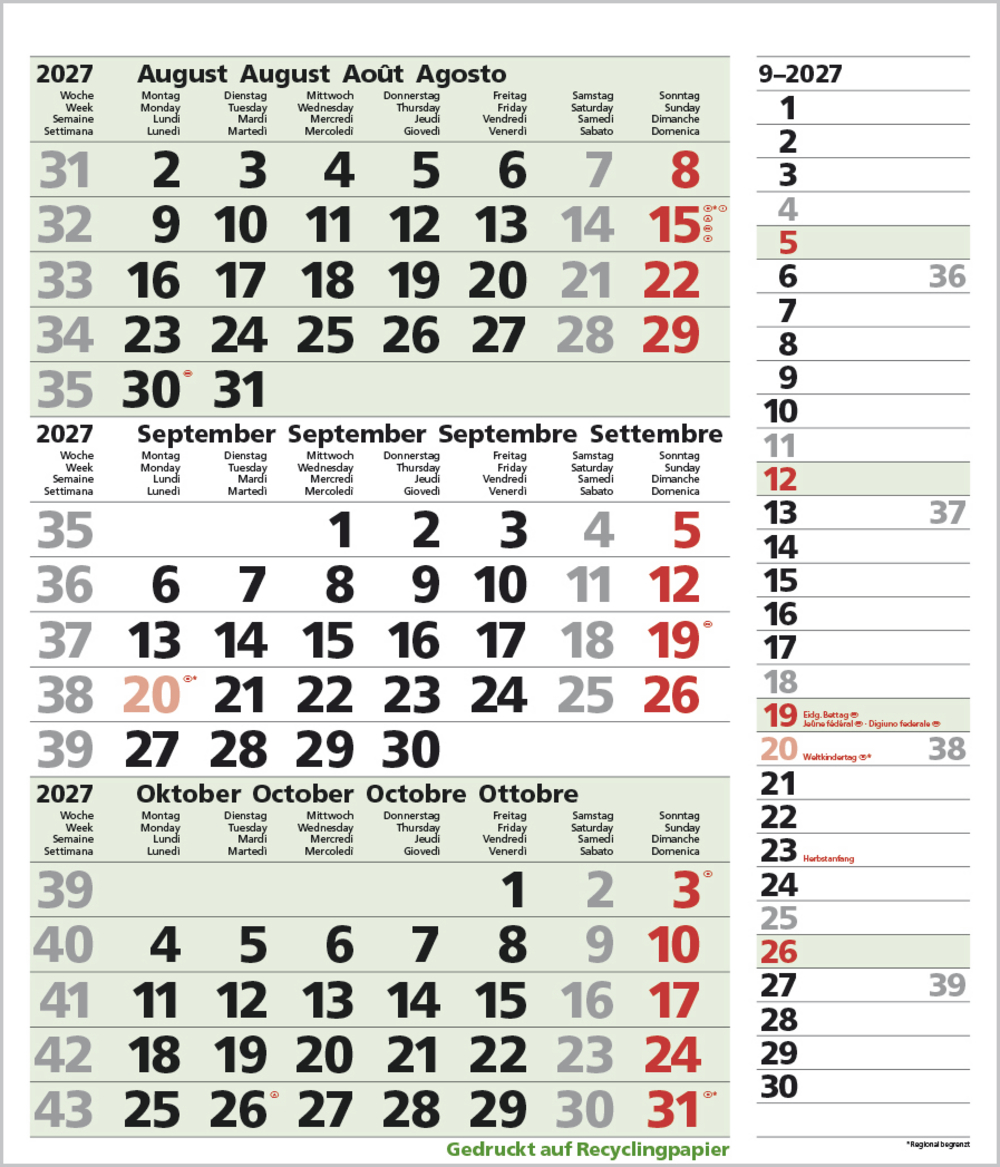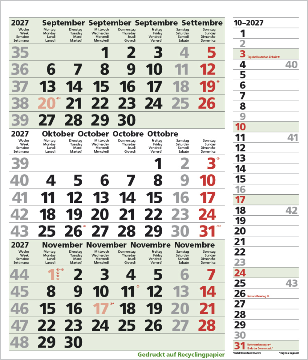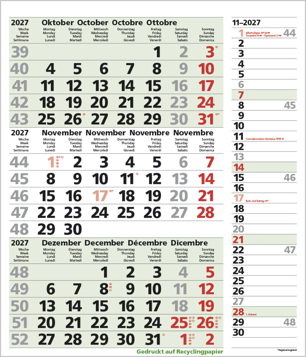 • Kalendarium auf D/E/F/I mit farblich hervorgehobenen Feiertagen für Deutschland, Österreich und Schweiz.