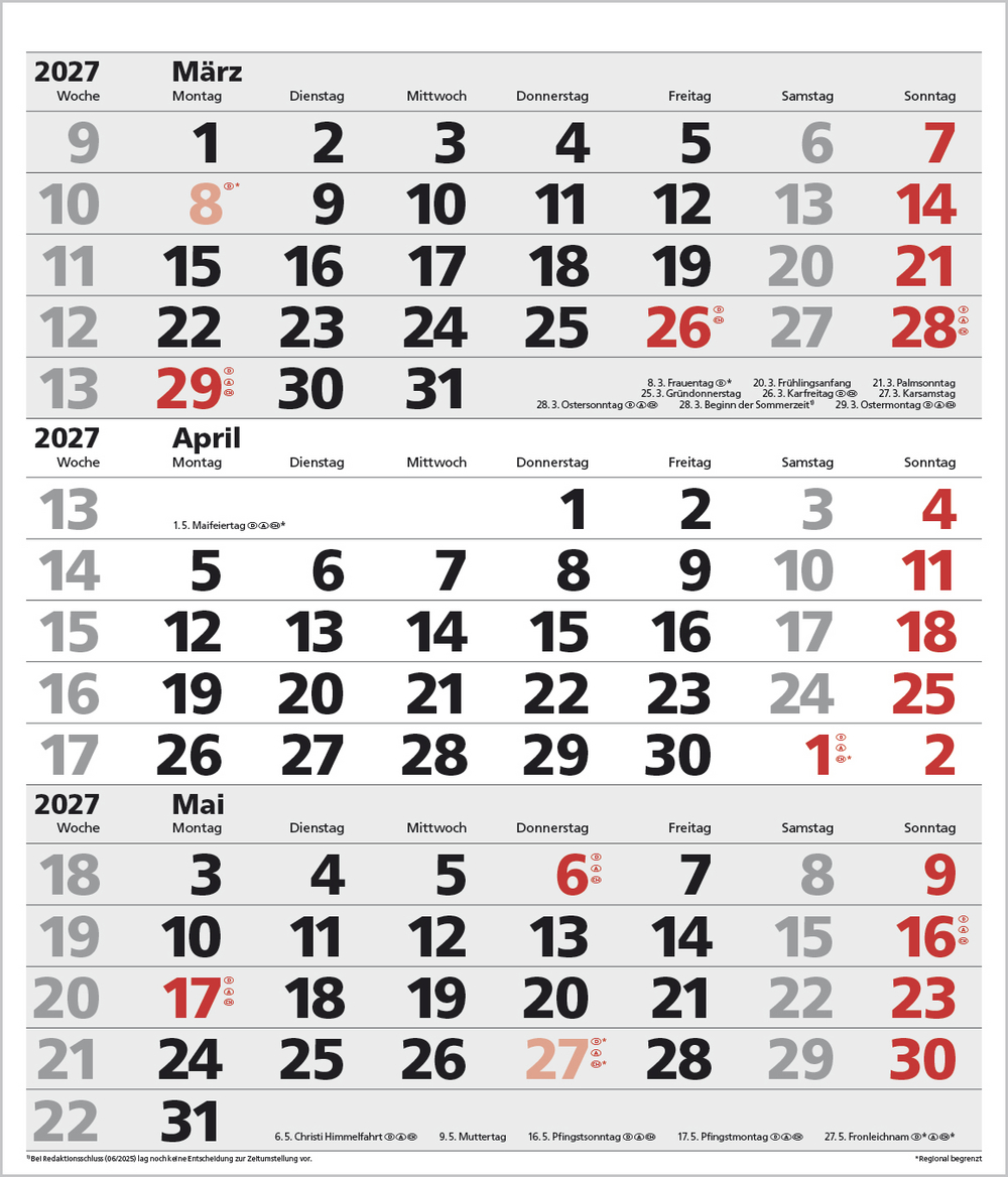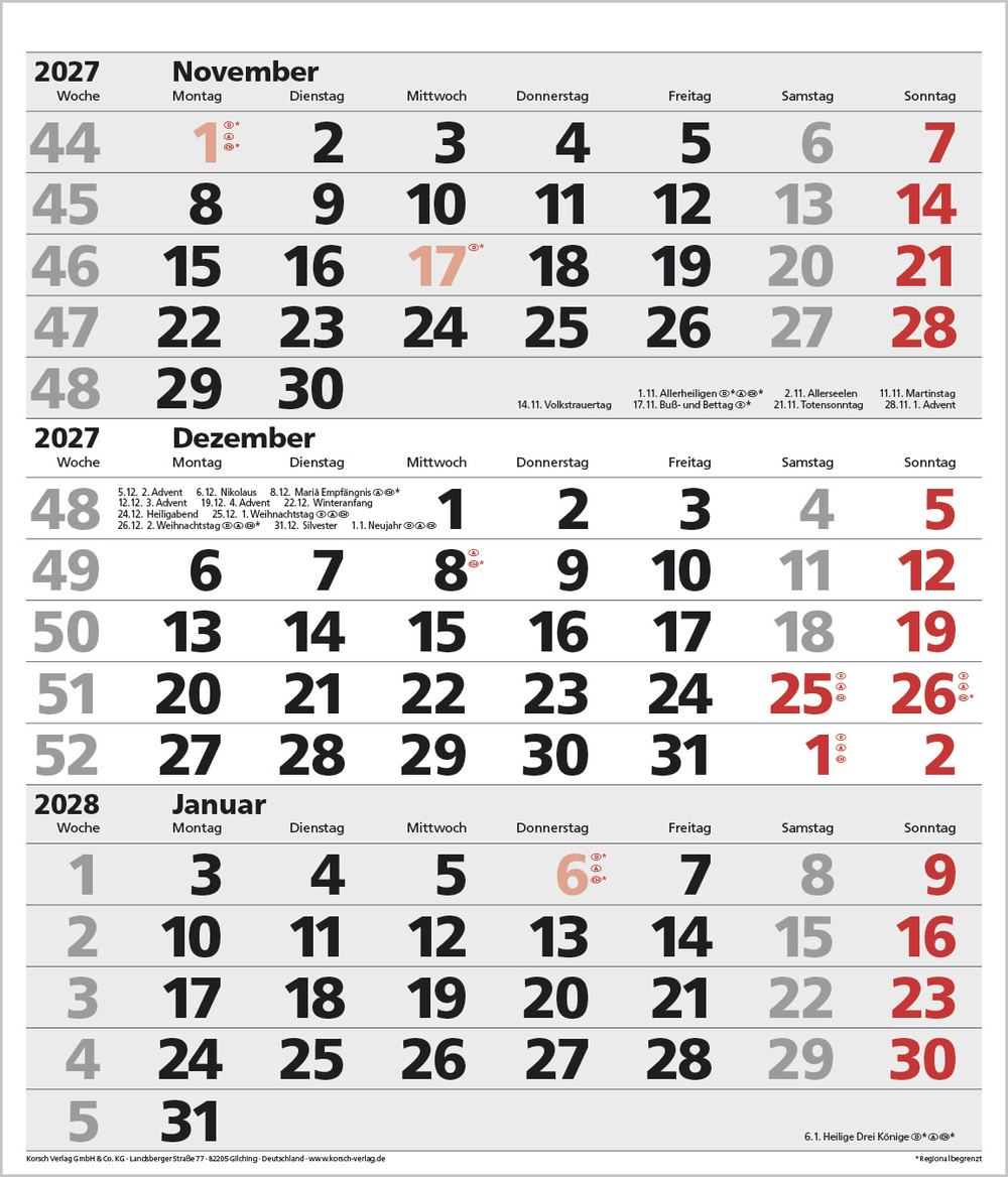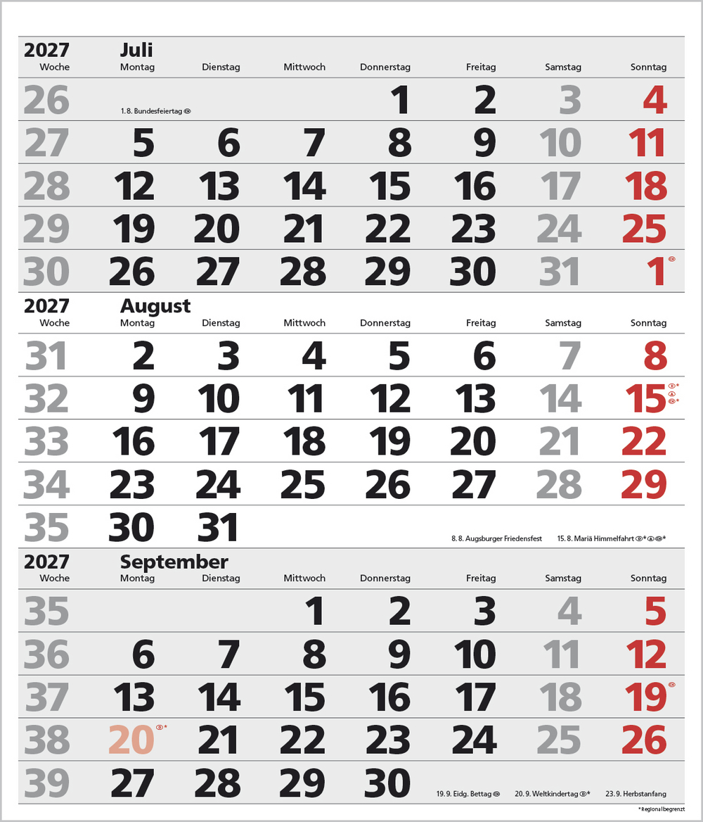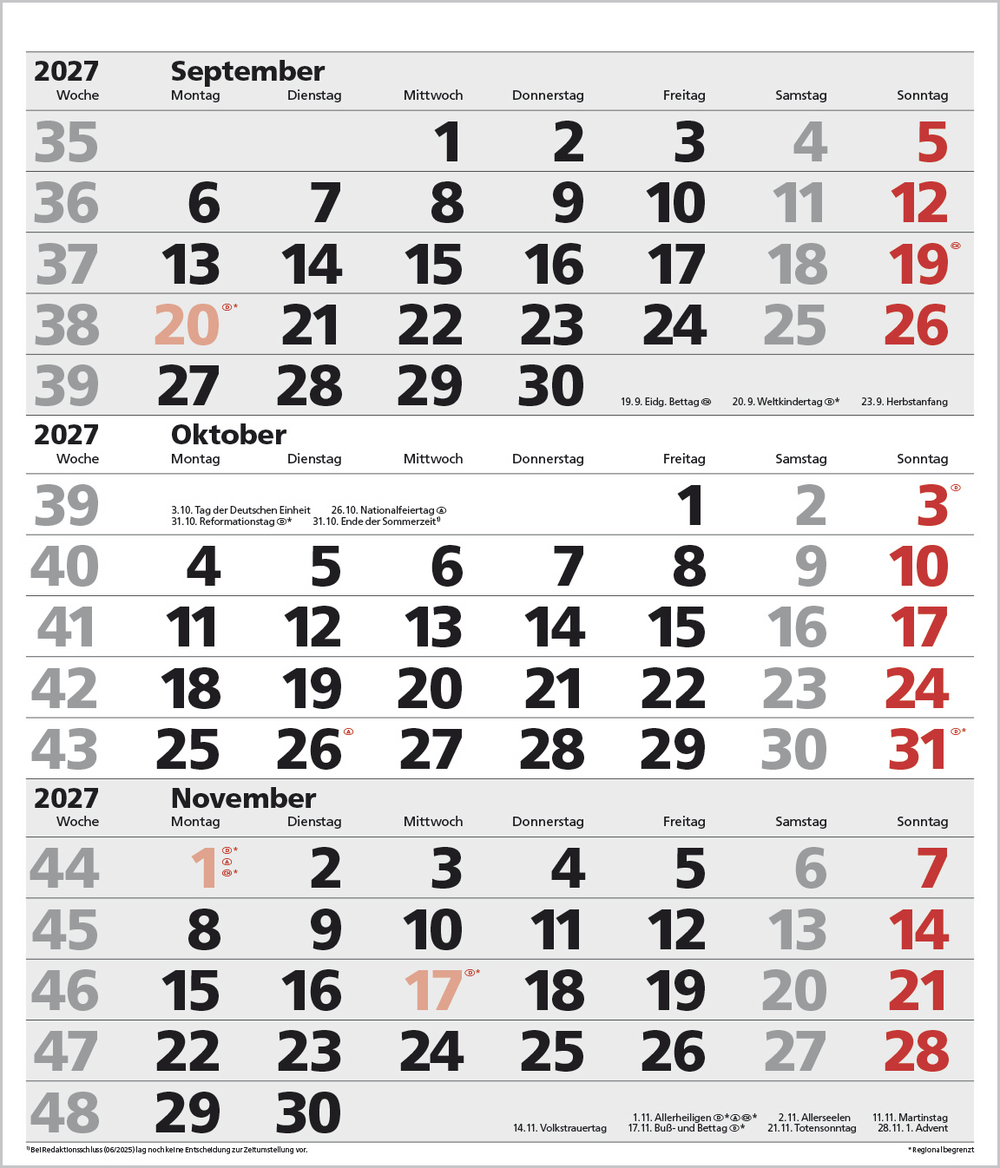 • Kalendarium auf D/E/F/I mit farblich hervorgehobenen Feiertagen für Deutschland, Österreich und Schweiz.