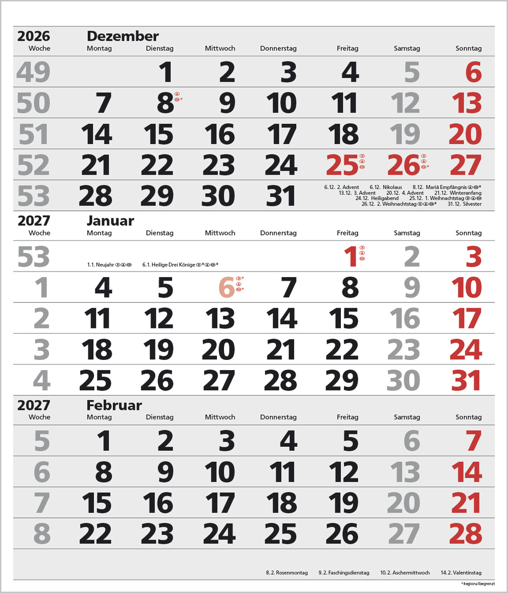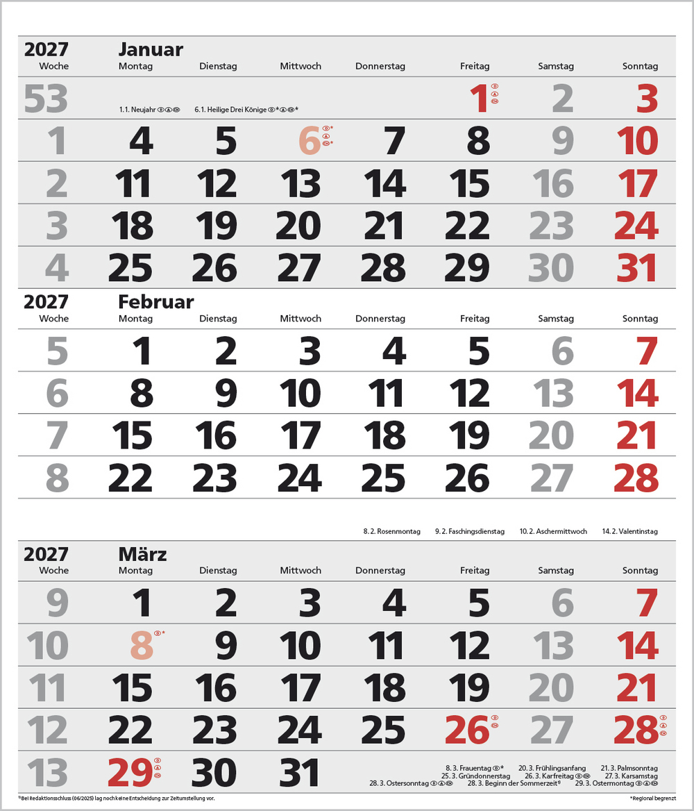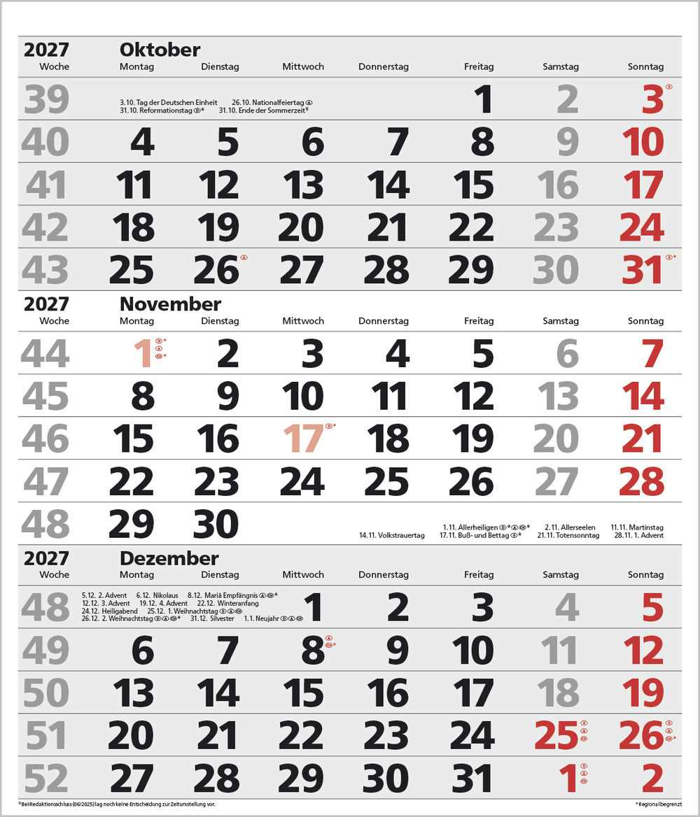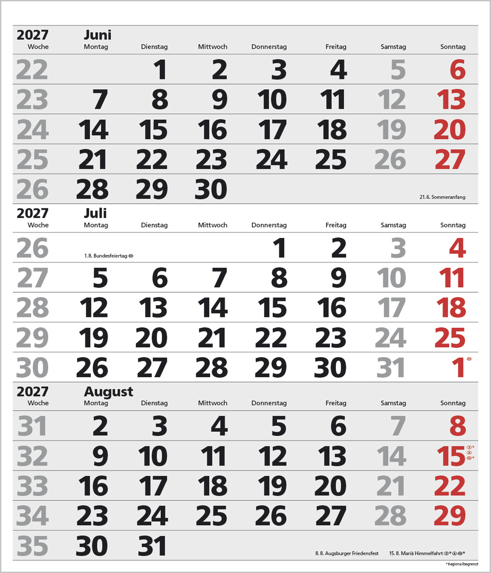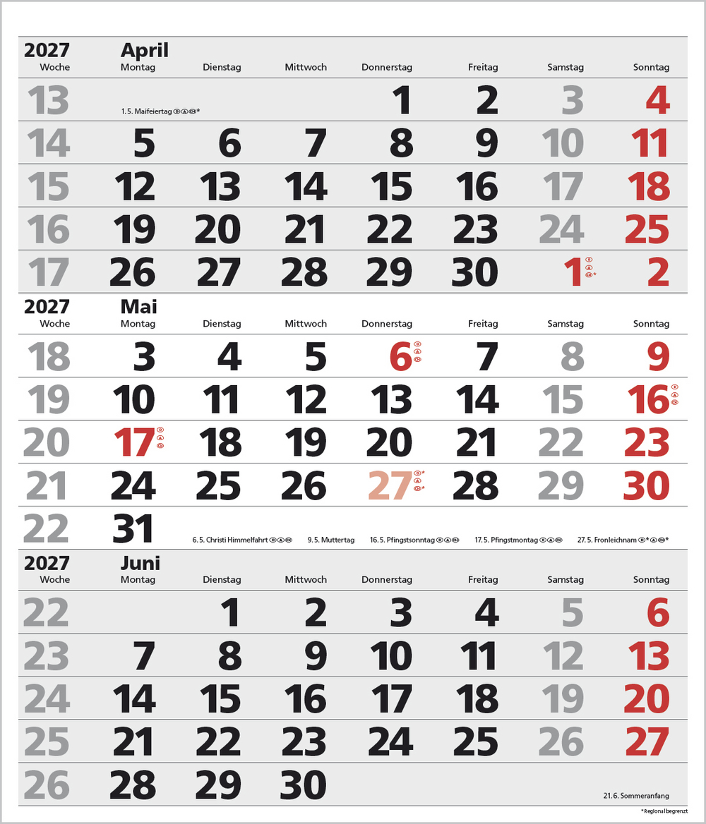 • Kalendarium auf D/E/F/I mit farblich hervorgehobenen Feiertagen für Deutschland, Österreich und Schweiz.