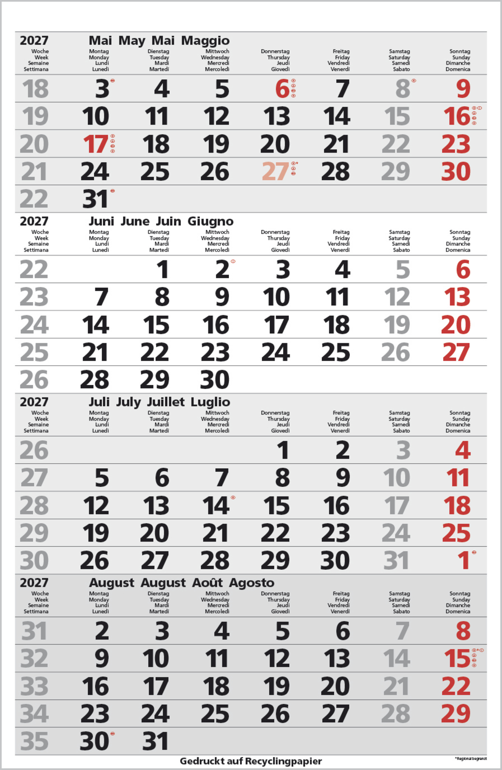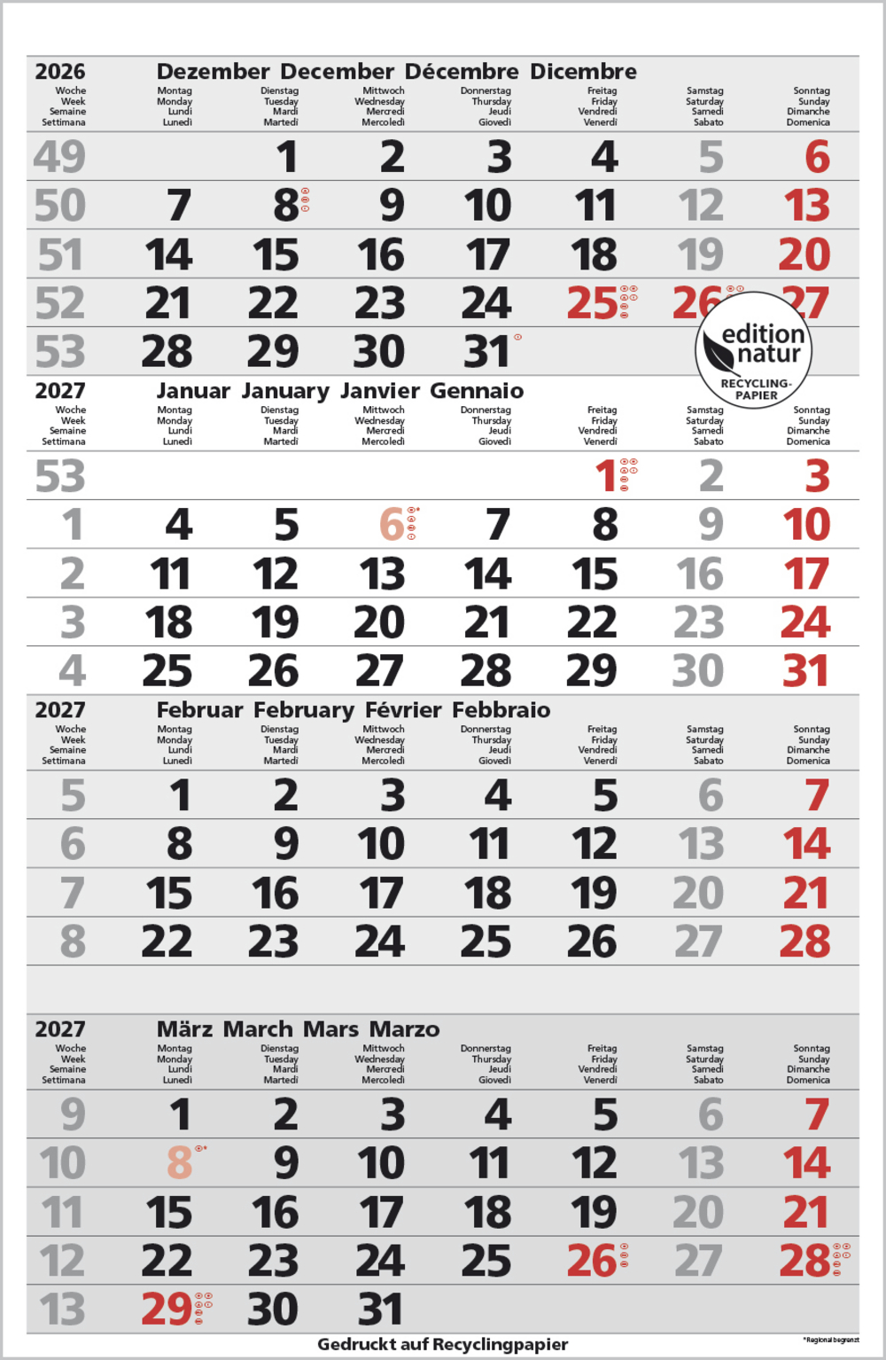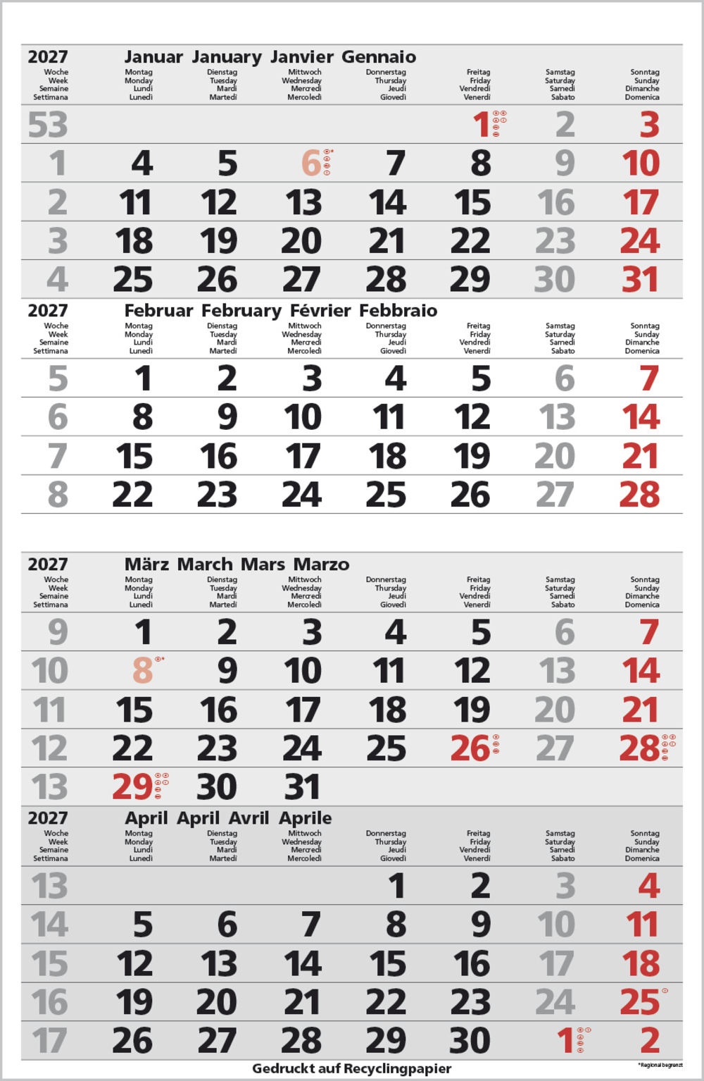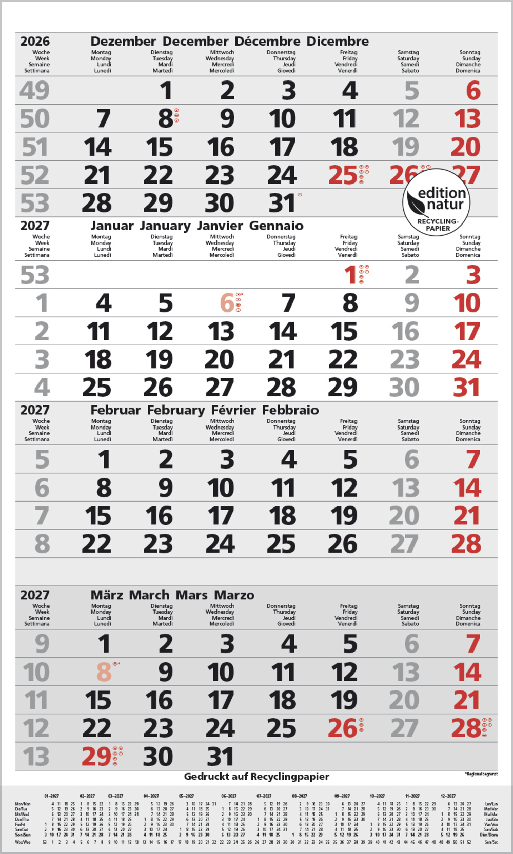 - Kalendarium auf D/E/F/I mit farblich hervorgehobenen Feiertagen für Deutschland, Österreich und Schweiz
