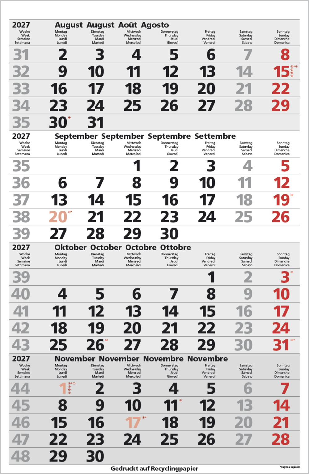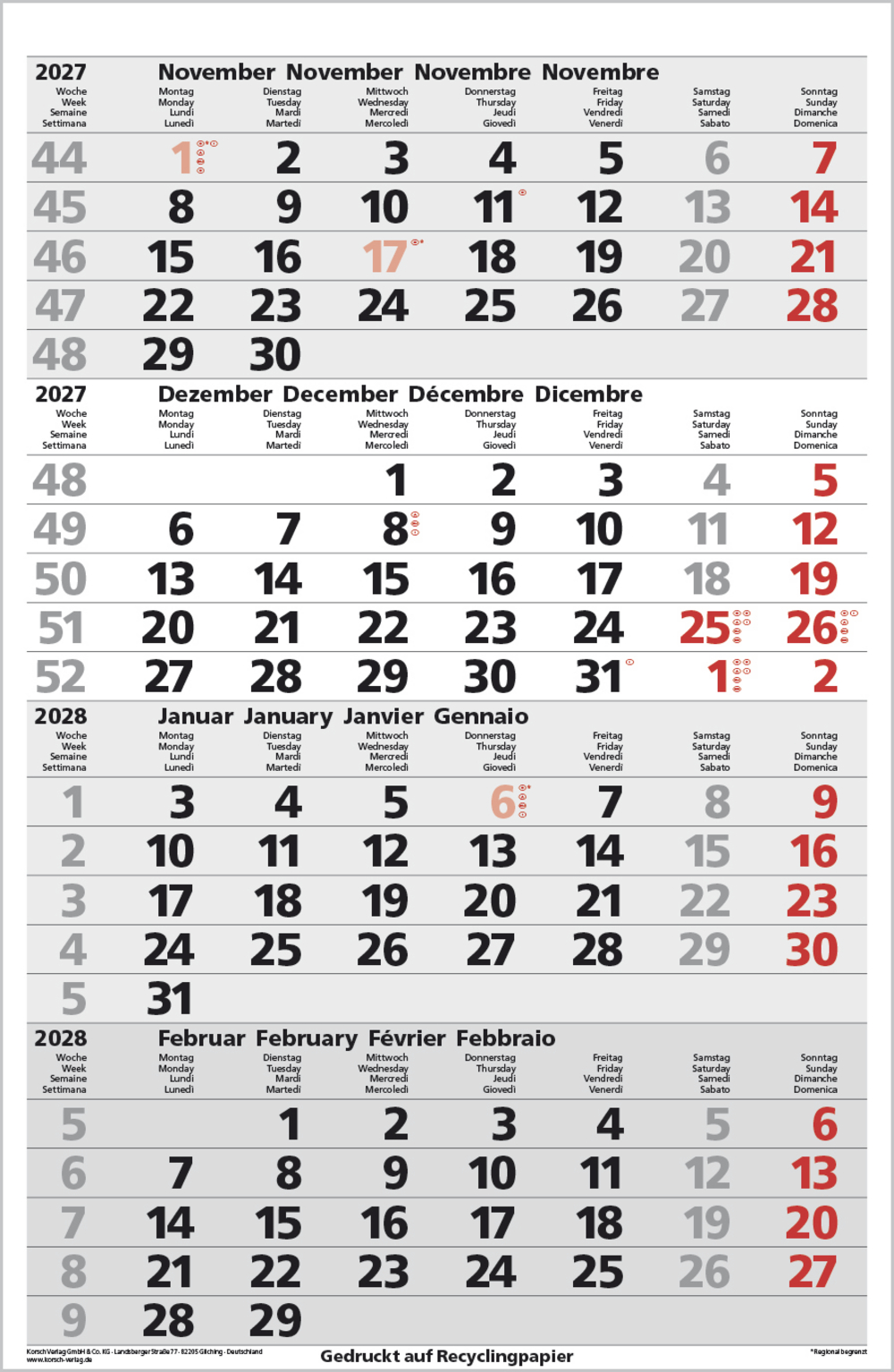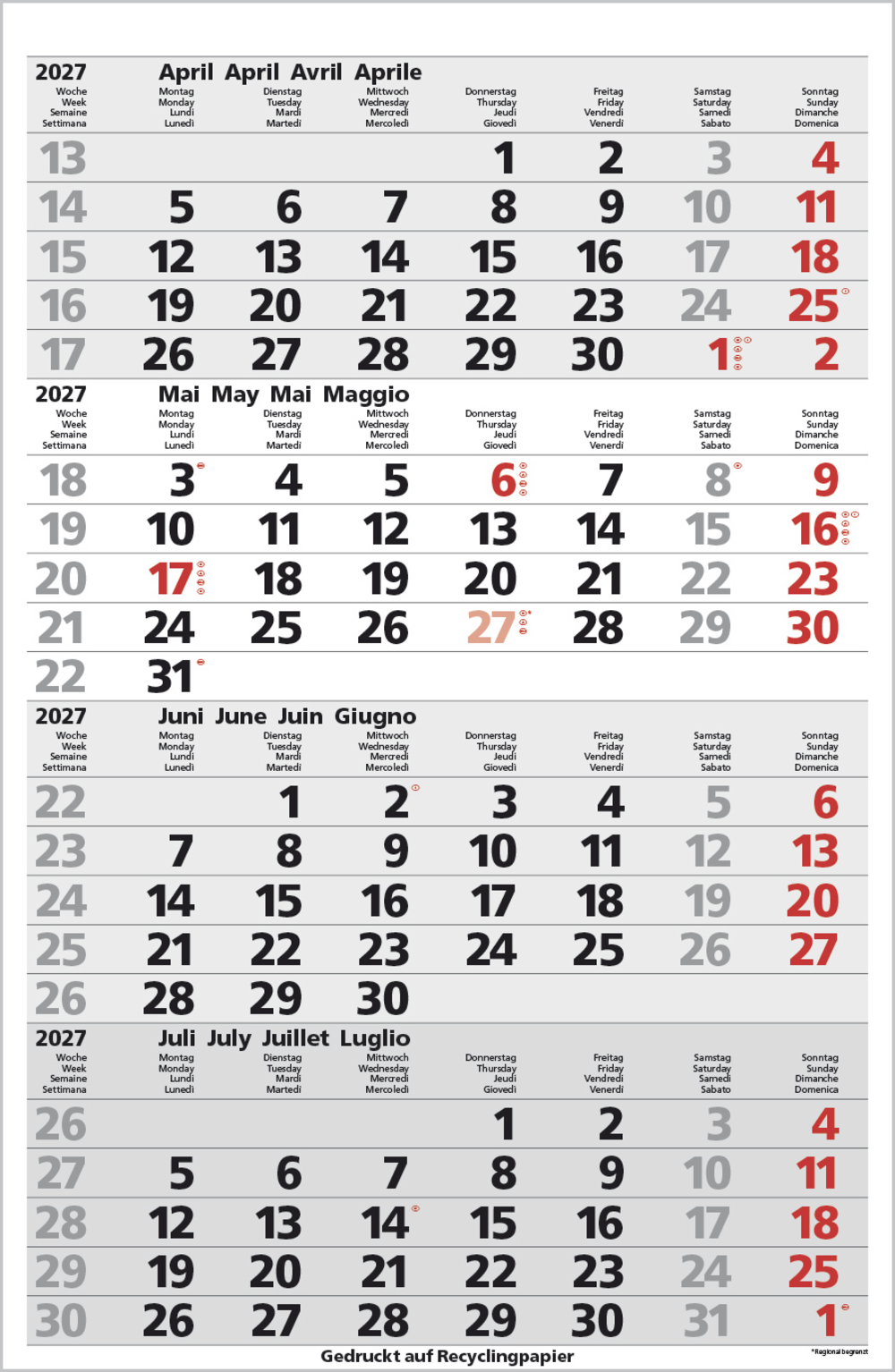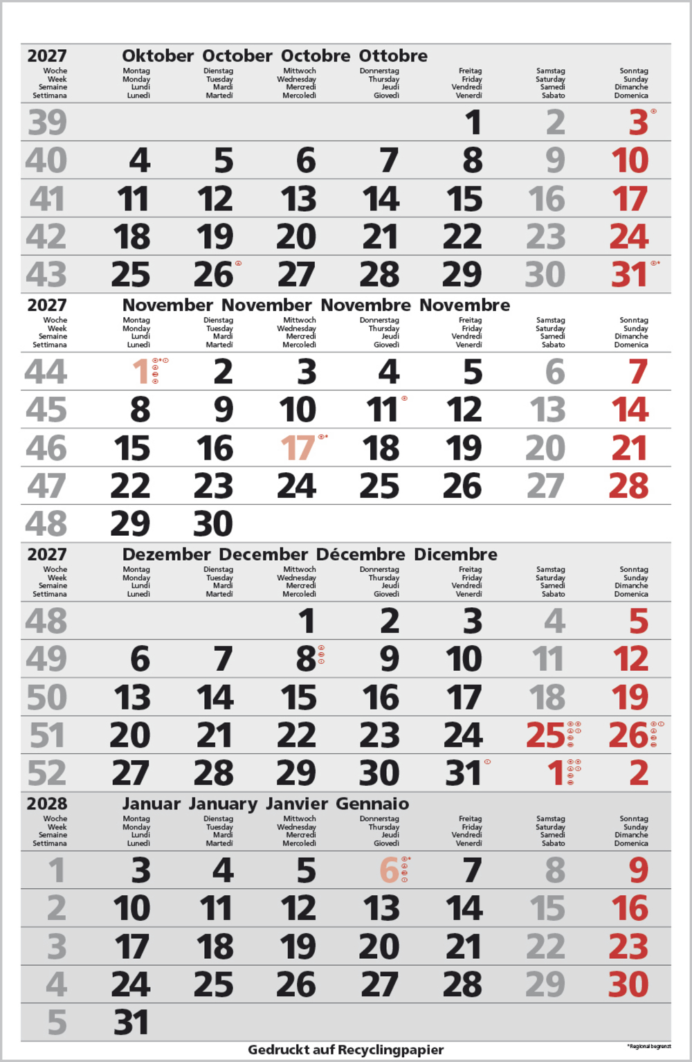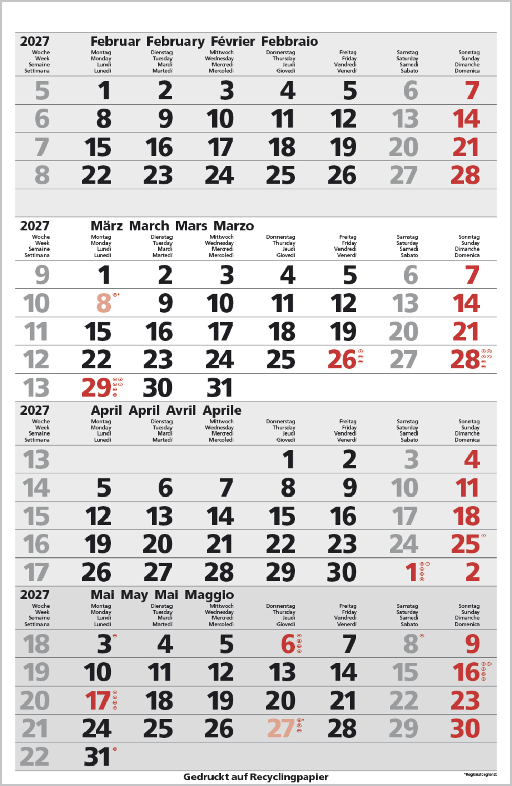 - Kalendarium auf D/E/F/I mit farblich hervorgehobenen Feiertagen für Deutschland, Österreich und Schweiz