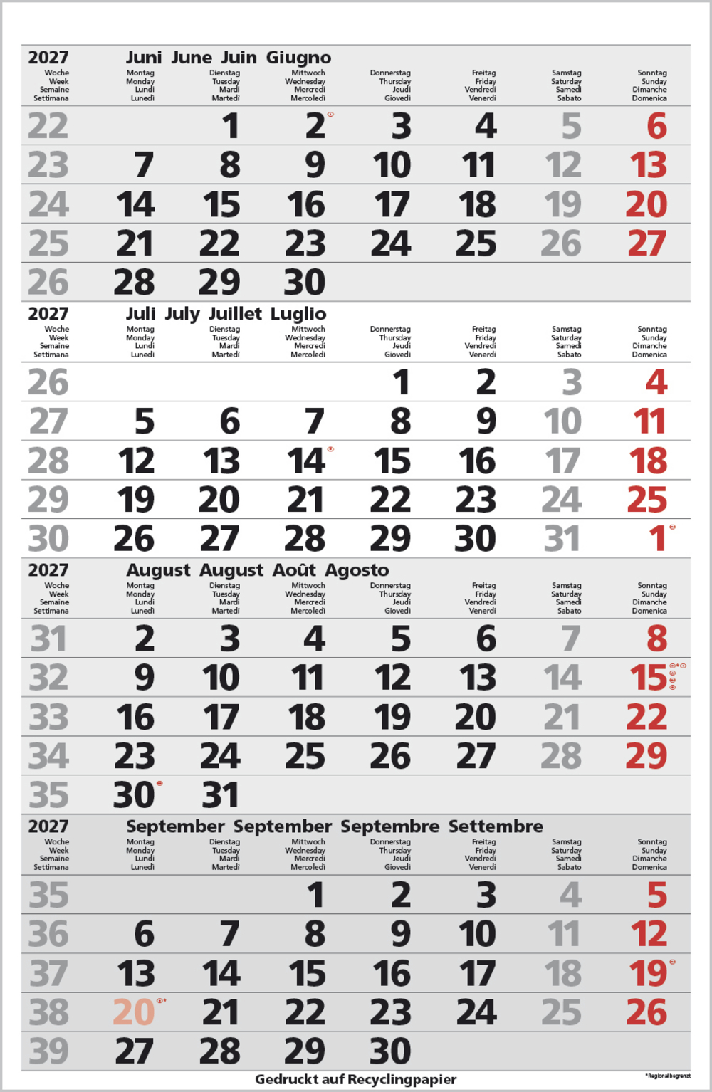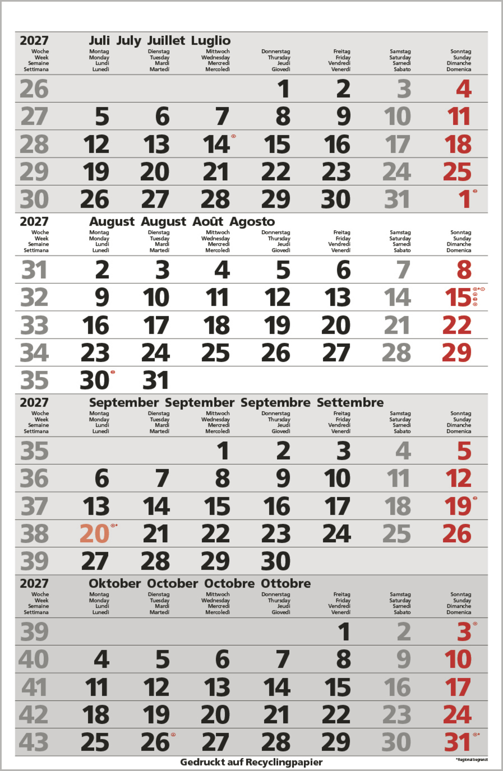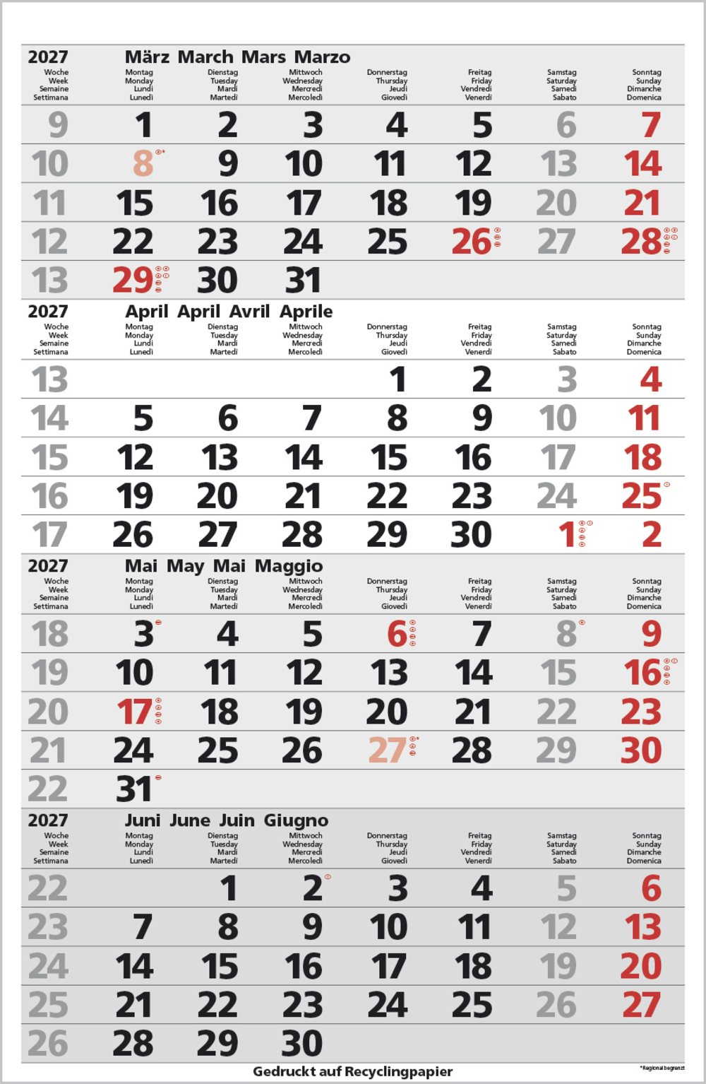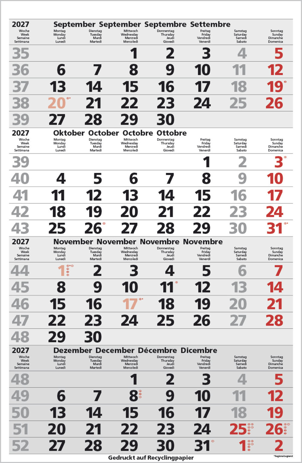 - Kalendarium auf D/E/F/I mit farblich hervorgehobenen Feiertagen für Deutschland, Österreich und Schweiz