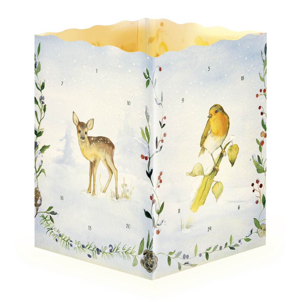 24 Türchen verbergen weitere Tiere und Details aus Wald und Wiese und bieten so eine wunderbare Entdeckungsreise in das Reich der winterlichen Natur. Besonders stimmungsvoll ist diese Reise mit einem Teelicht, das die Landschaft immer mehr zum Erleuchten bringt.
