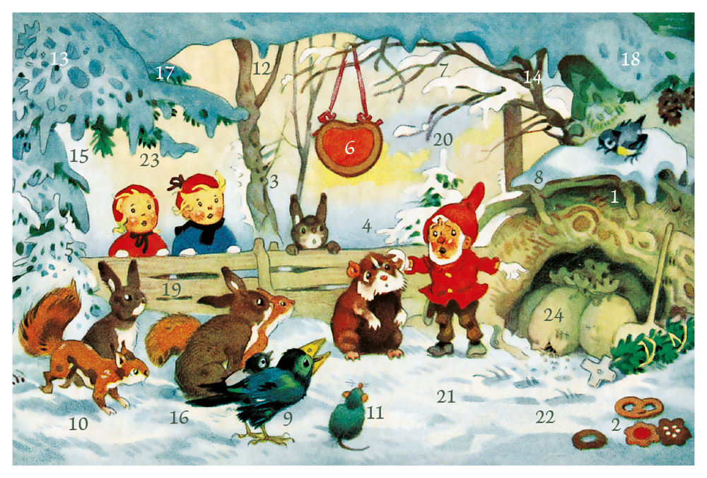 Mit seinen liebreizenden und farbenfroh inszenierten Wichtel- und Kinderillustrationen erschuf Fritz Baumgarten (1883–1966) eine fröhliche Weihnachtswelt, wie man sie sich nicht schöner vorstellen kann und die sich uns heute, Jahrzehnte später, als wahrer nostalgischer Schatz präsentiert. Diese zauberhaften Adventskalender-Karten sind zart mit Silberglimmer bestreut und wecken 24 Tage lang längst vergessene Erinnerungen an die Kindheit und ein wahres Gefühl der Vorfreude. Exklusiv bei Korsch!