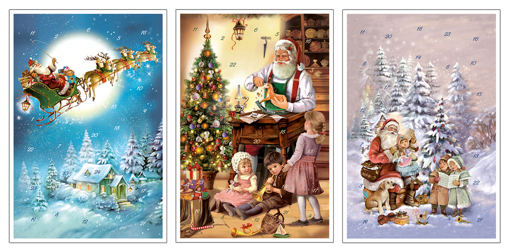 Beim Anblick dieser zauberhaft nostalgischen Adventskalender-Karten kann man schon mal ins Träumen geraten und dem Weihnachtsmann bei seinen zahlreichen Vorbereitungen über die Schulter schauen. Vom Anfertigen der Geschenke bis hin zu deren Auslieferung – dieser fleißige Mann hat alle Hände voll zu tun, um pünktlich zum Weihnachtsfest alle Herzenswünsche zu erfüllen. Ob als lieber Weihnachtsgruß oder Geschenk an sich selbst, diese Adventskalender-Karten steigern 24 Tage lang die Vorfreude auf das große Fest und entführen mit ihren romantischen Farbinszenierungen und Motiven in die traumhafte Welt der Nostalgie.