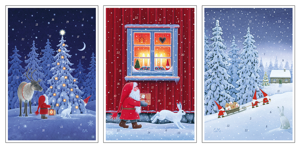 In träumerischen Winterlandschaften sind die Weihnachtswichtel »Tomte« unterwegs mit ihren tierischen Freunden. Gemeinsam genießen sie die Ruhe, tollen durch den Schnee und bereiten sich auf das Weihnachtsfest vor – aber auch für allerlei Schabernack sind die Wichtel zu haben. 24 Türchen überraschen jeden Tag mit liebevollen Details. Ob zum Verschicken oder für den eigenen Schreibtisch: Die britisch-schwedische Künstlerin Eva Melhuish versüßt mit ihren stimmungsvollen Illustrationen das weihnachtliche Warten für Groß und Klein.