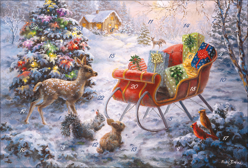 Nicky Boehmes romantische Illustrationen entführen in eine idyllische und friedvolle Weihnachtswelt. Umhüllt von dramatischem Licht und zarten, schwingenden Farben vermitteln sie ein Gefühl der Behaglichkeit und versprechen zugleich das Erlebnis eines unvergesslichen Winterabenteuers. Wie ein kleines Gemälde schmücken ihre Adventskalender-Karten daher den Raum und halten bis zum großen Fest täglich eine weihnachtlich illustrierte Überraschung hinter den 24 Türchen bereit. Exklusiv bei Korsch!