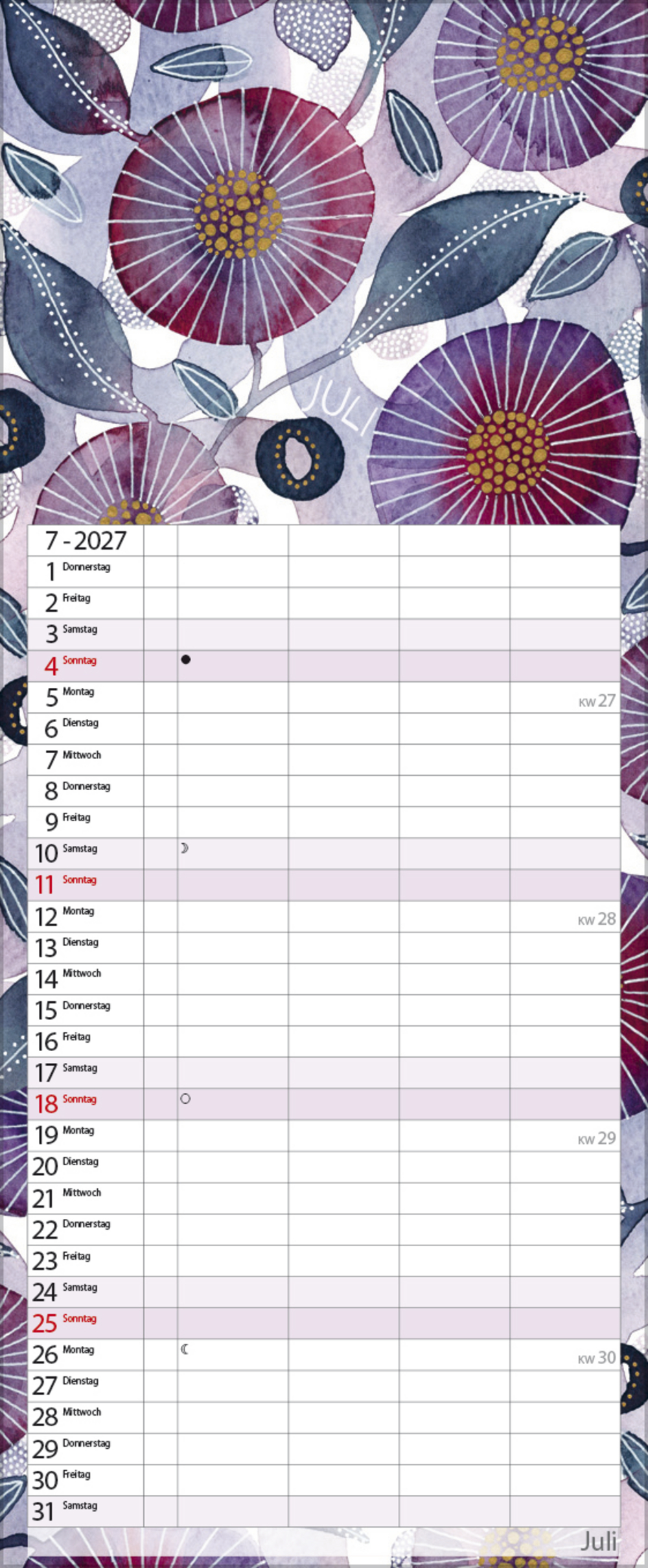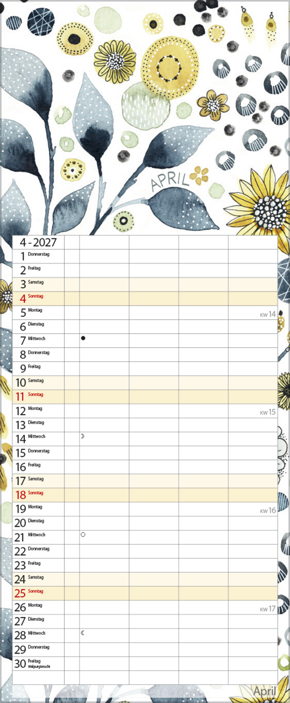 Die edlen Aquarellmotive der Künstlerin Kate von Essoldo Design machen das Planen zur Lieblingsbeschäftigung! Ob zarte Blüten, stimmungsvolle Meeresmotive oder elegante Herbstblätter – dieser Kalender bringt nicht nur zauberhafte Aquarellkunst perfekt zur Geltung, sondern bietet mit 4 Planungsspalten plus Müllspalte auch genügend Platz, um alles Wichtige im Blick zu behalten.