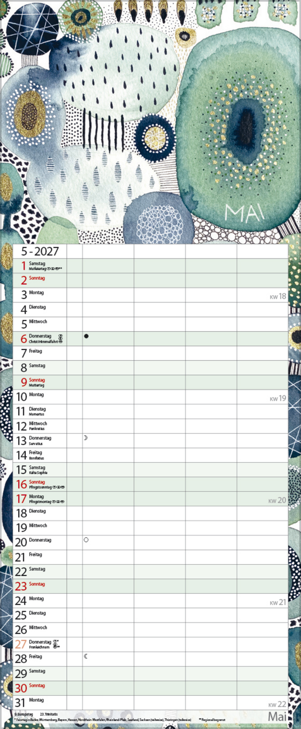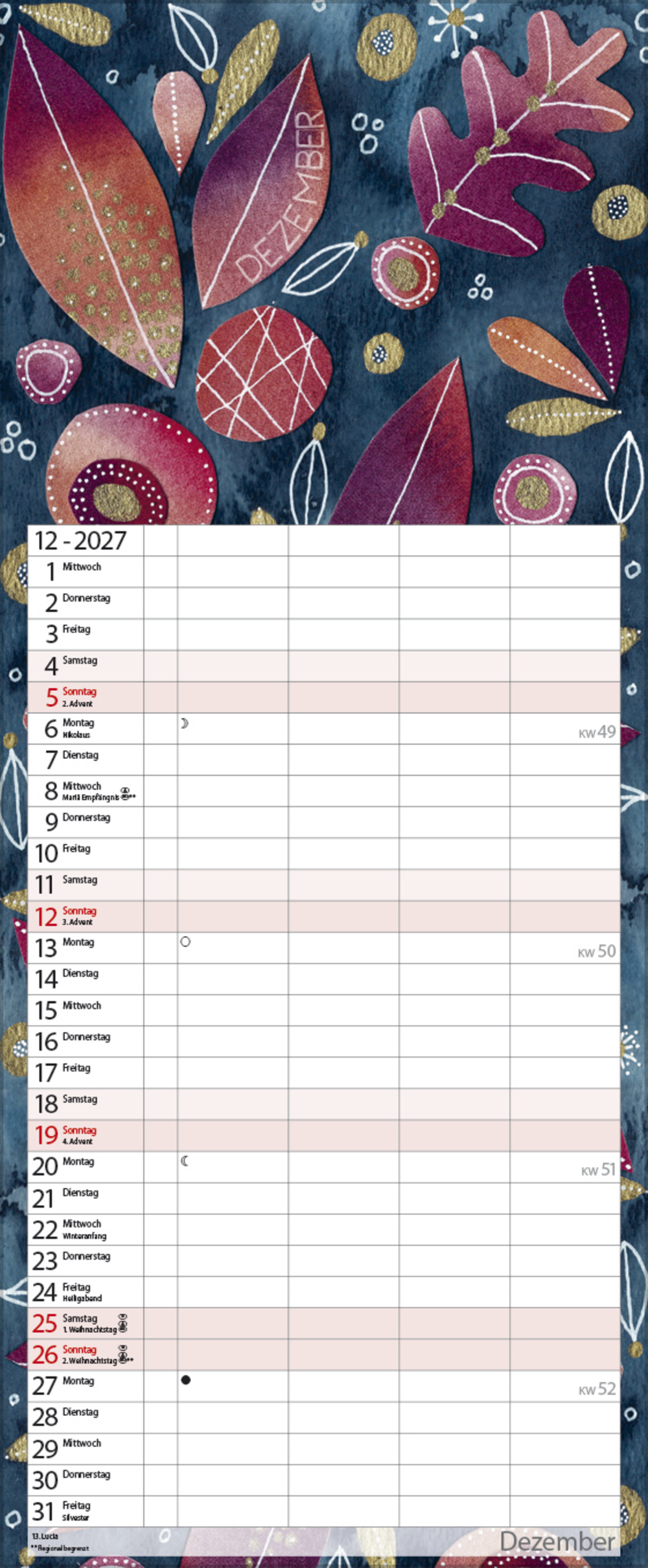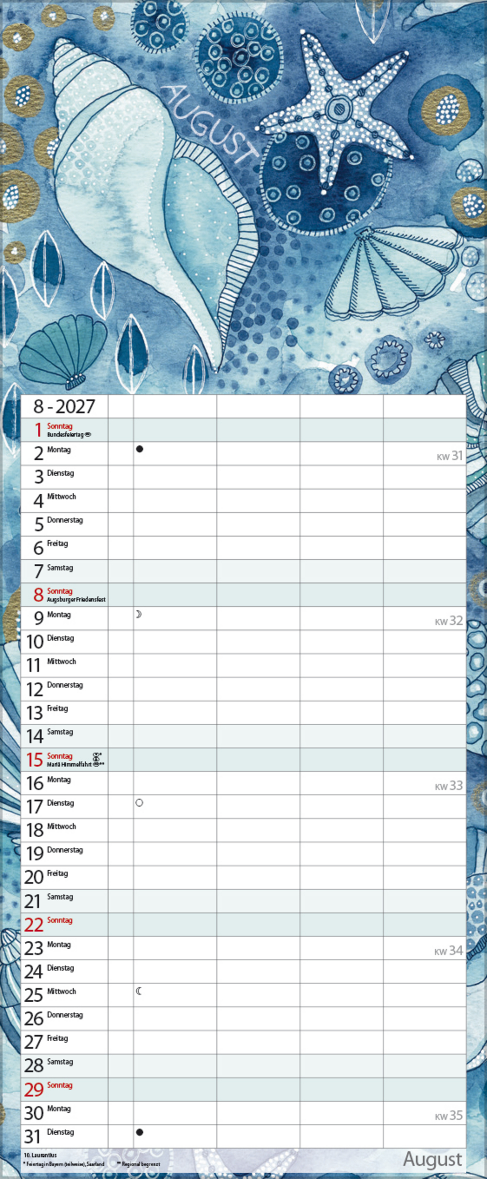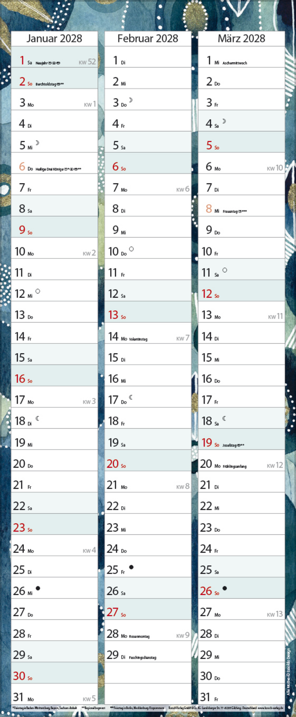 - Farblich hervorgehobene Sonn- und Feiertage sowie Anzeige der Zeitumstellung