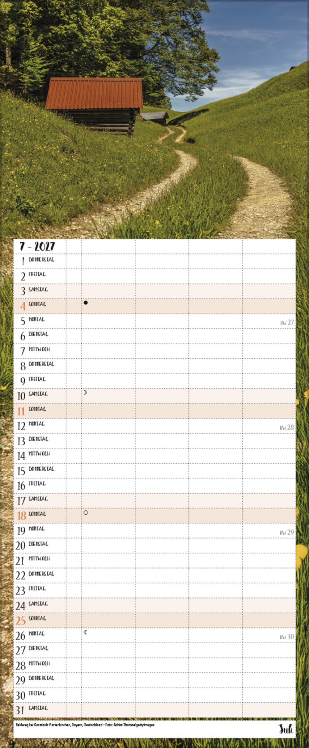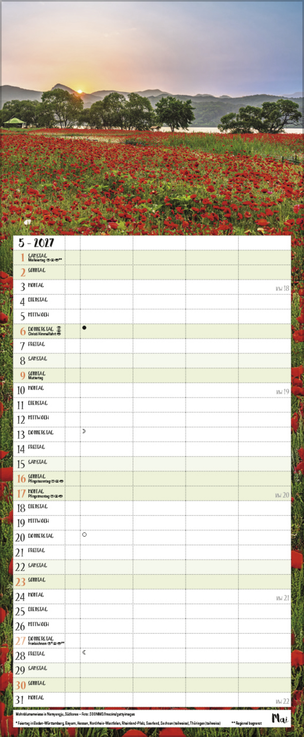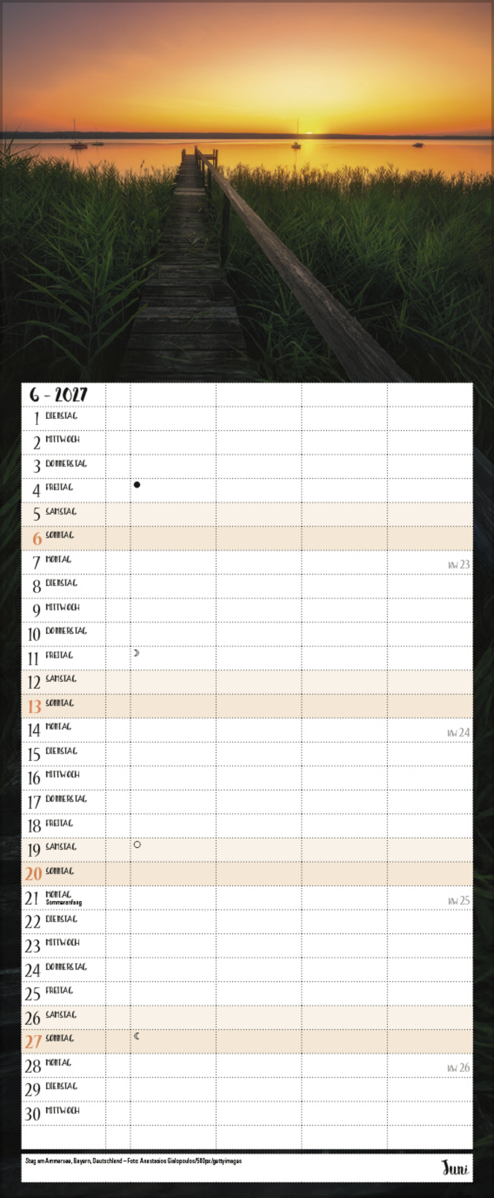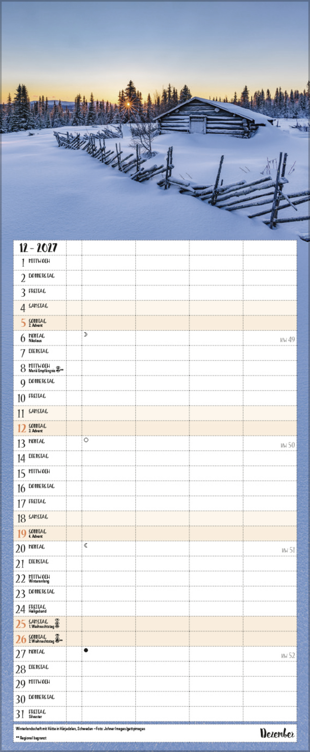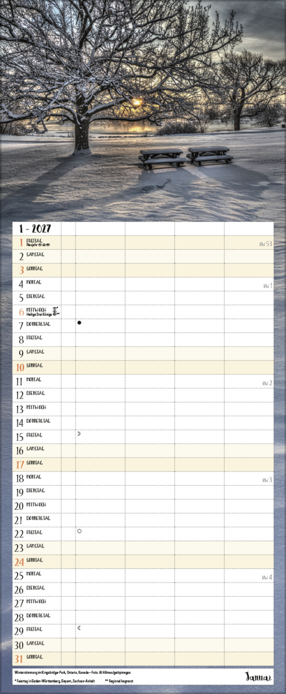 Alle, die sich an magischen Naturstimmungen in herrlicher Landschaft nicht sattsehen können, planen ihre Jahrestermine am liebsten mit diesem praktischen Familienkalender. Neben außergewöhnlichen Fotos bietet er 4 praktische Spalten zum Eintragen, eine Vorschau bis März des Folgejahres und eine Übersicht mit Ferienterminen.