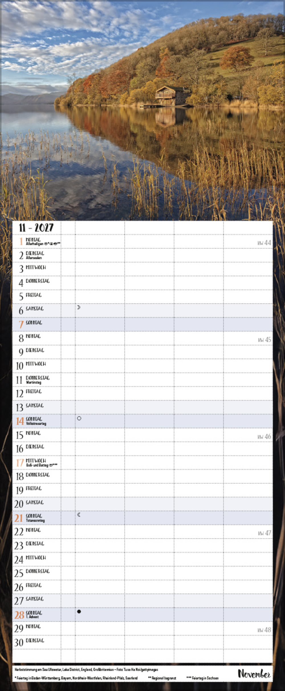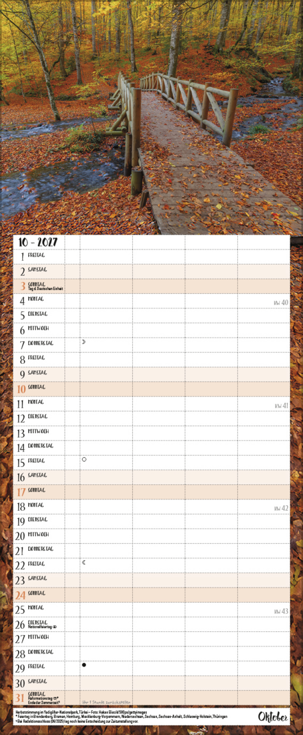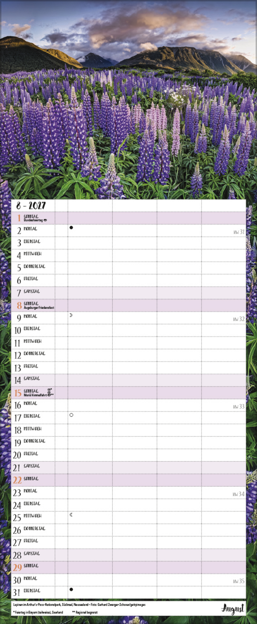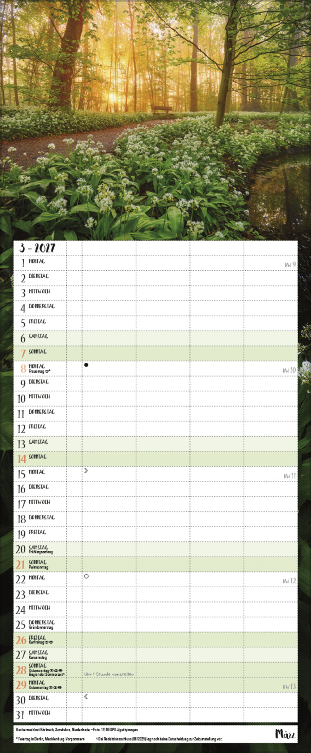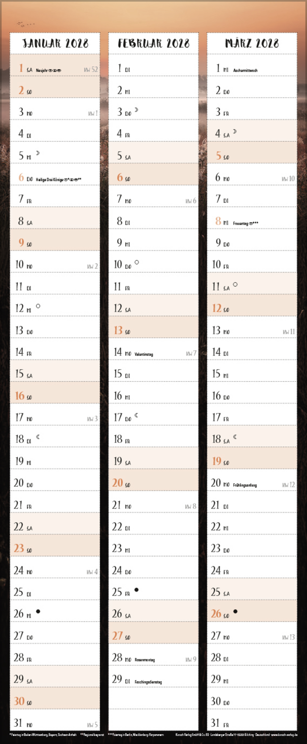 - Farblich hervorgehobene Sonn- und Feiertage sowie Anzeige der Zeitumstellung