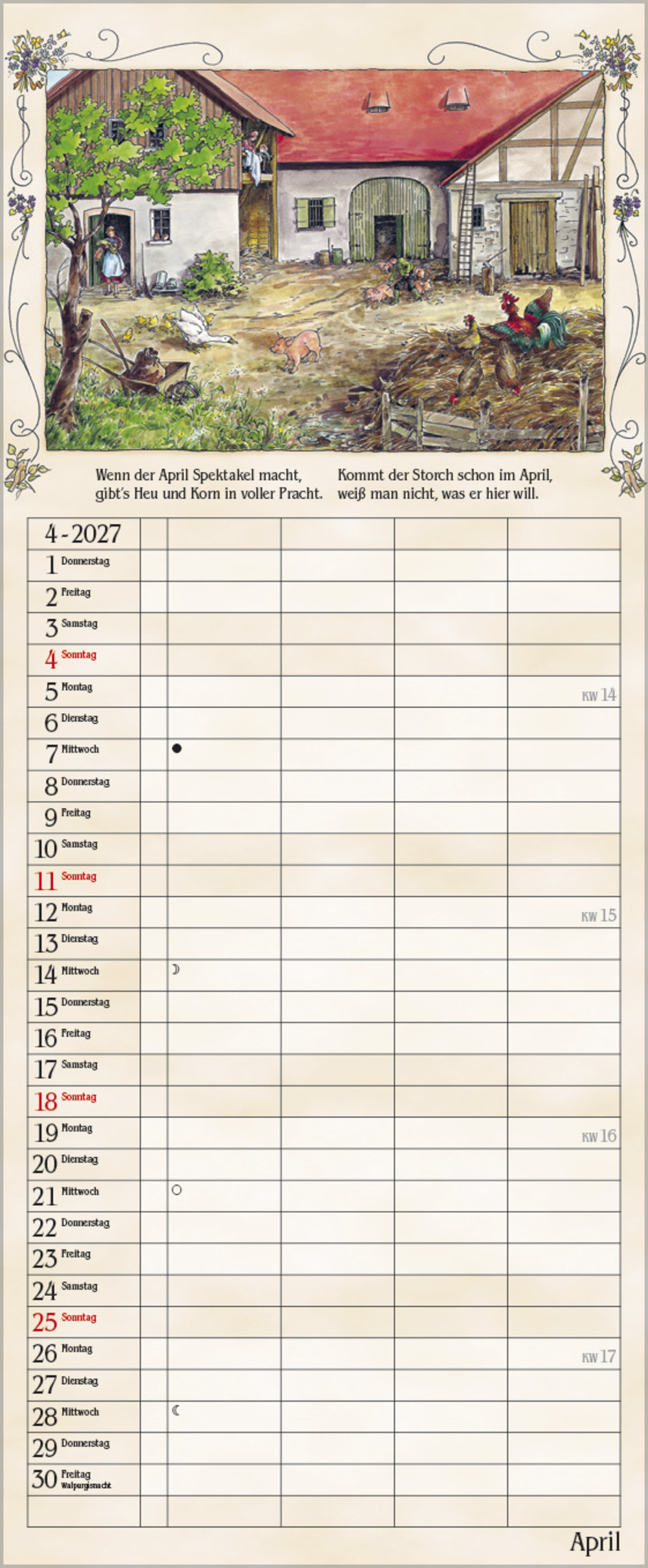 Dieser Planer fügt sich nahtlos in jede gemütlich-rustikale Umgebung ein. Mit nostalgischen Bildern von Christa Versley, Bauernregeln und vier Spalten. Neben dem gesamten Kalenderjahr enthält der Wandplaner auch eine Vorschau bis März des Folgejahres.