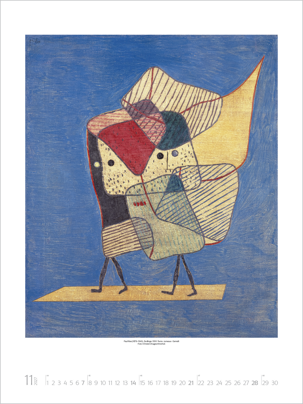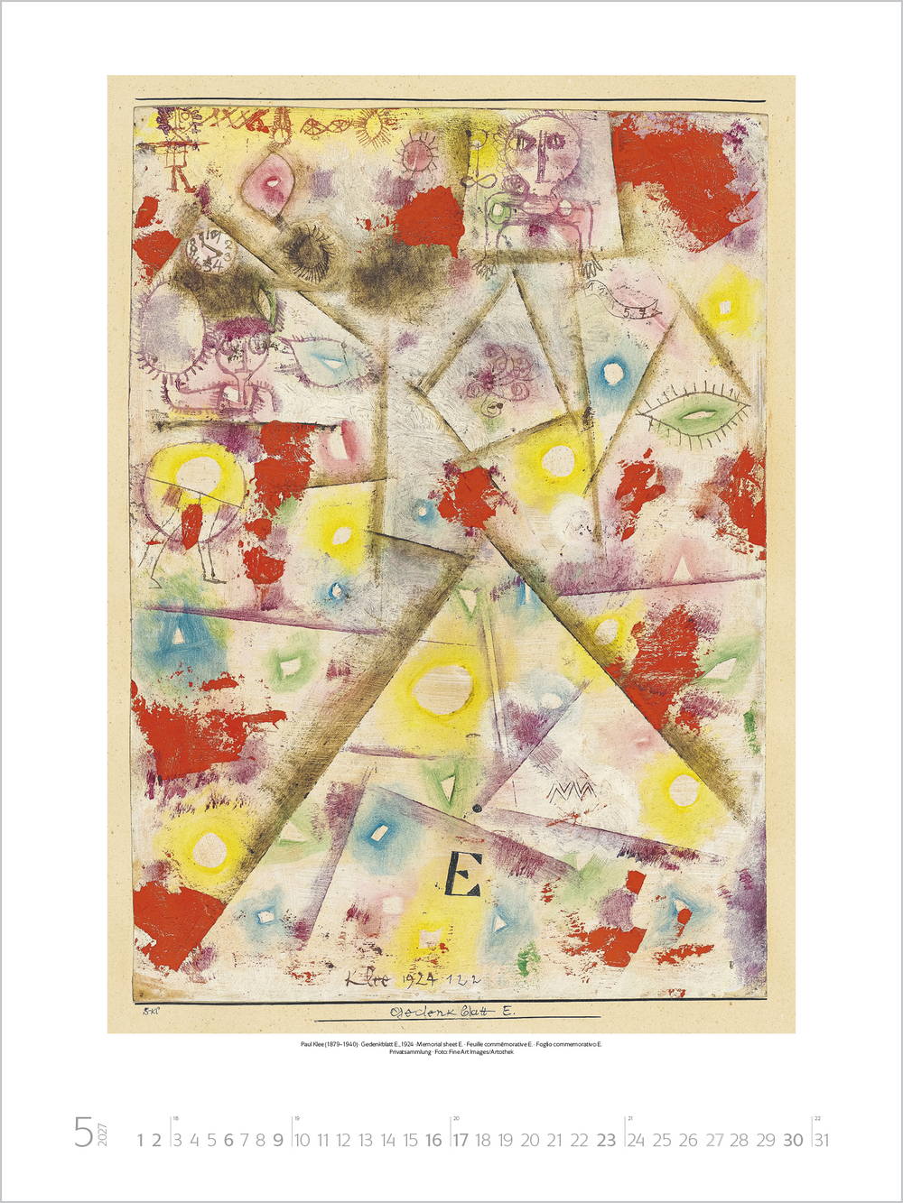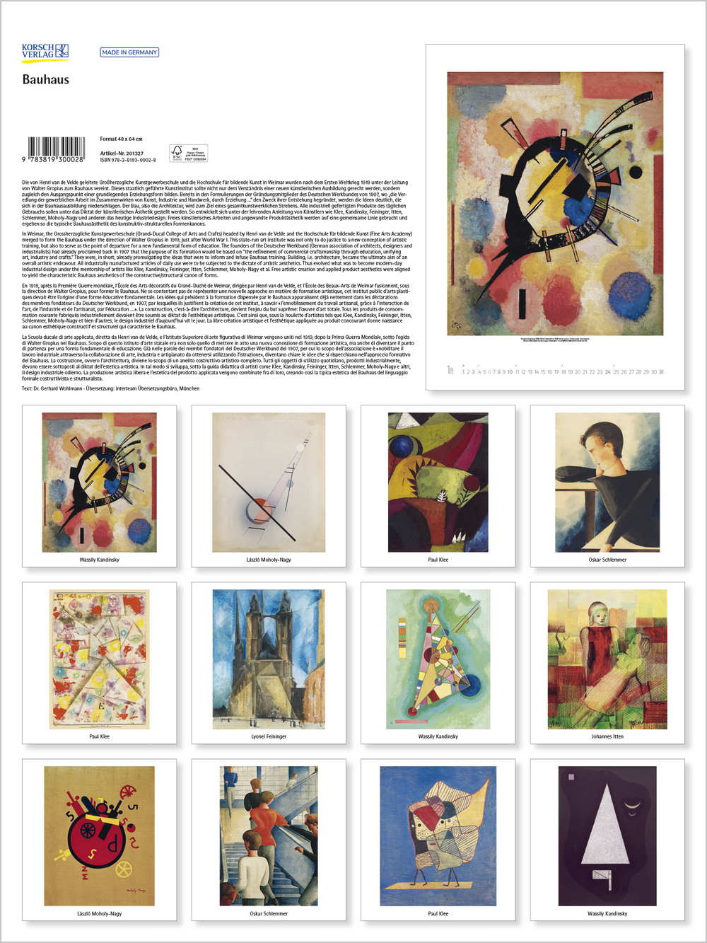 Klarheit, Sachlichkeit und Zweckmäßigkeit sowie das Zusammenwirken von Kunst und Industrie im Sinn umfassender Lebensgestaltung waren die Maximen dieses revolutionär neuen Kunstverständnisses. Der Kalender zeigt eine Auswahl der bekanntesten Werke großer Bauhaus-Künstler wie Klee, Kandinsky und Moholy-Nagy.