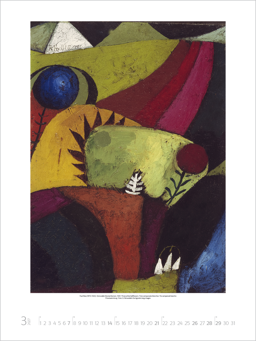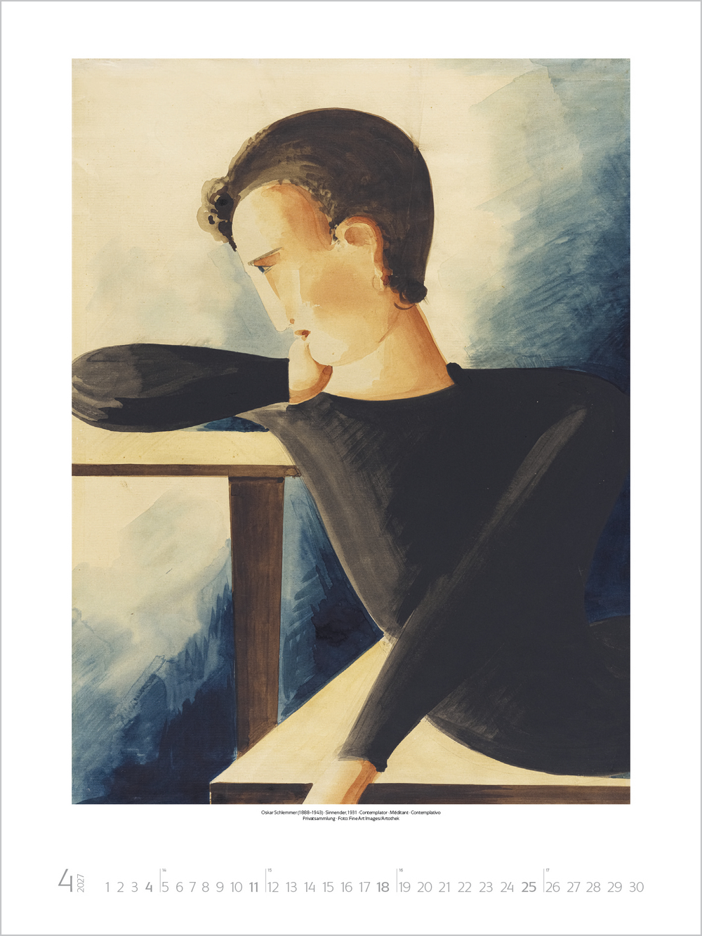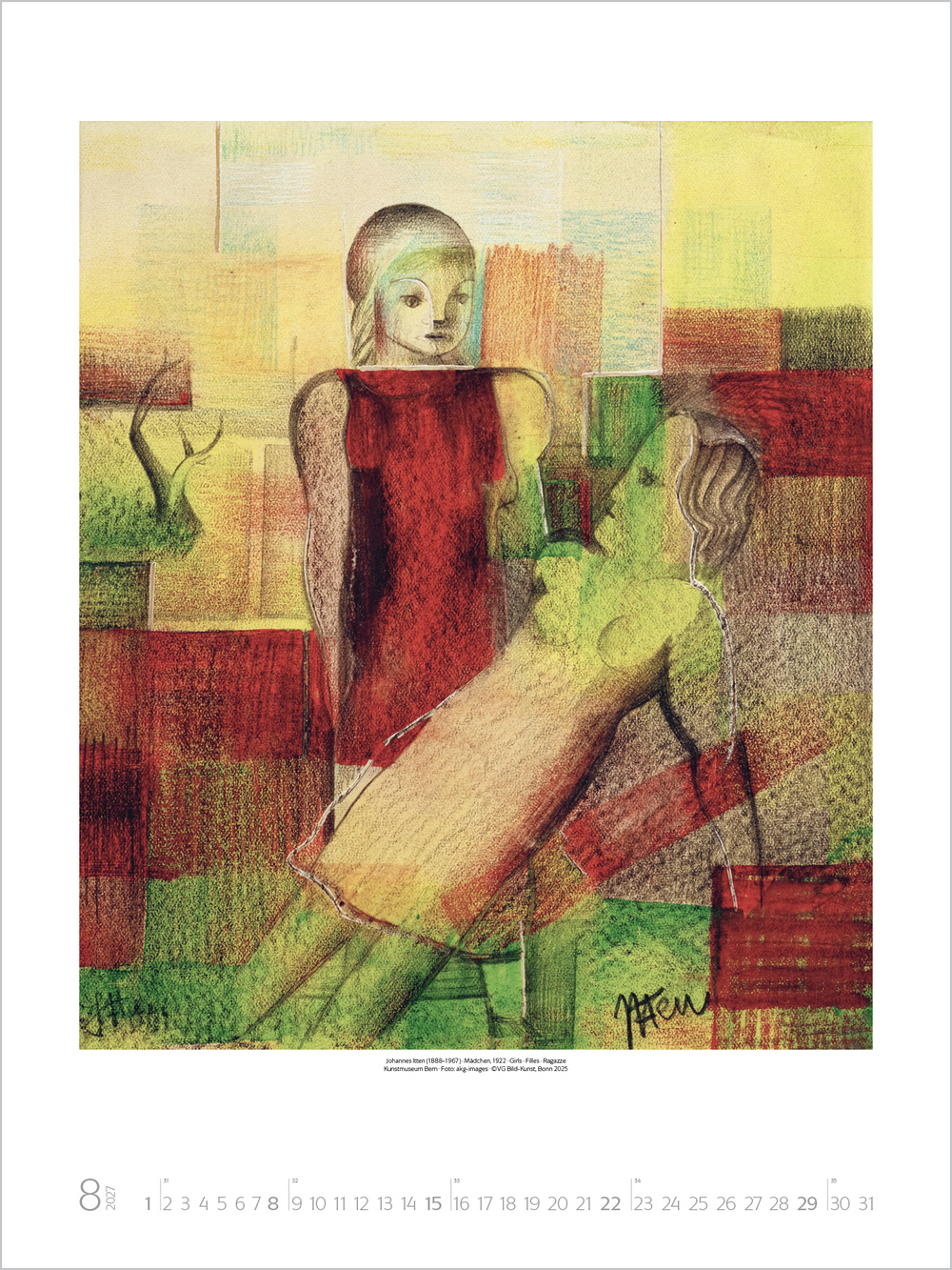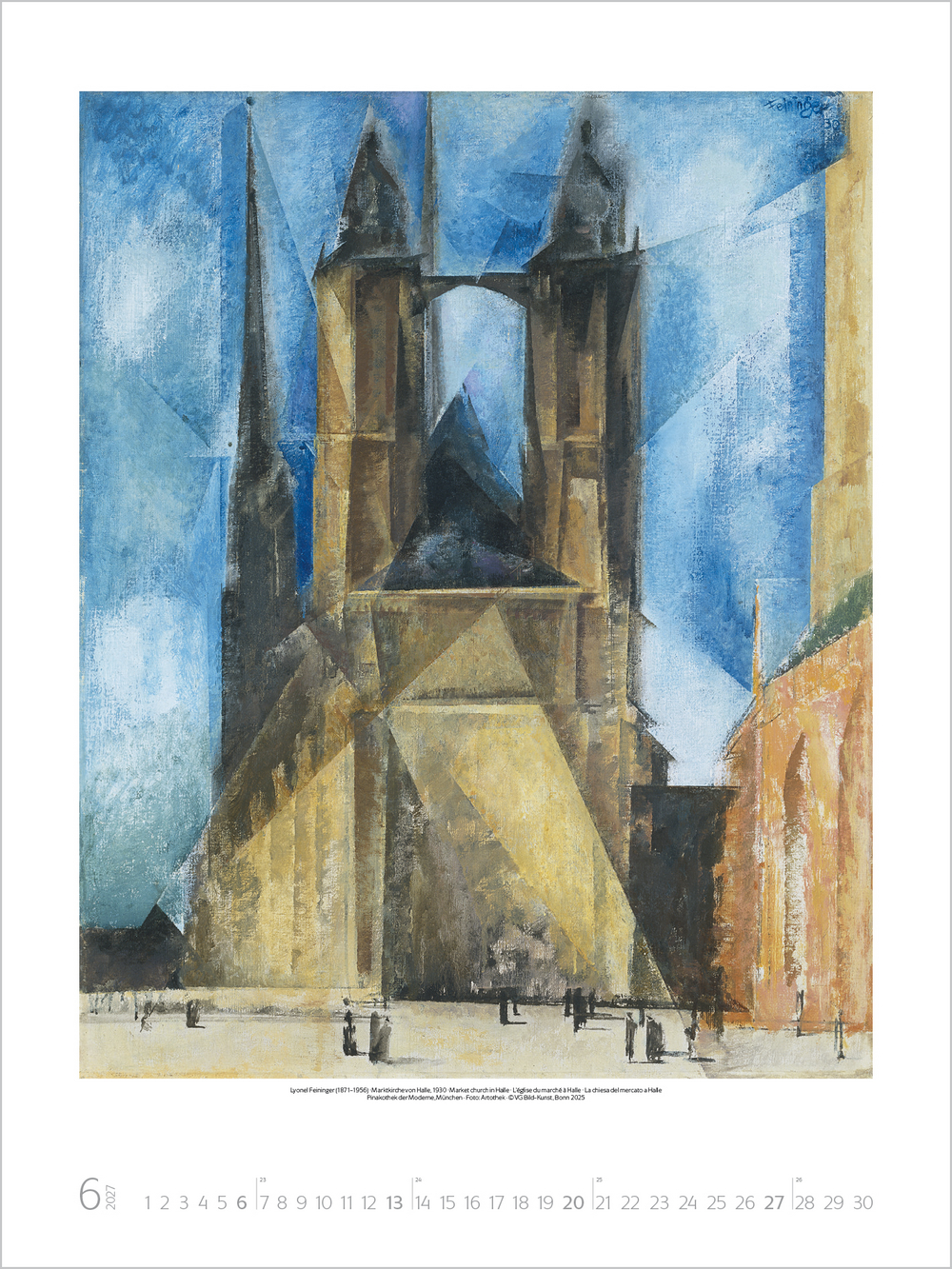 Klarheit, Sachlichkeit und Zweckmäßigkeit sowie das Zusammenwirken von Kunst und Industrie im Sinn umfassender Lebensgestaltung waren die Maximen dieses revolutionär neuen Kunstverständnisses. Der Kalender zeigt eine Auswahl der bekanntesten Werke großer Bauhaus-Künstler wie Klee, Kandinsky und Moholy-Nagy.