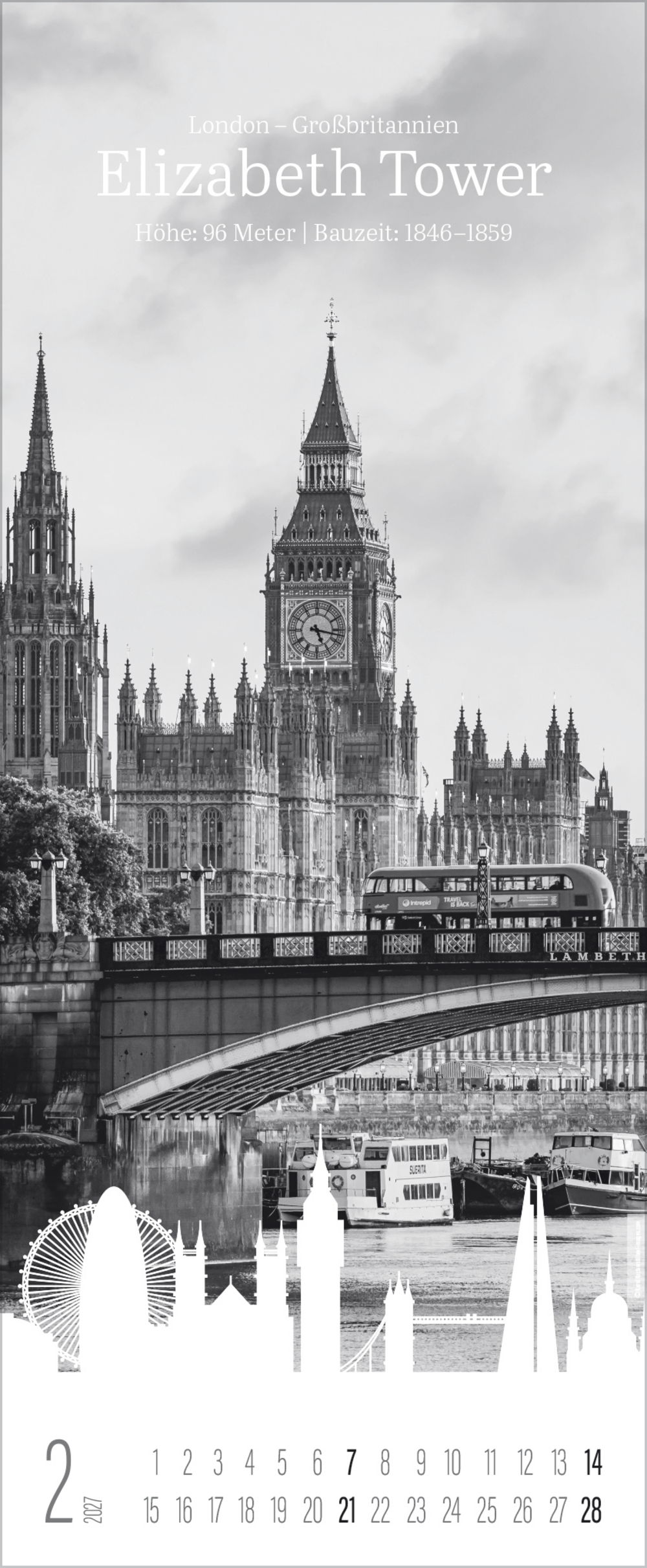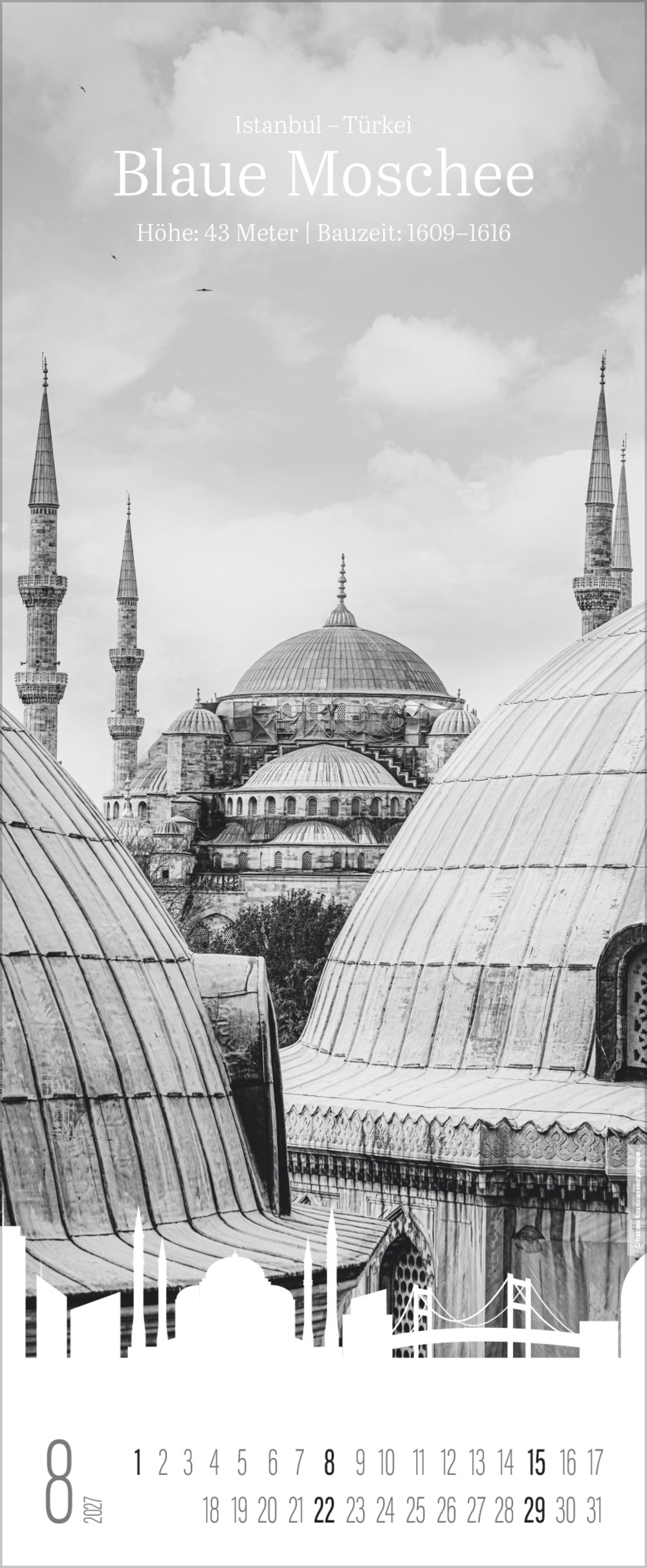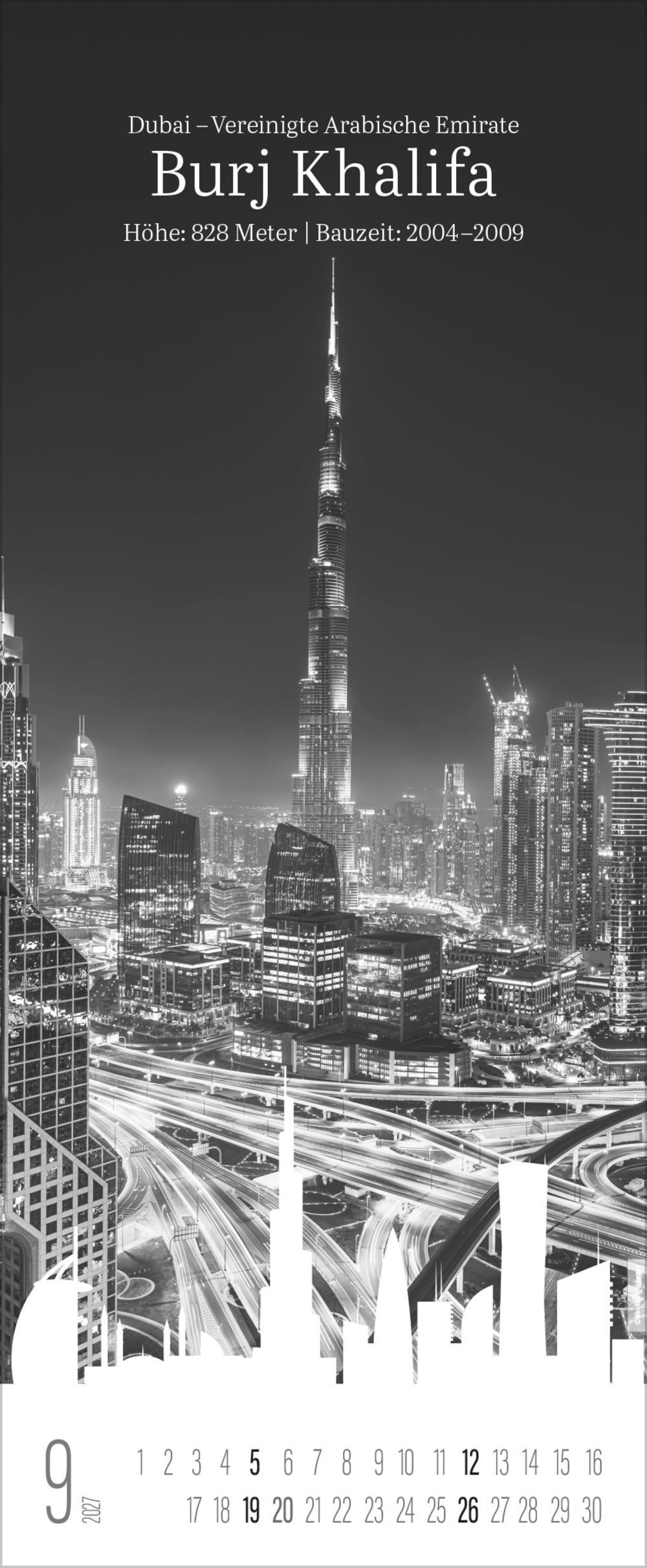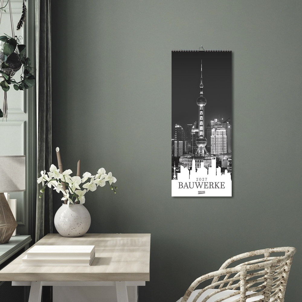Der Kalender Bauwerke zeigt Monat für Monat beeindruckende Bauwerke rund um den Globus – festgehalten in ausdrucksstarken Schwarz-Weiß-Fotografien. Jedes Motiv wird durch die stilisierte Skyline der jeweiligen Stadt sowie modern gestalteter Typografie ergänzt. Ein eleganter Blickfang für alle Liebhaber von Architektur, Fotografie und urbaner Ästhetik.