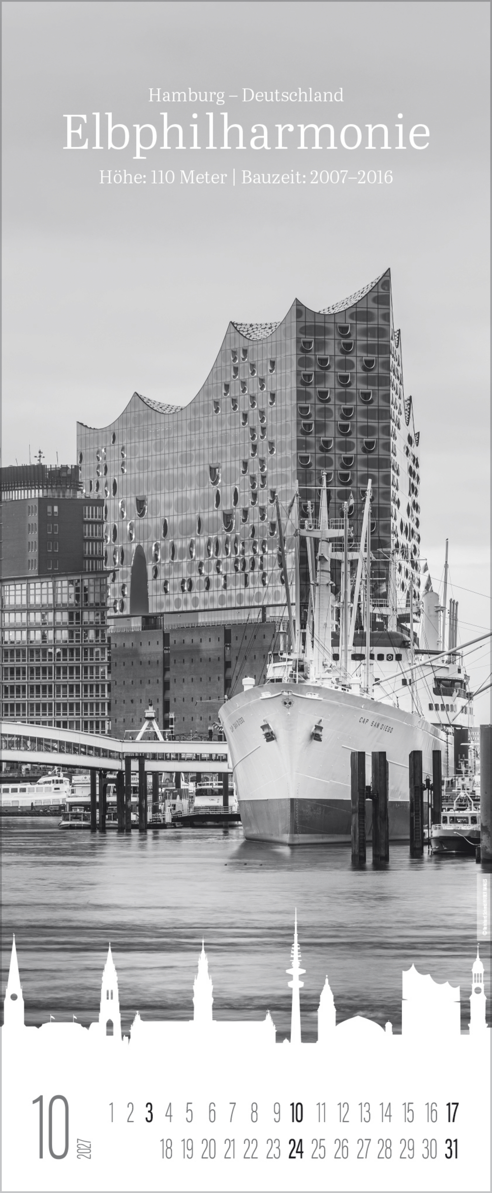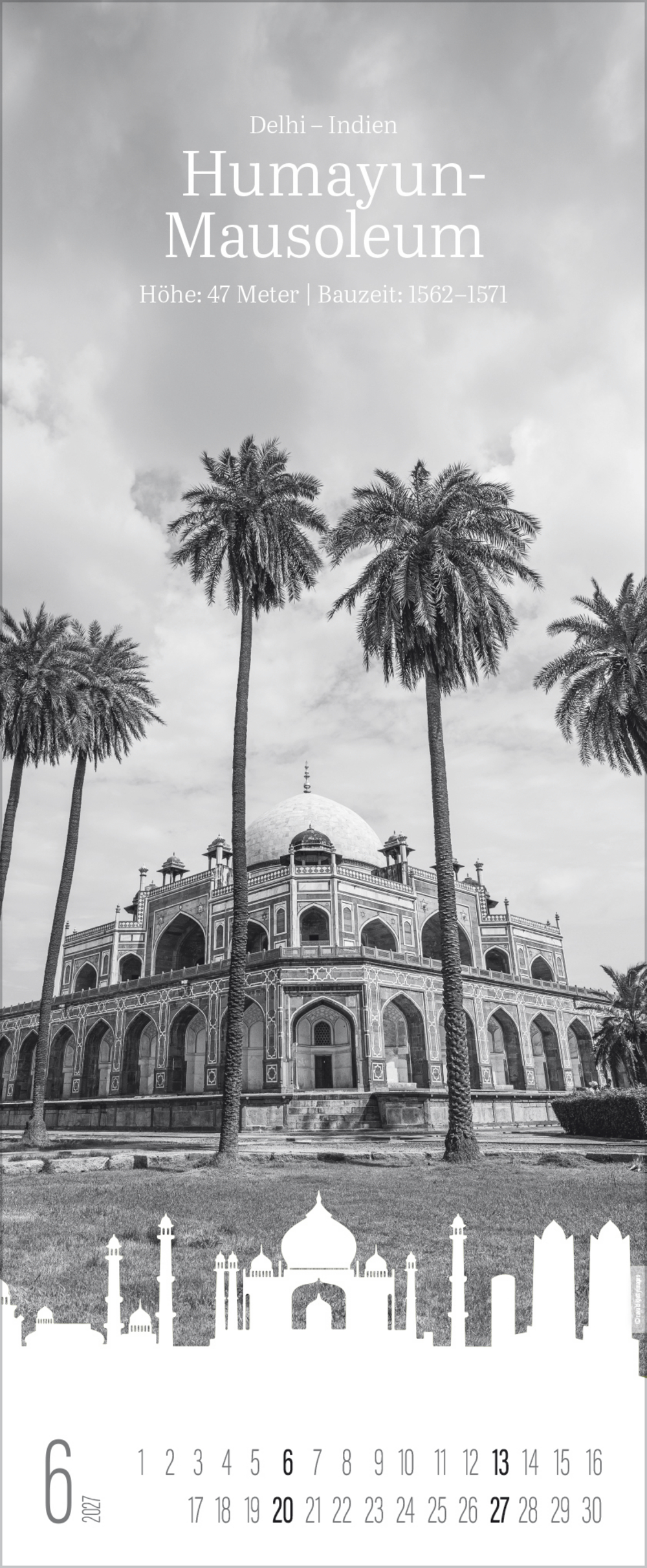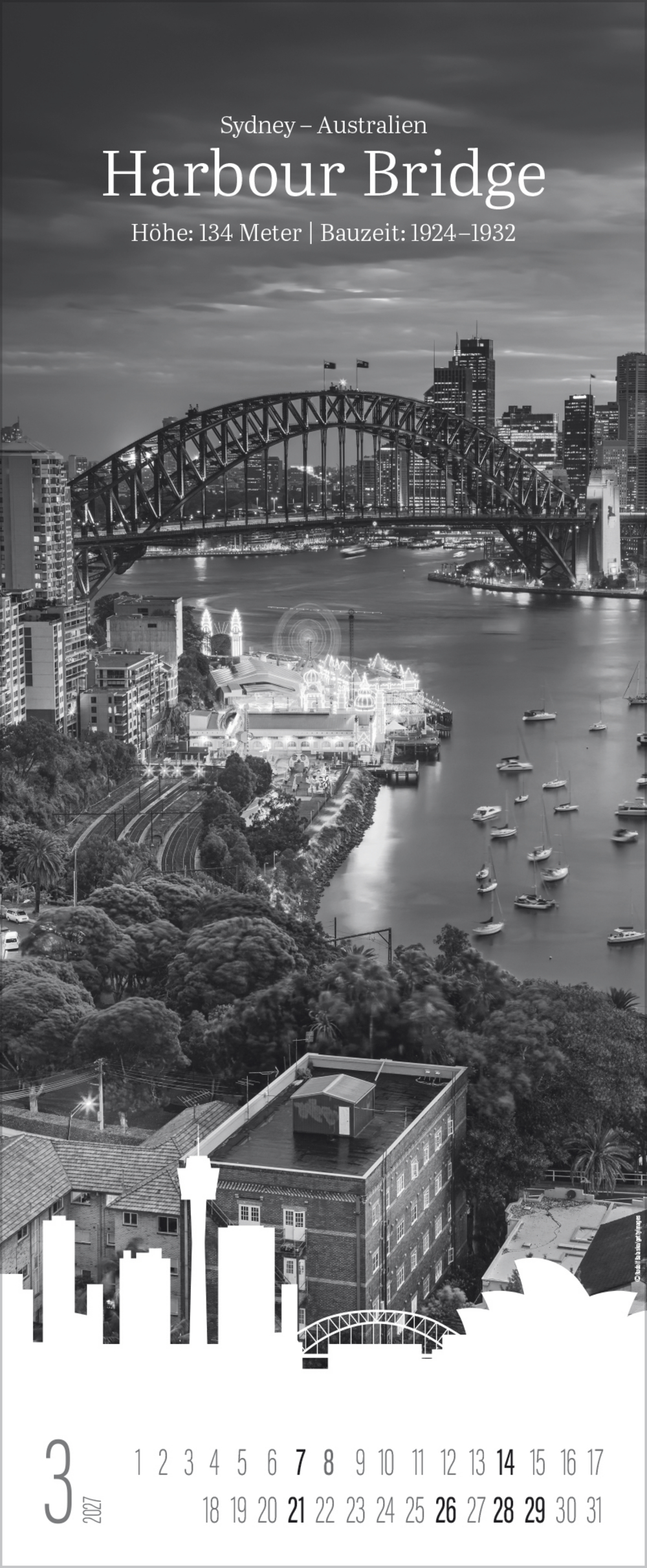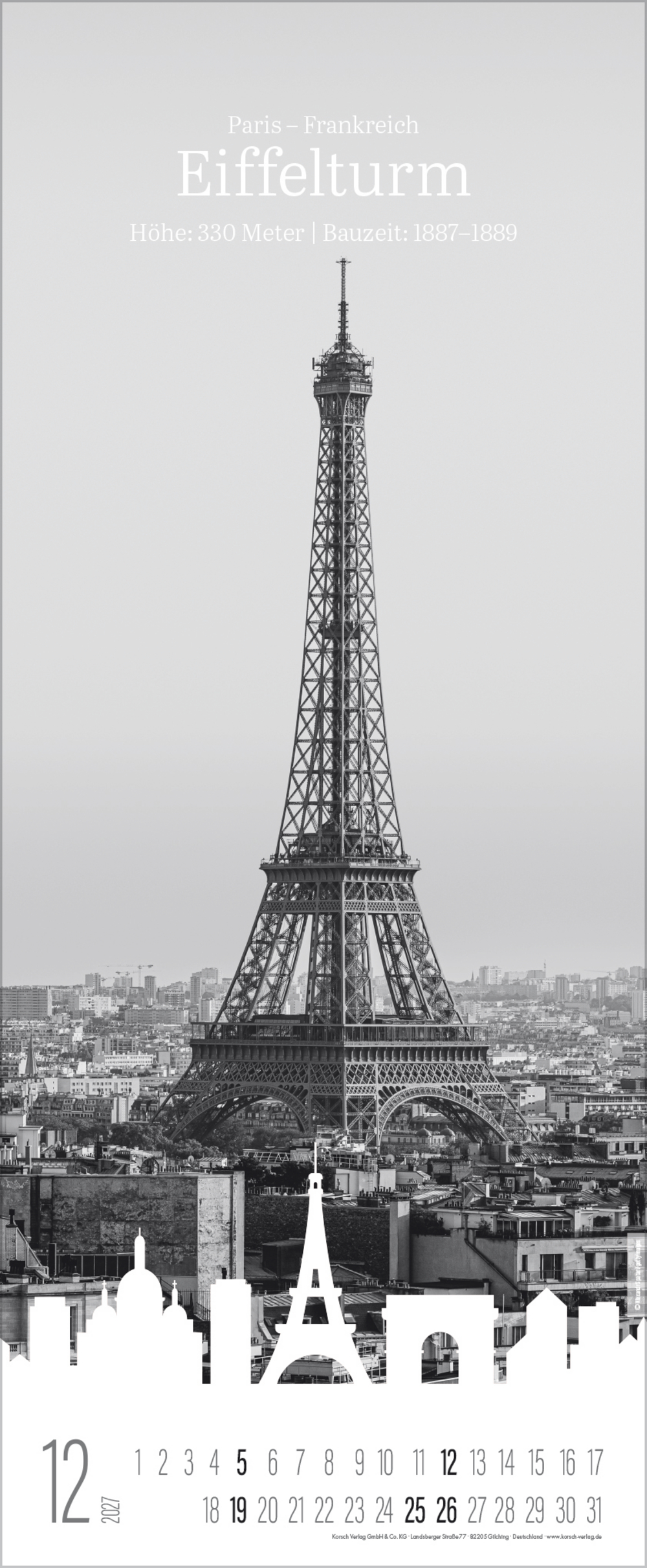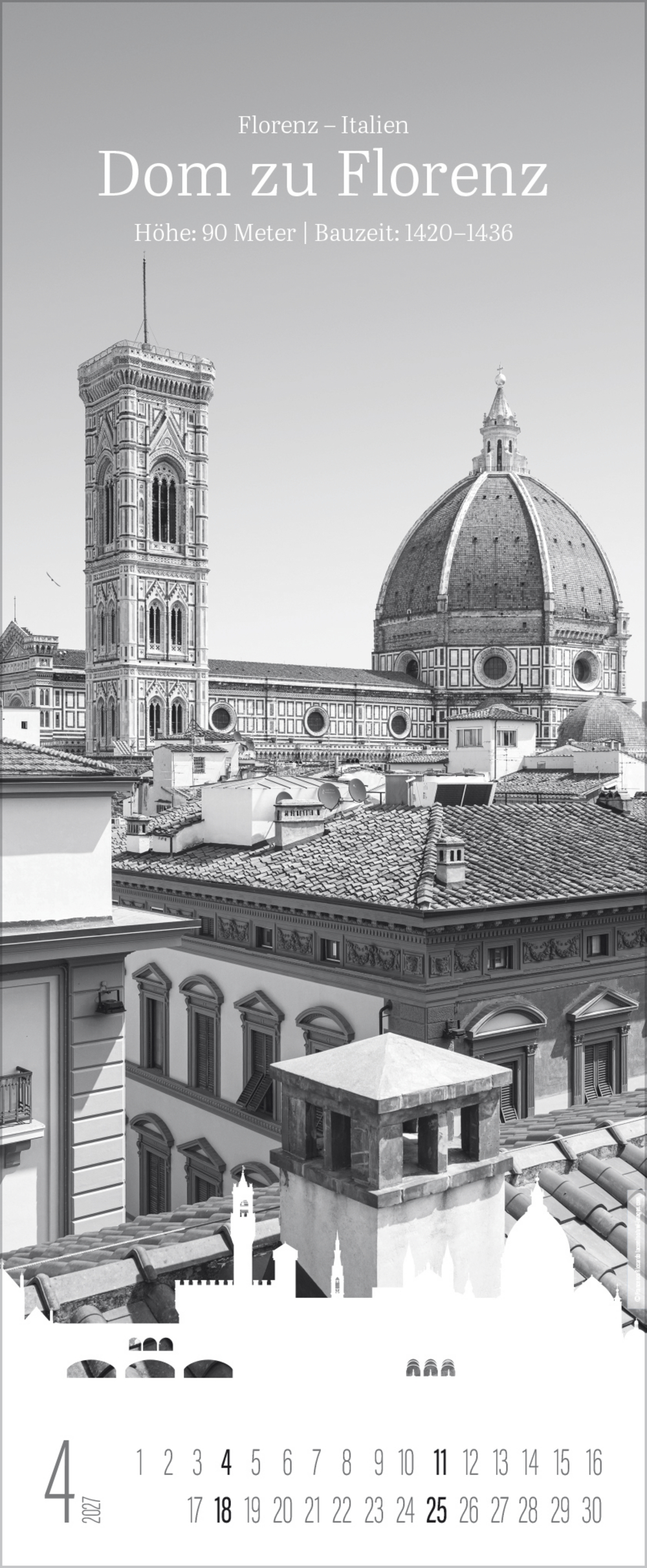 Der Kalender Bauwerke zeigt Monat für Monat beeindruckende Bauwerke rund um den Globus – festgehalten in ausdrucksstarken Schwarz-Weiß-Fotografien. Jedes Motiv wird durch die stilisierte Skyline der jeweiligen Stadt sowie modern gestalteter Typografie ergänzt. Ein eleganter Blickfang für alle Liebhaber von Architektur, Fotografie und urbaner Ästhetik.