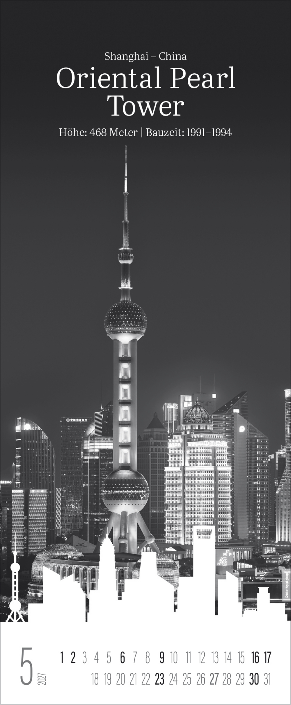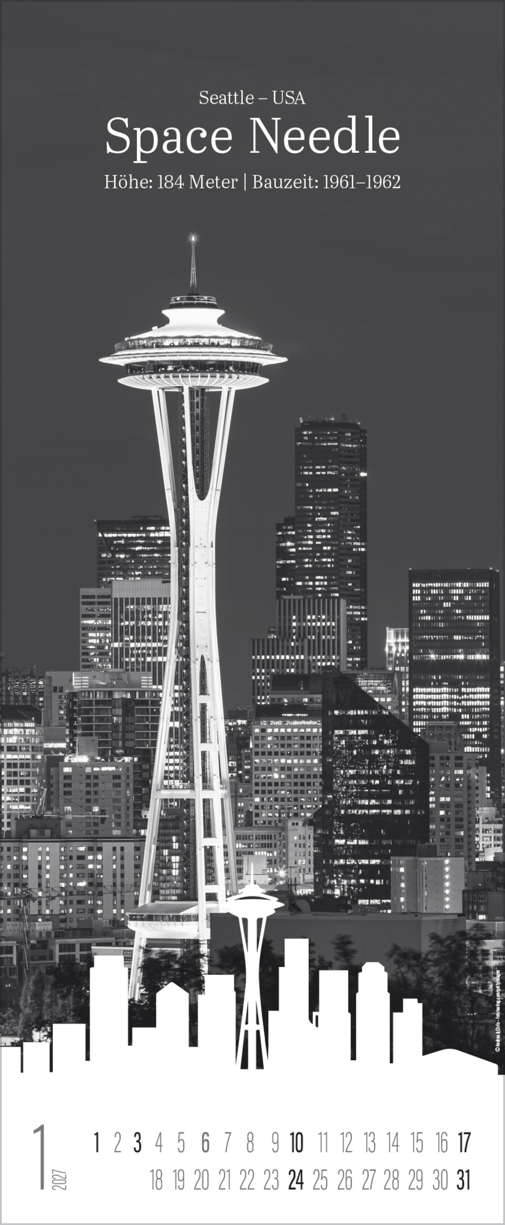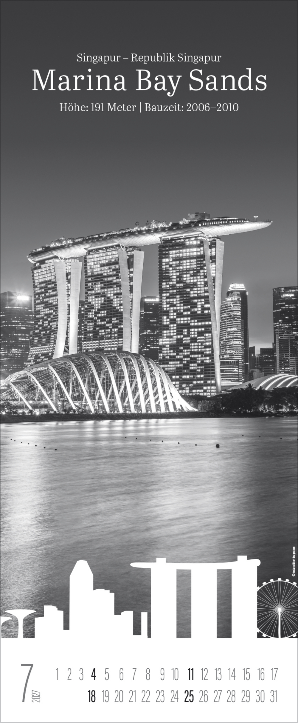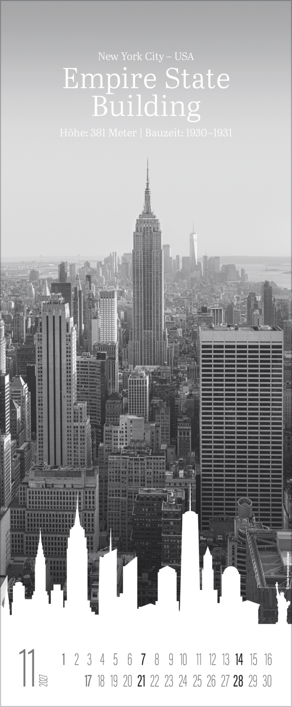 Der Kalender Bauwerke zeigt Monat für Monat beeindruckende Bauwerke rund um den Globus – festgehalten in ausdrucksstarken Schwarz-Weiß-Fotografien. Jedes Motiv wird durch die stilisierte Skyline der jeweiligen Stadt sowie modern gestalteter Typografie ergänzt. Ein eleganter Blickfang für alle Liebhaber von Architektur, Fotografie und urbaner Ästhetik.