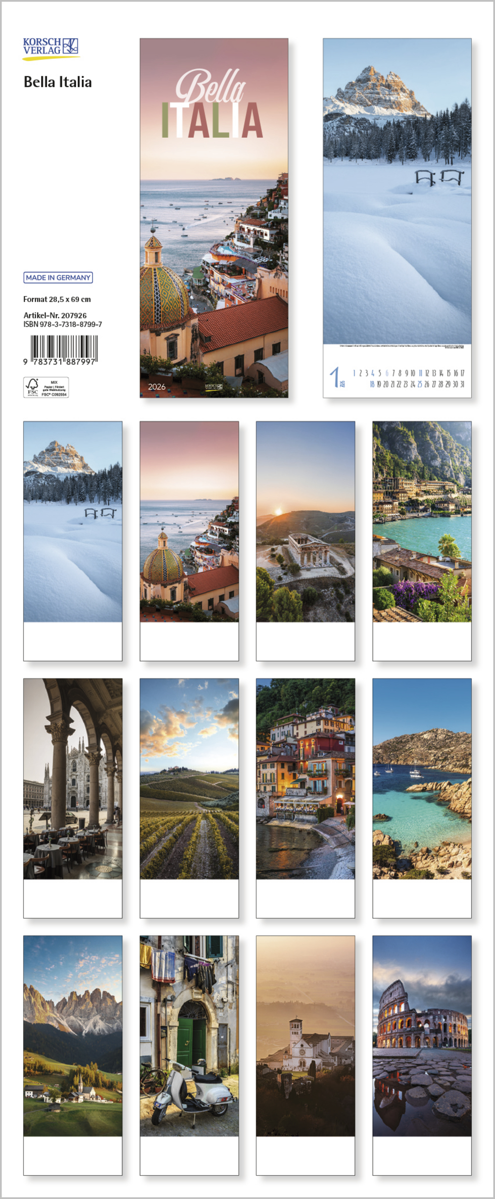 Dieser Kalender bringt den Zauber von Bella Italia in die eigenen vier Wände. Schneebedeckte Gipfel in den Alpen, malerische Landschaften in der Toskana oder romantische Felsküsten am Mittelmeer,das facettenreiche Land hat einiges zu bieten. Nicht umsonst ist Italien nach wie vor eines der beliebtesten Reiseziele im europäischen Raum. Zwölf stimmungsvolle Fotografien zeigen dies chönsten Seiten Italiens zu allen Jahreszeiten.