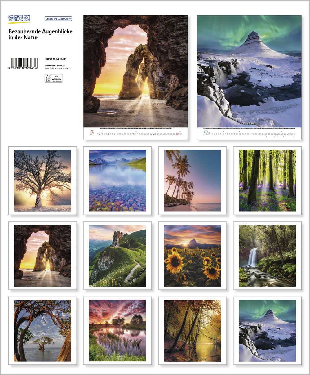 Bezaubernde Augenblicke in der Natur kann man mit diesem Kalender im großen Hochformat genießen. Einzigartige Fotografien von Stränden, Felsformationen, Wäldern und Seen mit besonderen Lichtstimmungen begleiten durch die Jahreszeiten und lassen uns die Vielfalt und Schönheit der Erde ausgiebig bewundern.