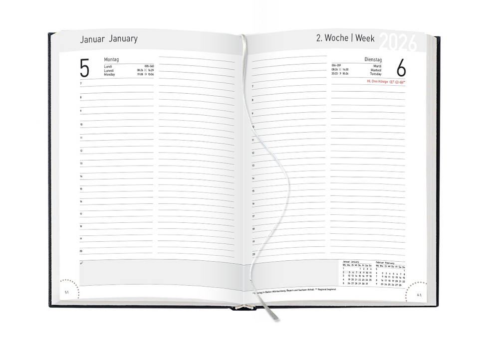- Extras: Jahresübersicht 2026/27, Platz für Notizen, Infoseiten rund um geschäftliche Themen