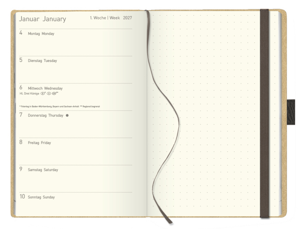 - Stifthalter, Lesebändchen und Gummiband sowie praktische Zetteltasche; Anzeige der Mondphasen