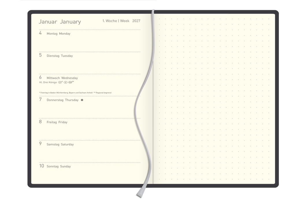 - Jede Doppelseite des 12 Monats-Kalendariums zeigt die Wochenübersicht sowie eine Seite für Notizen