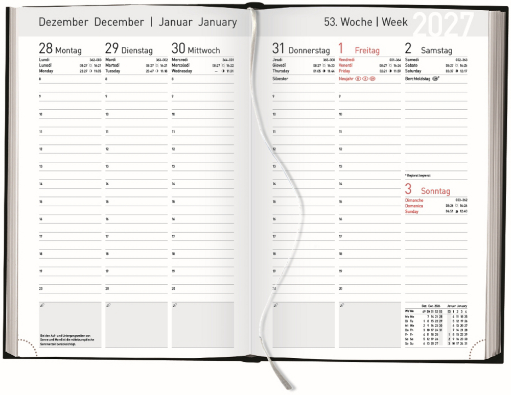 - Lesebändchen sowie praktische Eckperforationen; Anzeige der Mondphasen sowie Aufgangs- und Untergangszeiten von Sonne und Mond