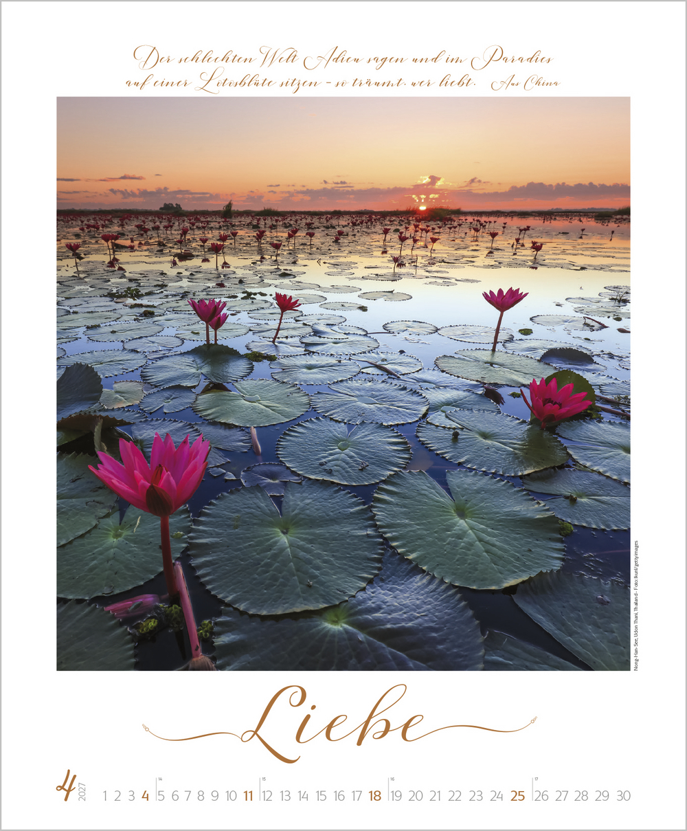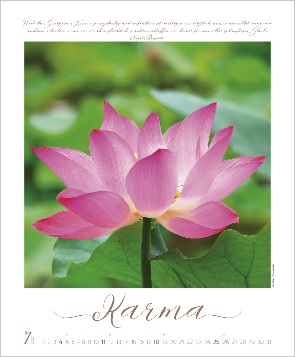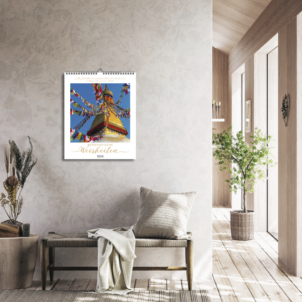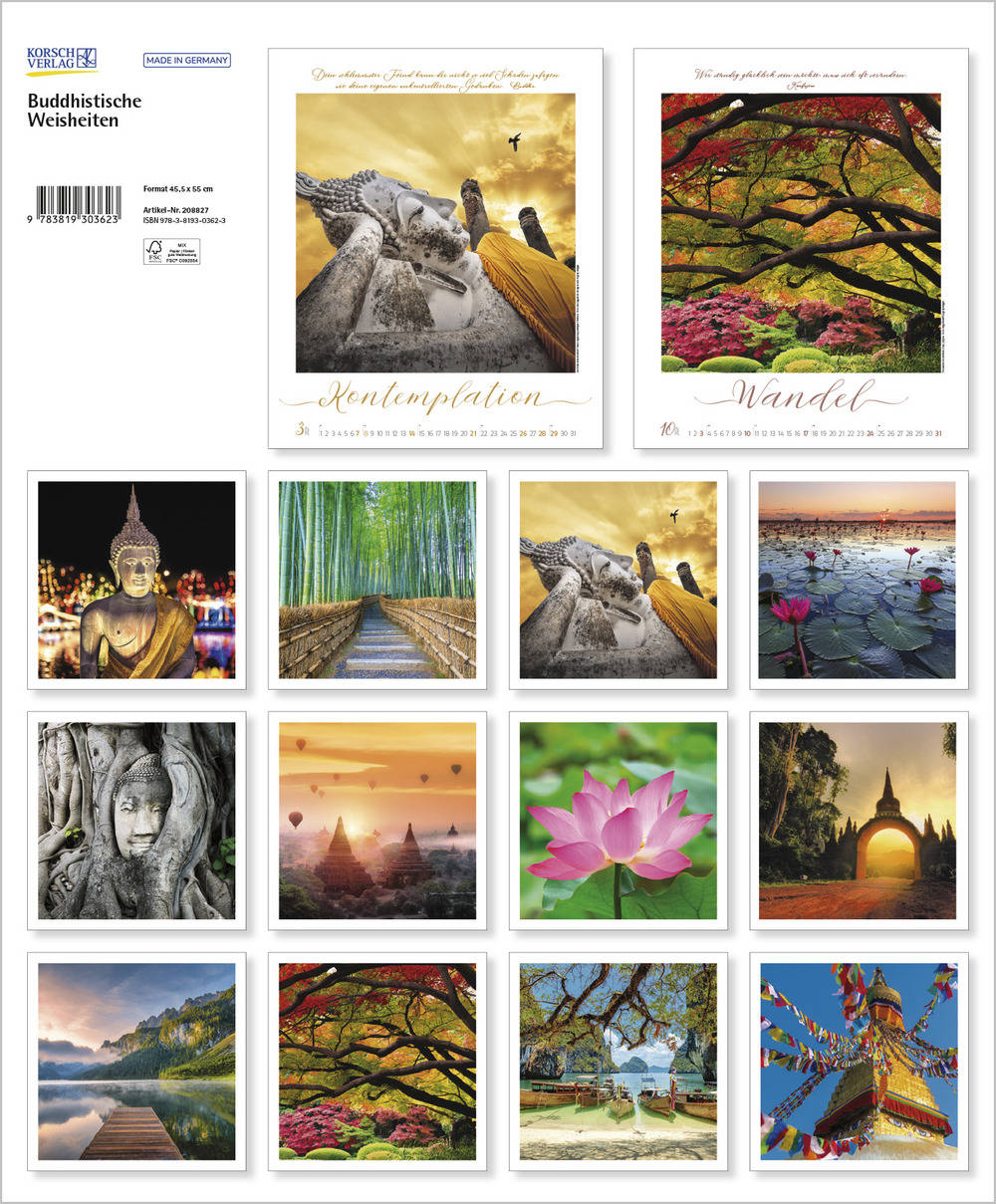 Buddhistische Weisheiten, kombiniert mit wunderschönen meditativen und exotischen Aufnahmen, begleiten im großen Posterformat durch das Jahr und sind Augenschmaus und Inspiration zugleich. Die edle Gestaltung mit Schmuckschrift in Silber-, Gold- und Kupfertönen macht jedes Monatsblatt zu einem eigenen Kunstwerk.