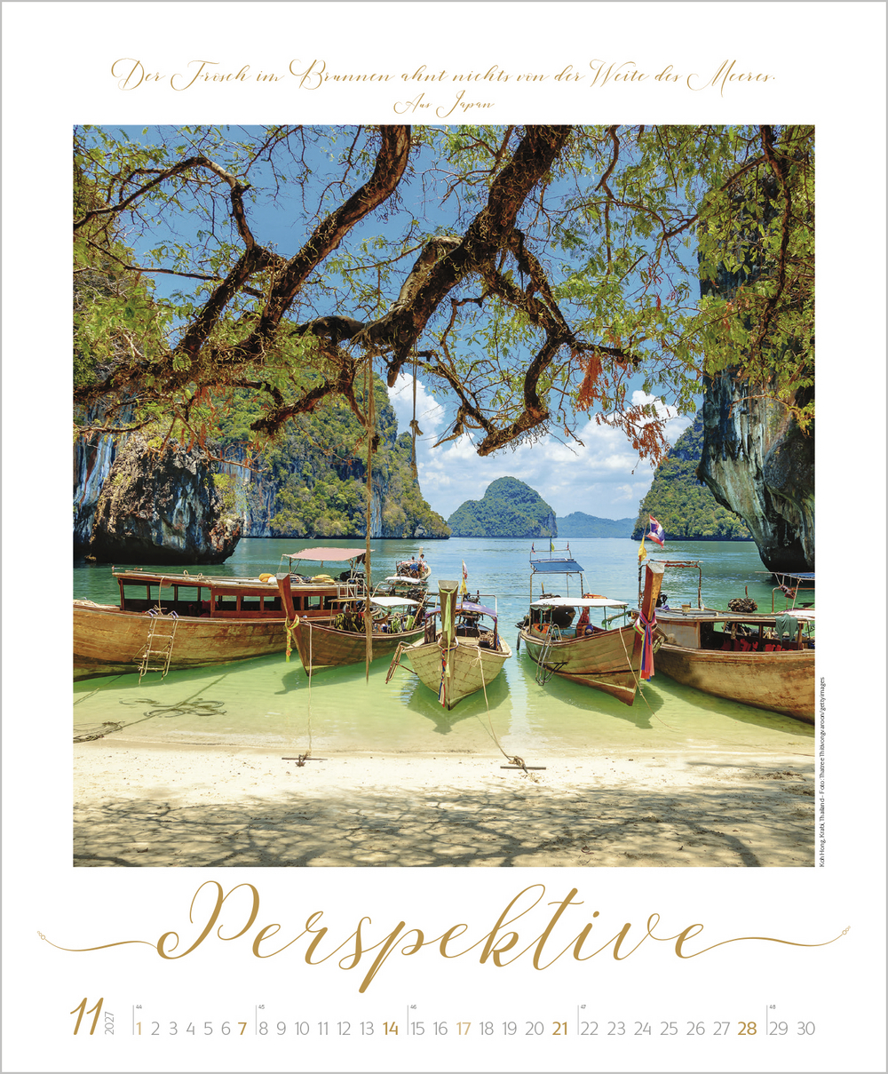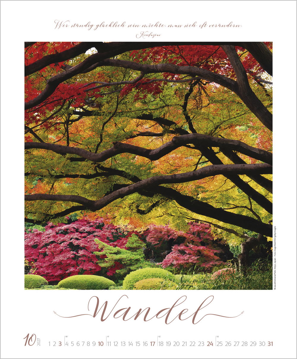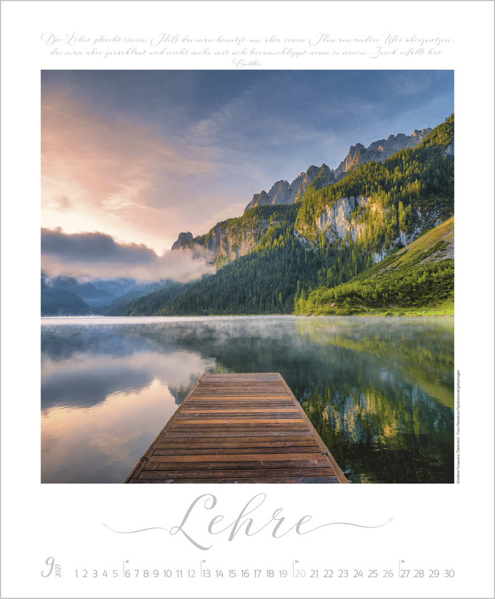 Buddhistische Weisheiten, kombiniert mit wunderschönen meditativen und exotischen Aufnahmen, begleiten im großen Posterformat durch das Jahr und sind Augenschmaus und Inspiration zugleich. Die edle Gestaltung mit Schmuckschrift in Silber-, Gold- und Kupfertönen macht jedes Monatsblatt zu einem eigenen Kunstwerk.