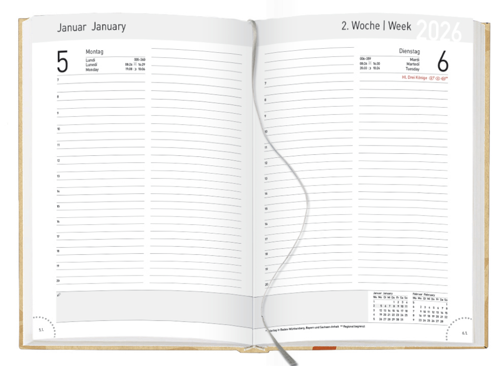 - Lesebändchen sowie praktische Eckperforationen; Anzeige der Mondphasen sowie Aufgangs- und Untergangszeiten von Sonne und Mond