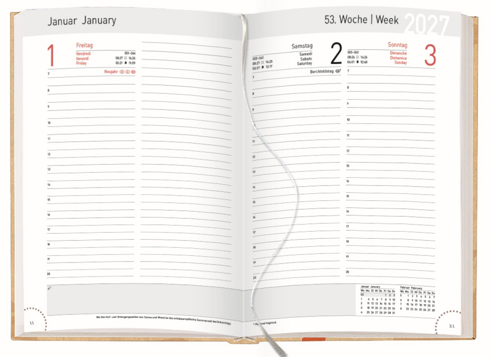 - Lesebändchen sowie praktische Eckperforationen; Anzeige der Mondphasen sowie Aufgangs- und Untergangszeiten von Sonne und Mond
