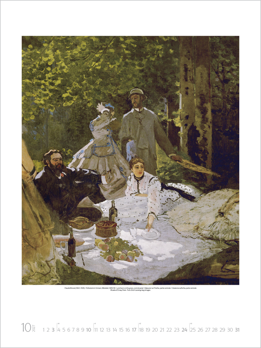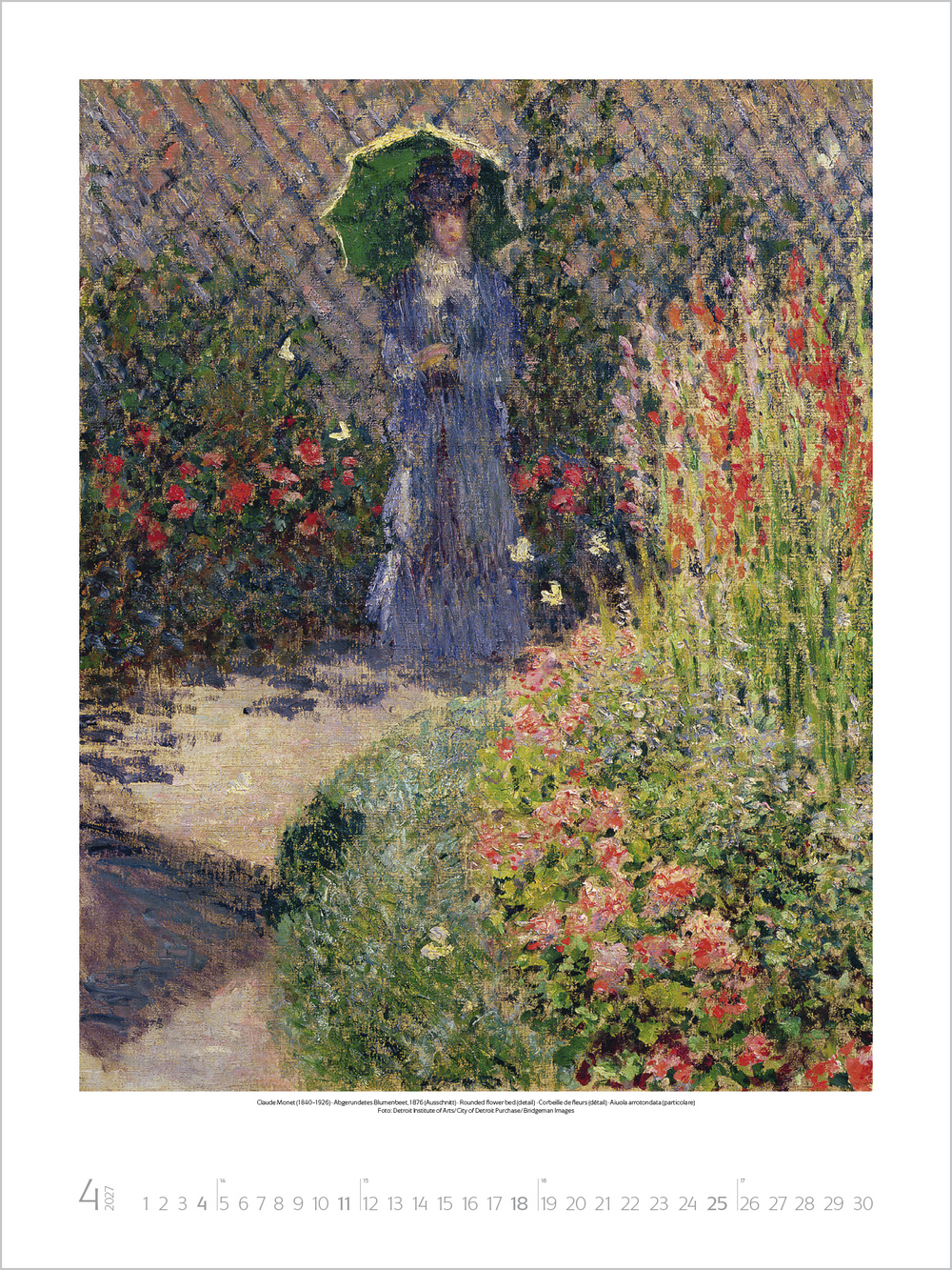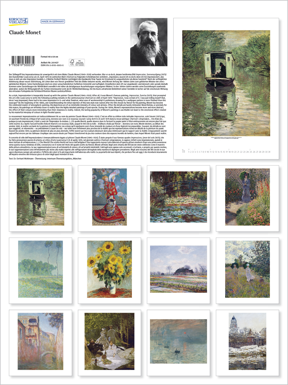 Monet steht wie kein anderer Künstler für die Stilrichtung des Impressionismus. Mit seinen grandiosen Farb- und Lichtkompositionen, die er v. a. in der freien Natur schuf, bezaubert er seine Betrachter bis heute. Eine repräsentative Auswahl seines bahnbrechenden Schaffens zeigt dieser Kalender.