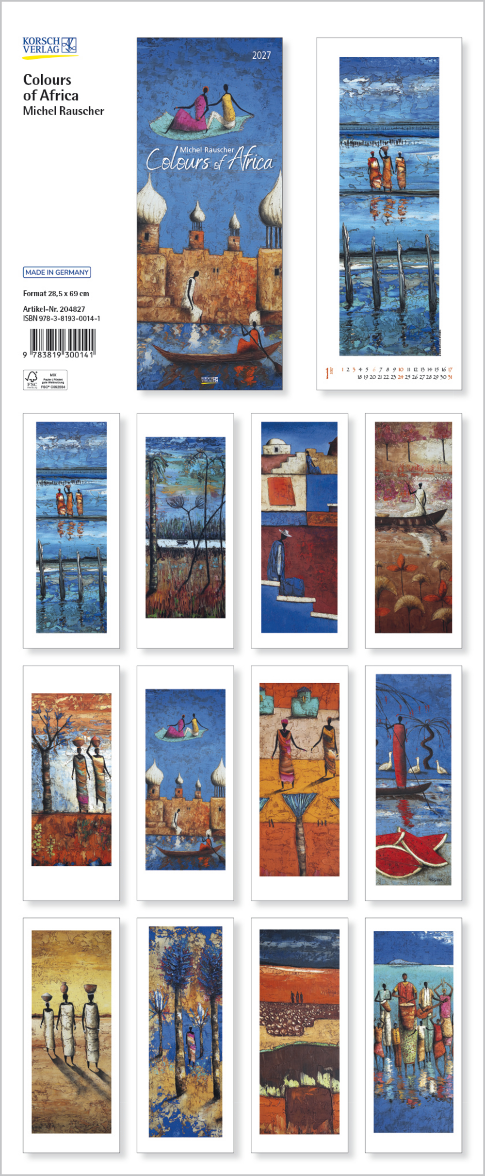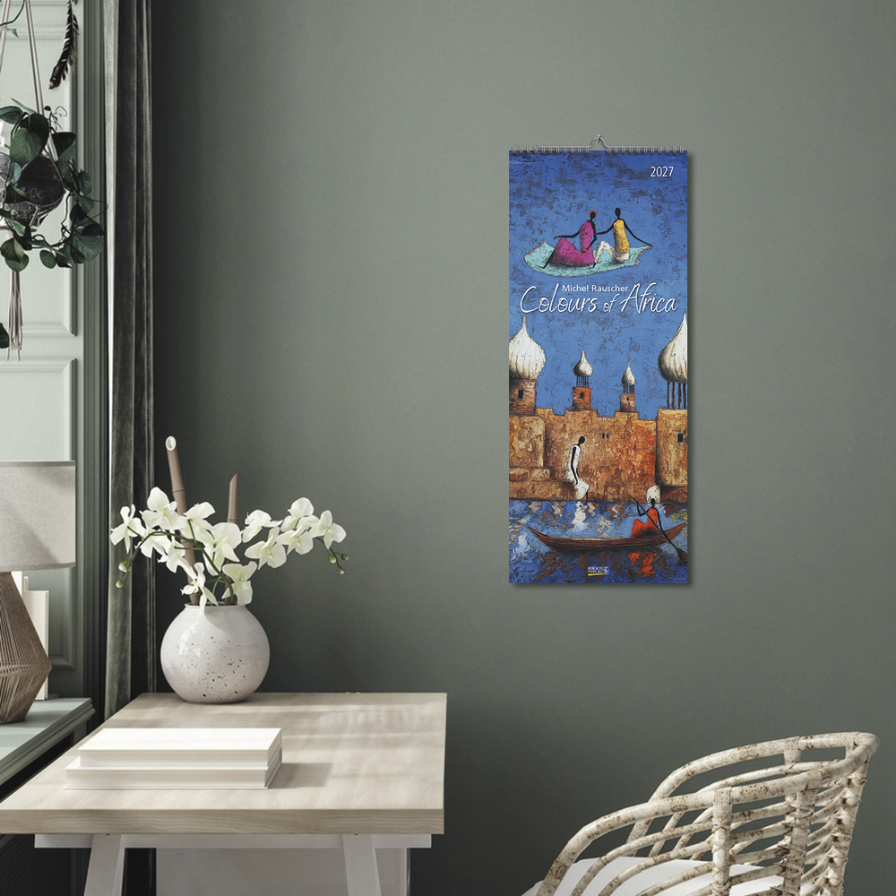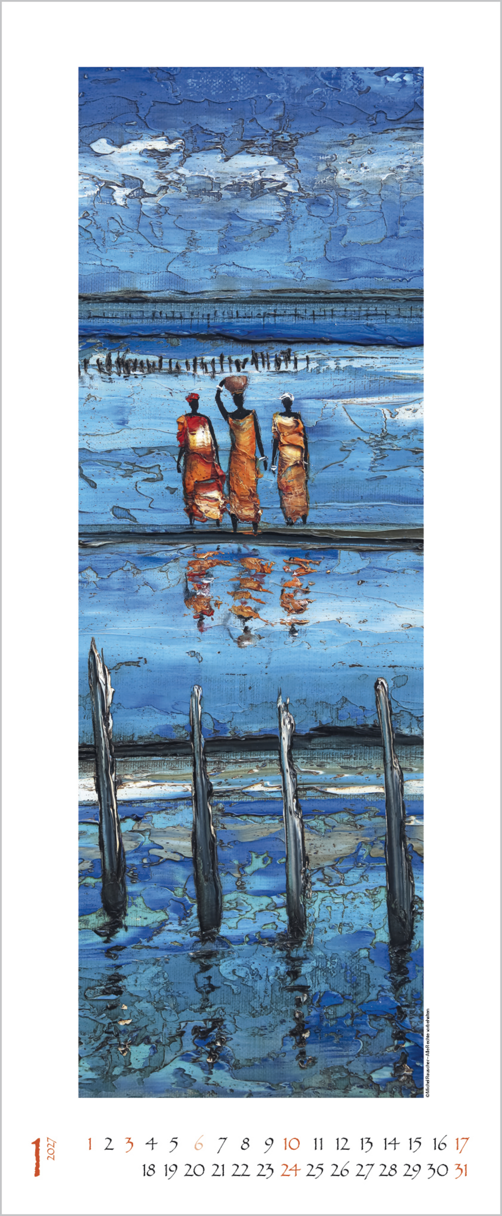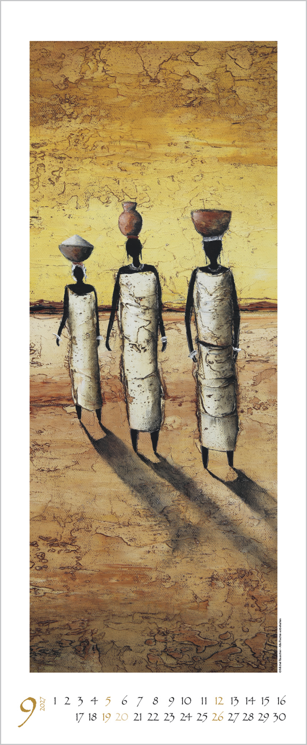 Der französische Maler Michel Rauscher wirft mit seinen reduzierten Menschendarstellungen einen ganz individuellen Blick auf den afrikanischen Kontinent. Seine modernen Impressionen versprühen Leichtigkeit und Eleganz und machen den Kalender zu einem dekorativen Blickfang.