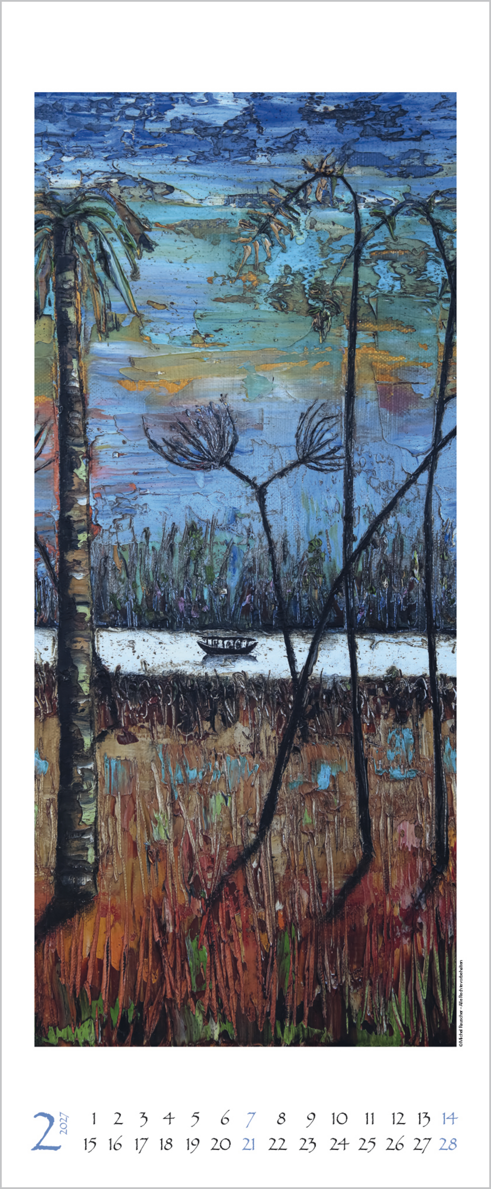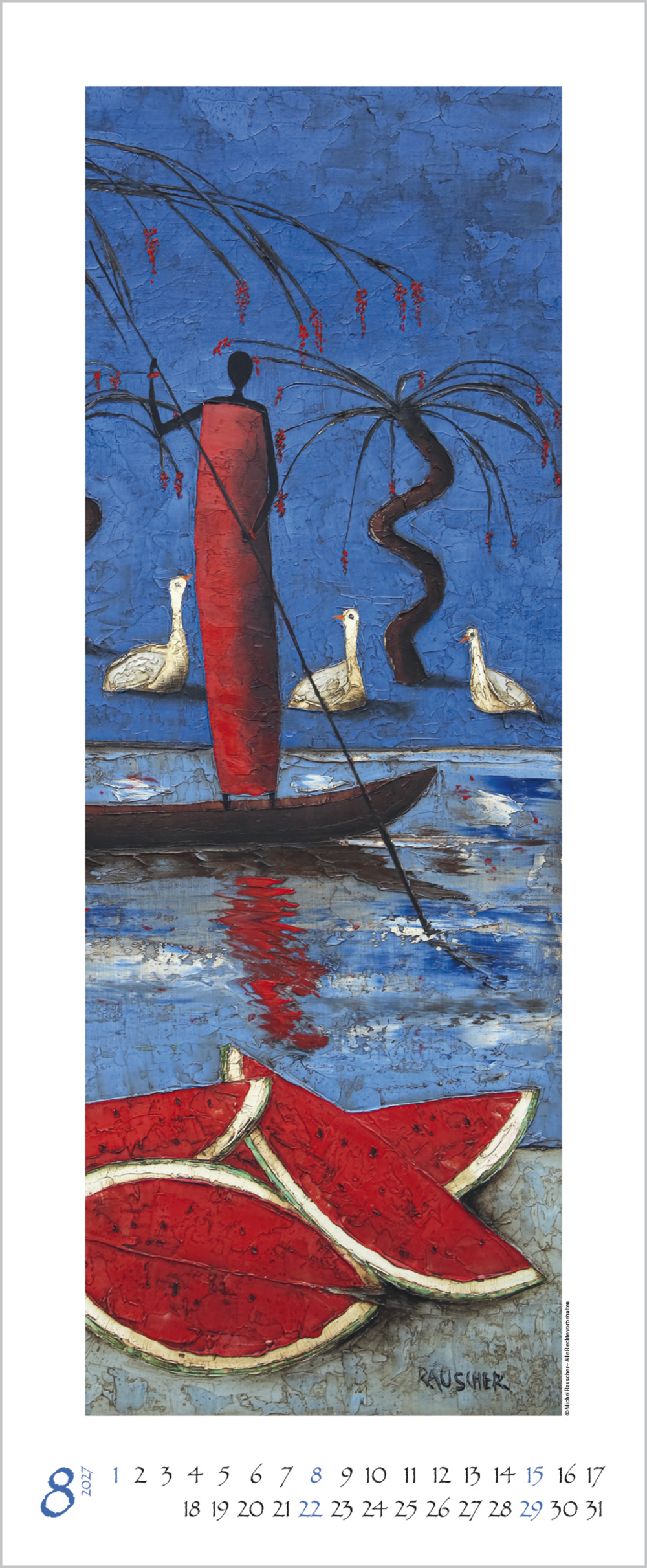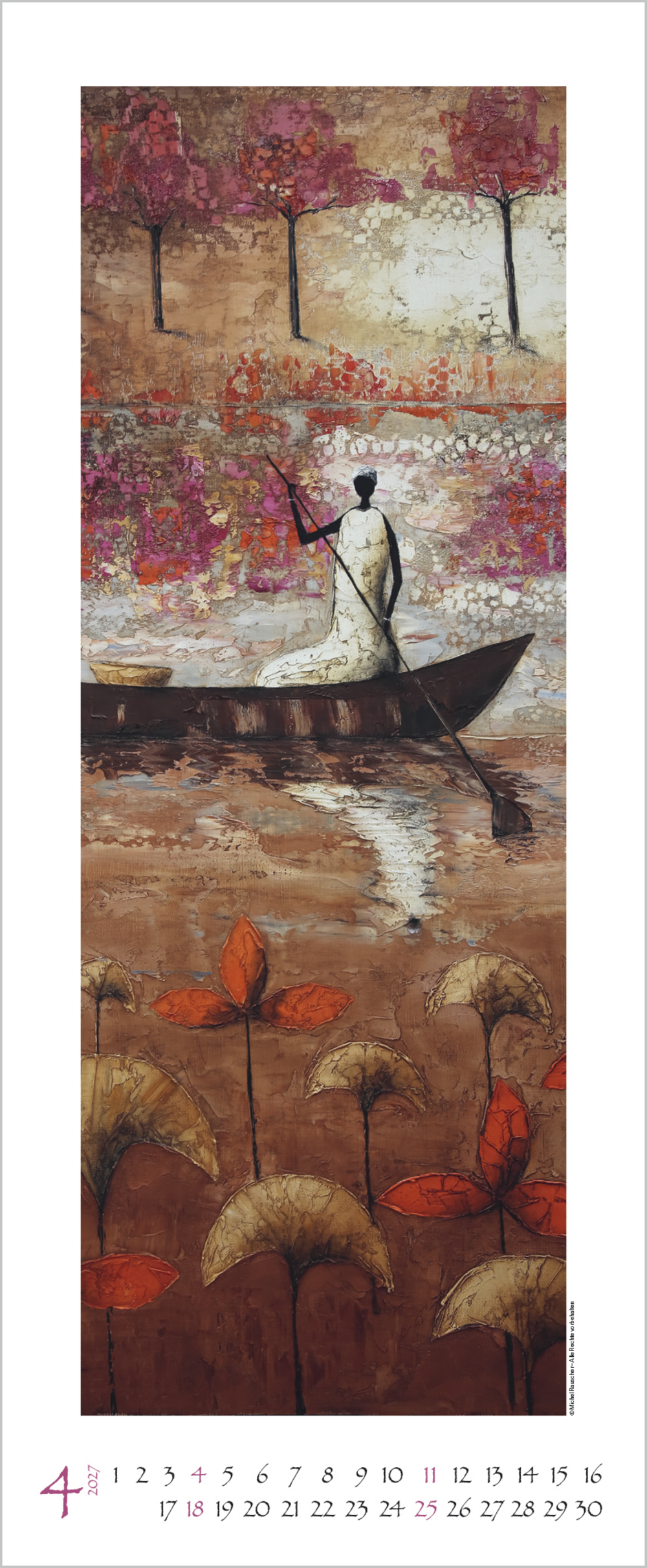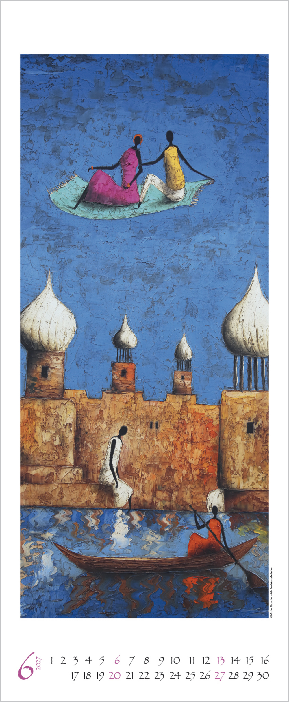 Der französische Maler Michel Rauscher wirft mit seinen reduzierten Menschendarstellungen einen ganz individuellen Blick auf den afrikanischen Kontinent. Seine modernen Impressionen versprühen Leichtigkeit und Eleganz und machen den Kalender zu einem dekorativen Blickfang.