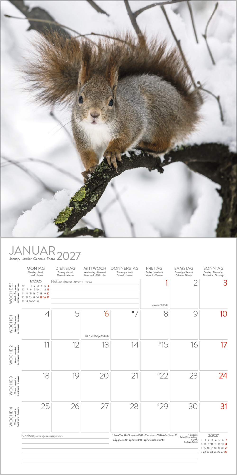 - Jede Kalenderseite mit großem Bild und viel Platz im Kalendarium für Notizen und Termine