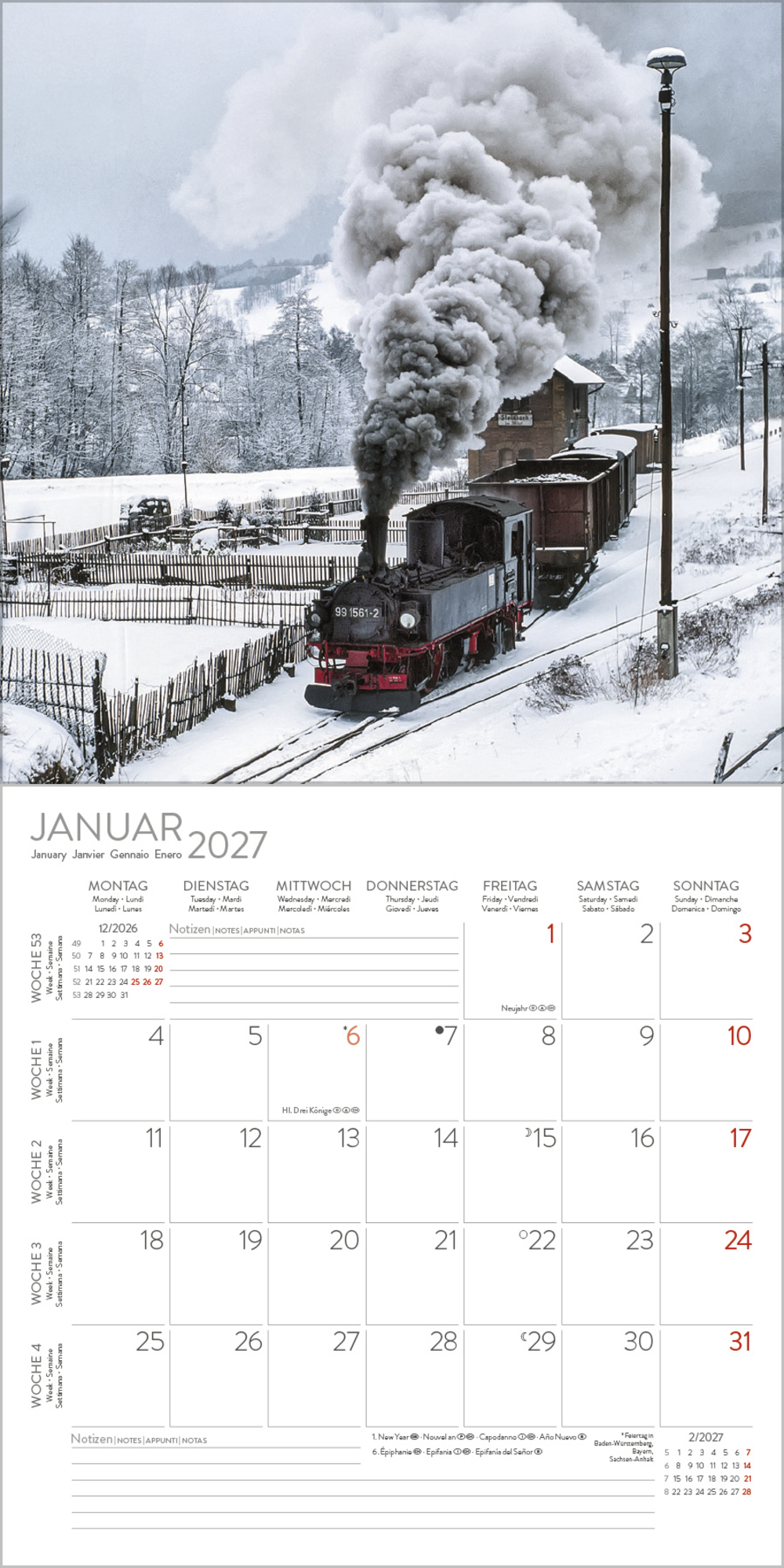 - Mehrsprachiges Kalendarium: DE/GB/FR/IT/ES mit Feiertagen für D/A/CH/GB/FR/IT/ES