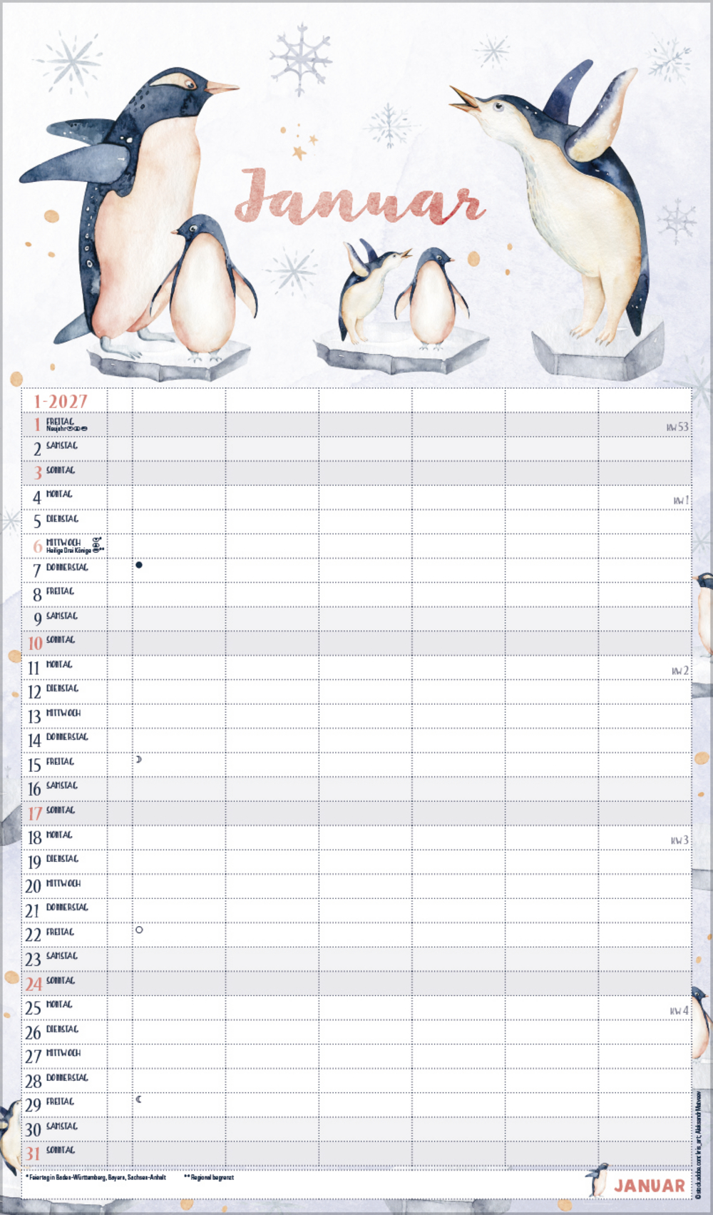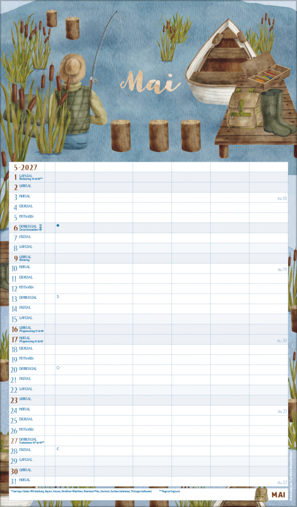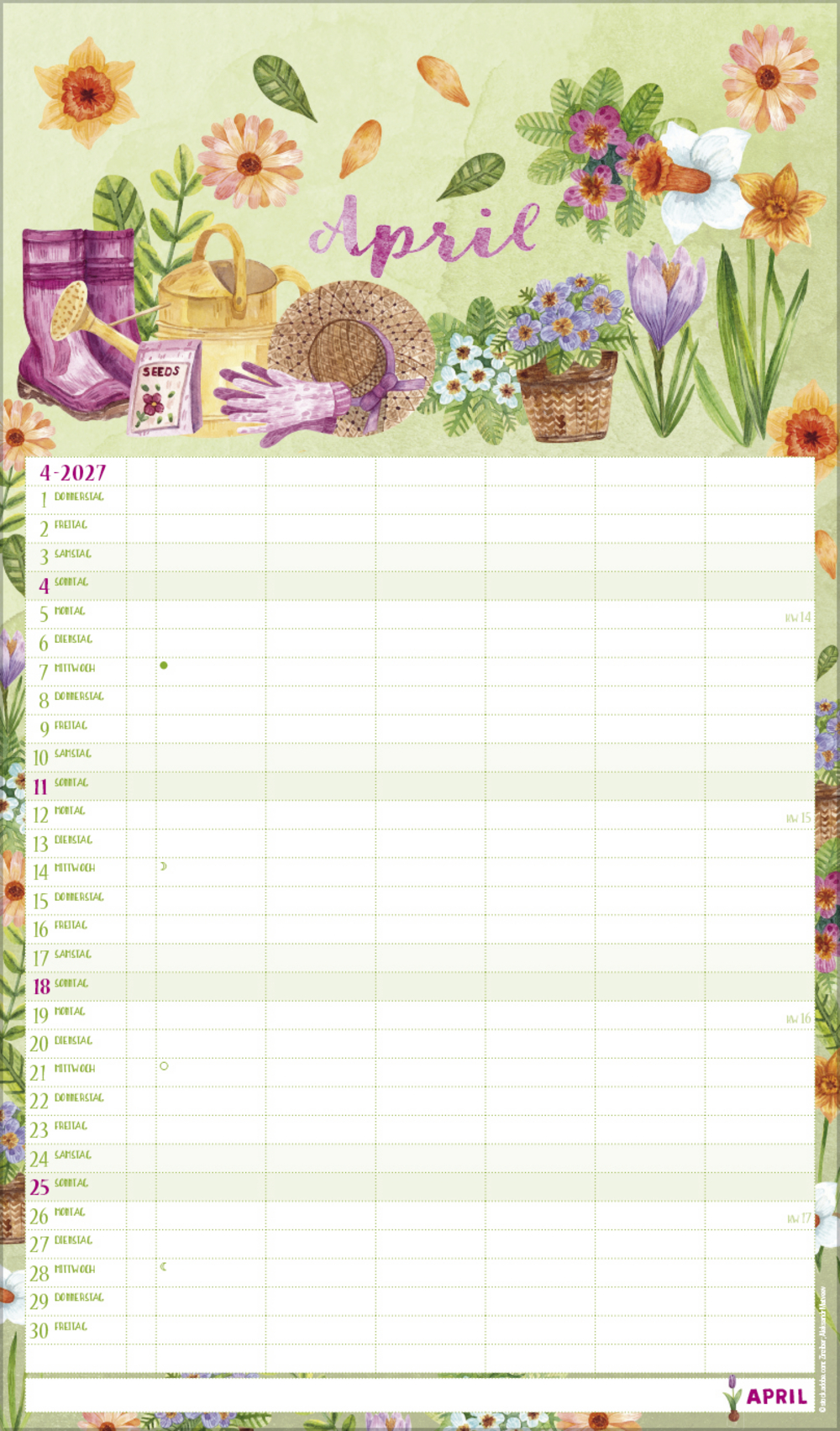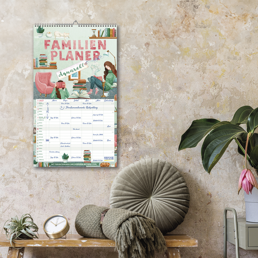 Aquarell-Motive liegen voll im Trend. 12 zarte und zugleich fröhliche Motive machen Monat für Monat gute Laune und bringen Schwung in die tägliche Planung. Ein luftig-leichter Familienplaner mit 6 Spalten, extra Müllspalte sowie Ferienterminen und Vorschau bis März des Folgejahres.