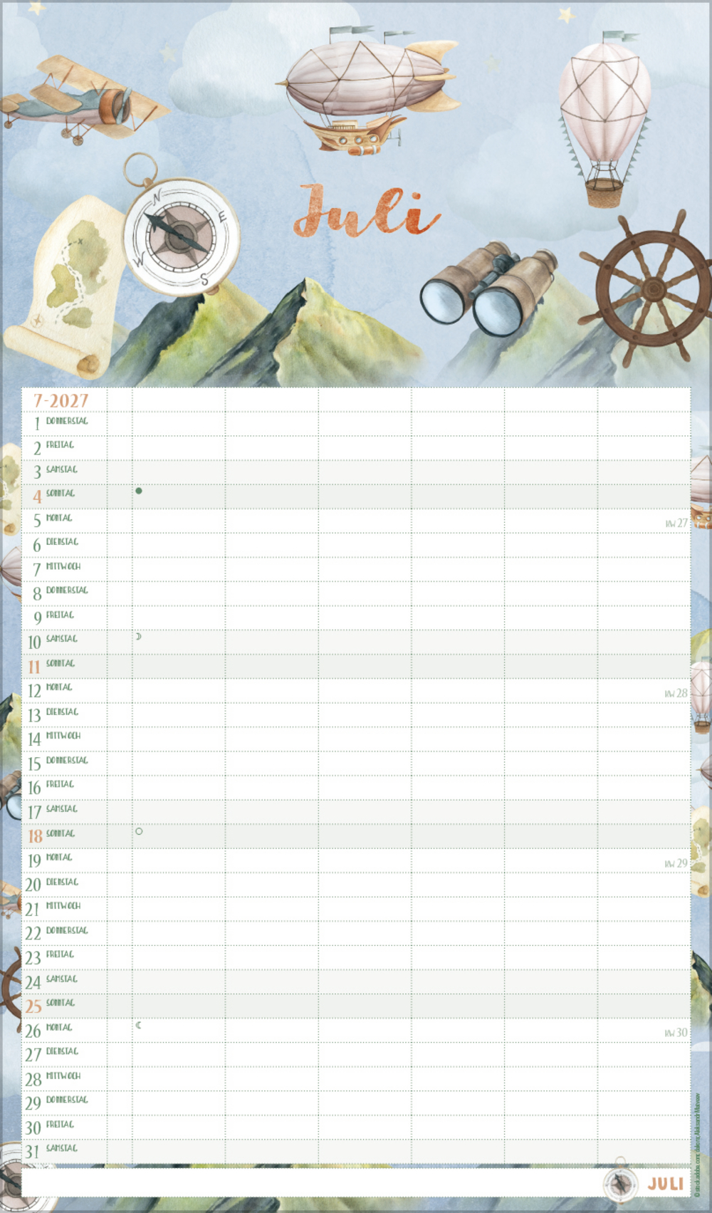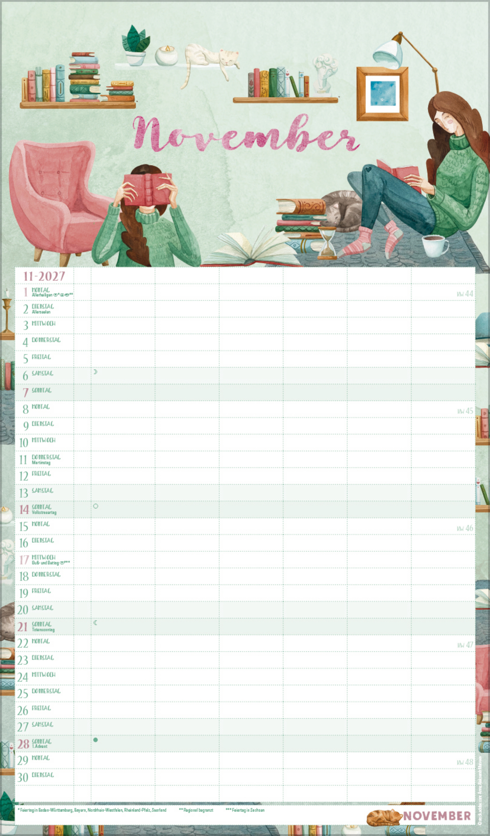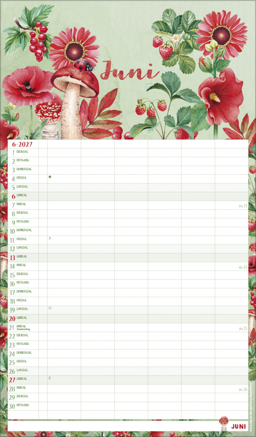 Aquarell-Motive liegen voll im Trend. 12 zarte und zugleich fröhliche Motive machen Monat für Monat gute Laune und bringen Schwung in die tägliche Planung. Ein luftig-leichter Familienplaner mit 6 Spalten, extra Müllspalte sowie Ferienterminen und Vorschau bis März des Folgejahres.
