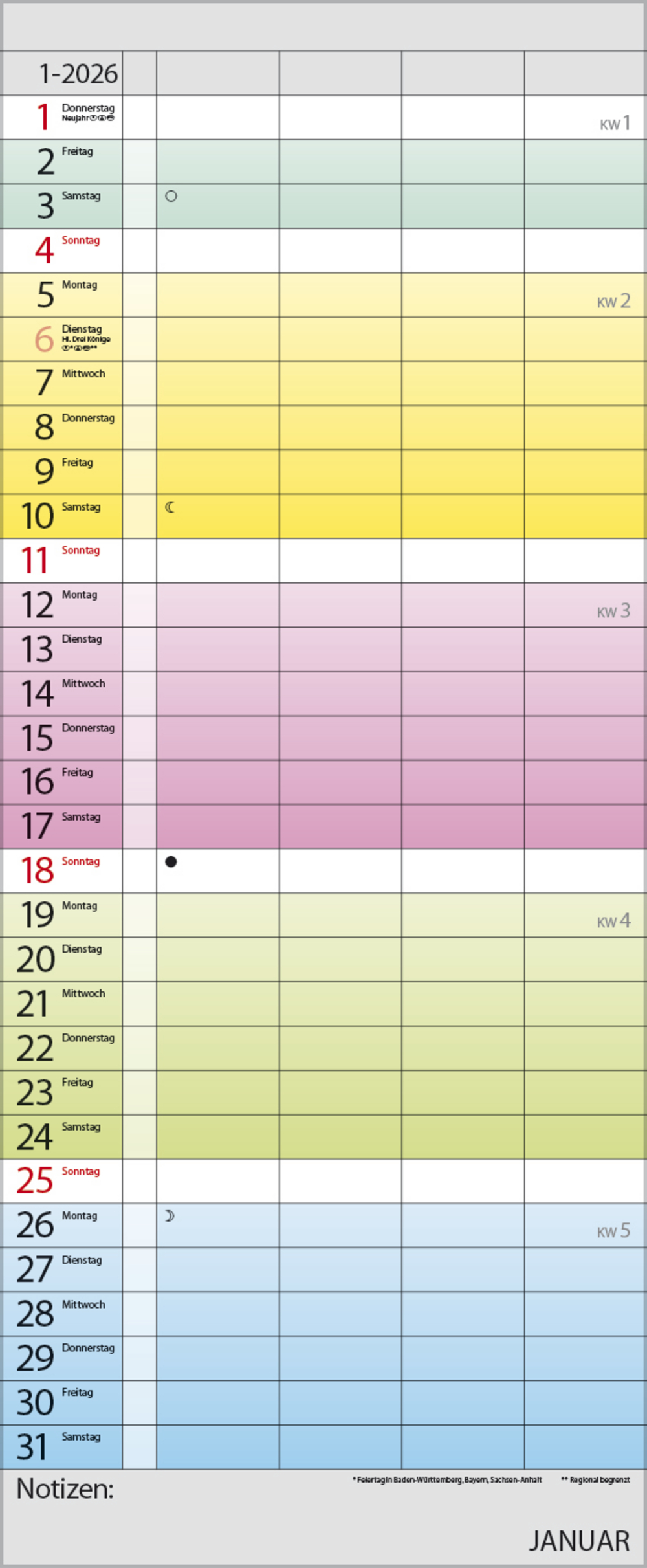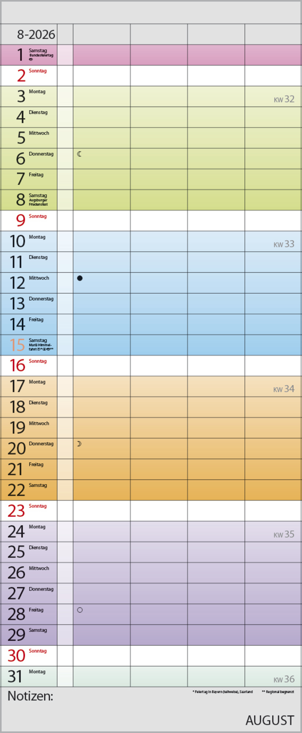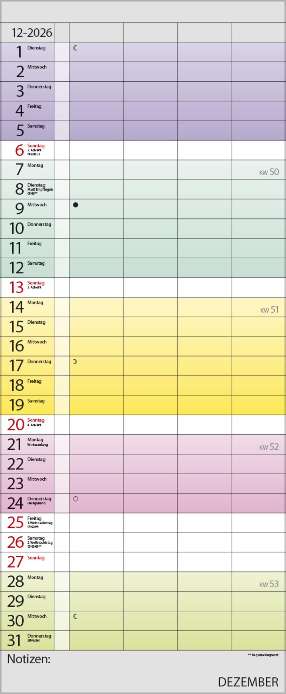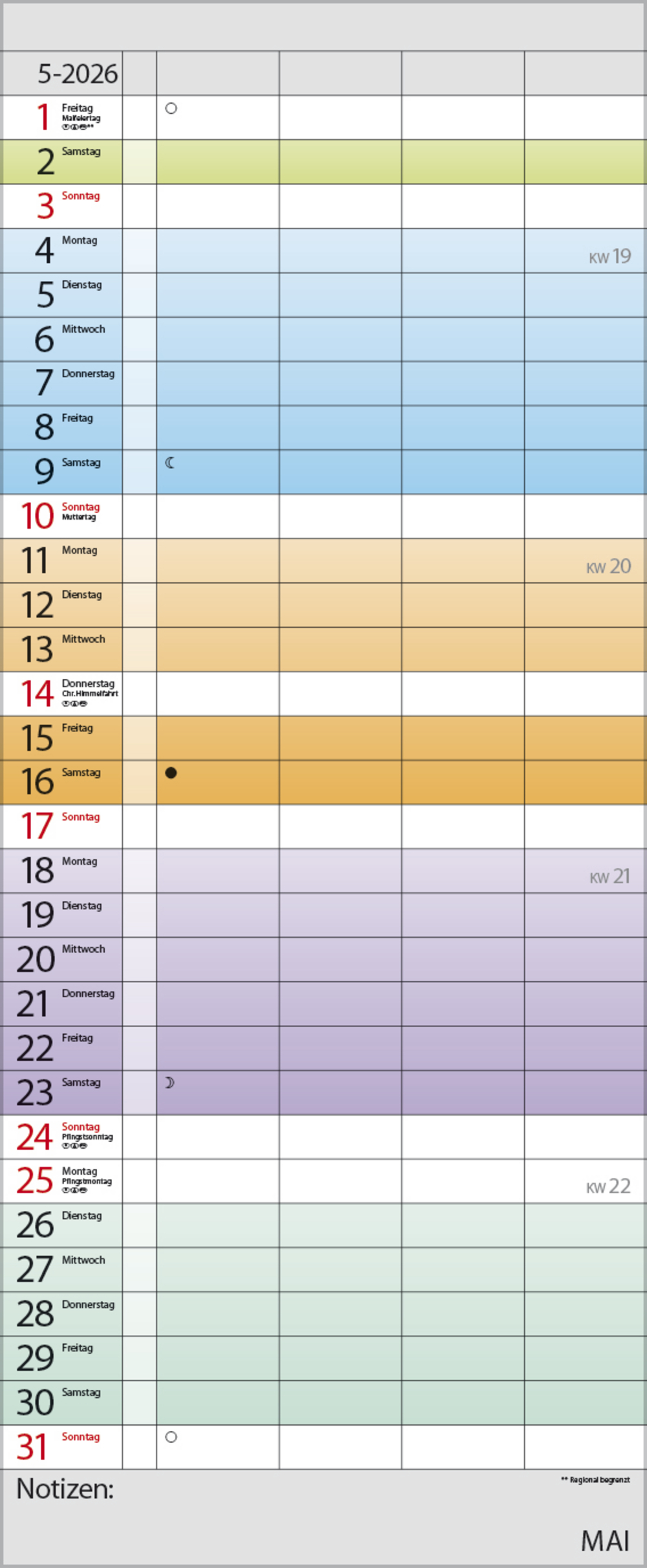 Hinzu kommen farblich hervorgehobene Sonn- und Feiertage, sowie die Anzeige der Zeitumstellung, damit kein Termin mehr übersehen wird. Weitere Informationen wie Mondphasen, Ferientermine und Feiertage (auch regionale) sowie deutlich lesbare Kalenderwochen runden den Kalender ab und sorgen für einen vollständigen Überblick Ihres Jahres.