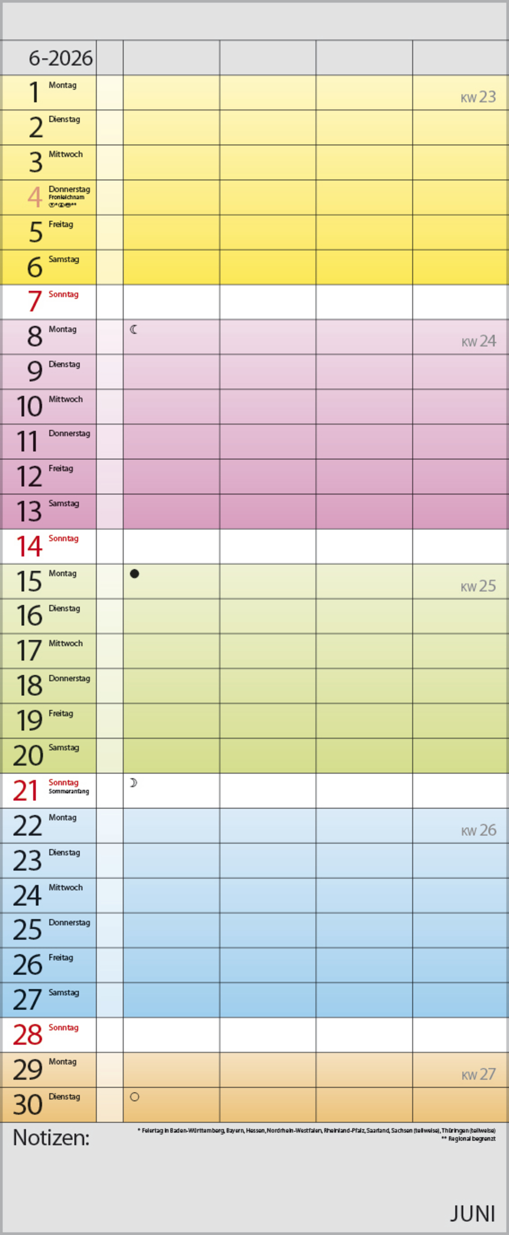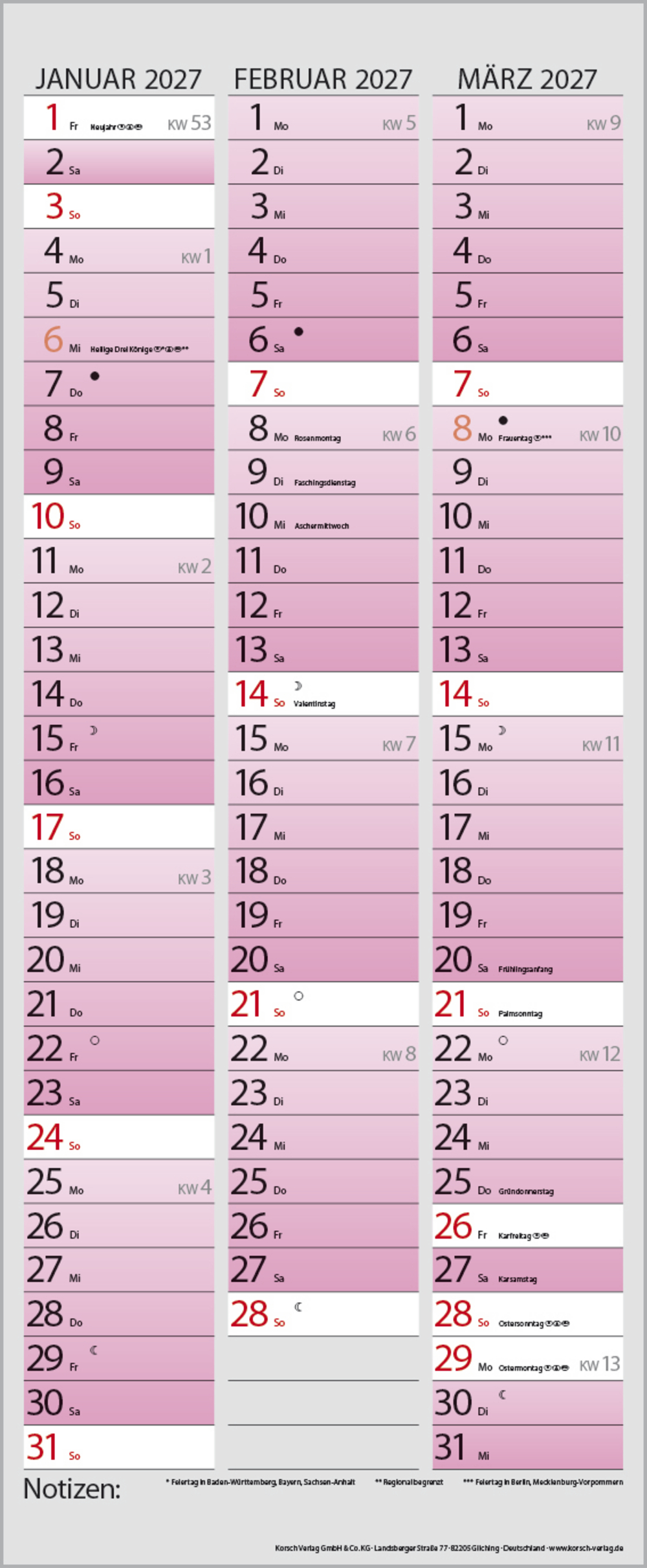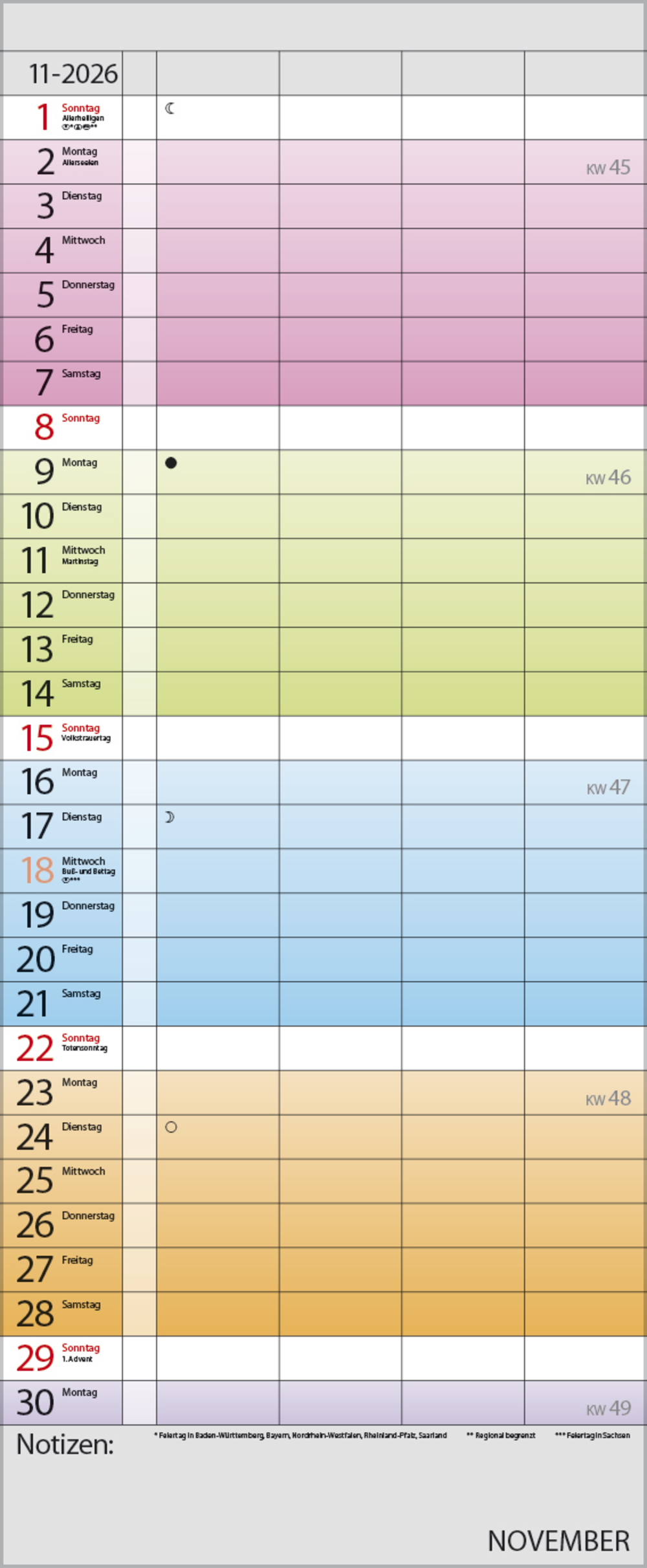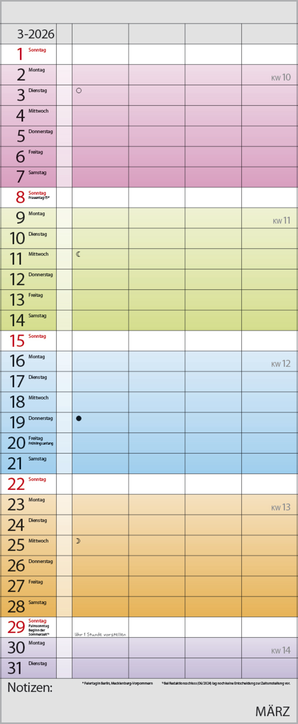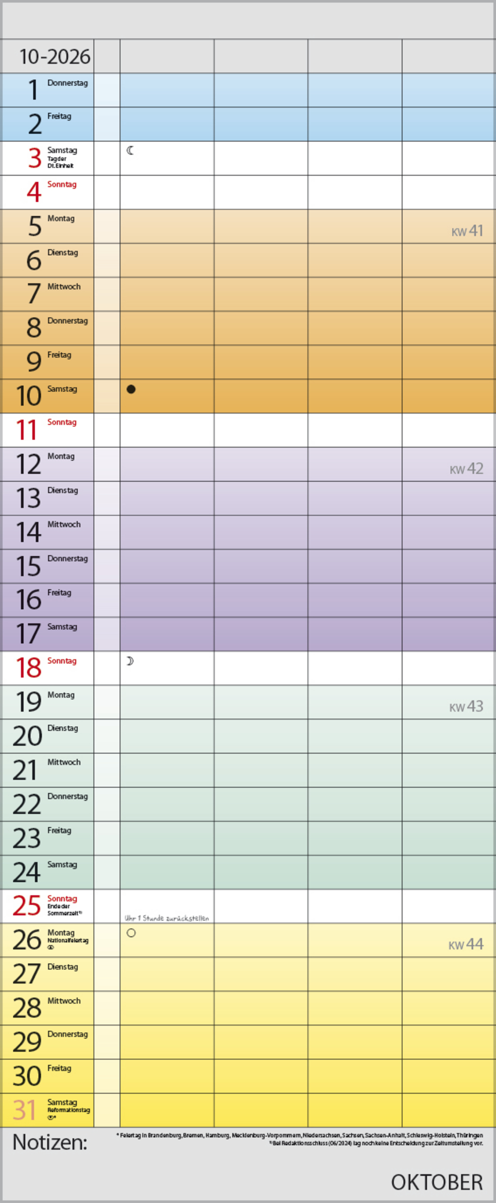 Hinzu kommen farblich hervorgehobene Sonn- und Feiertage, sowie die Anzeige der Zeitumstellung, damit kein Termin mehr übersehen wird. Weitere Informationen wie Mondphasen, Ferientermine und Feiertage (auch regionale) sowie deutlich lesbare Kalenderwochen runden den Kalender ab und sorgen für einen vollständigen Überblick Ihres Jahres.