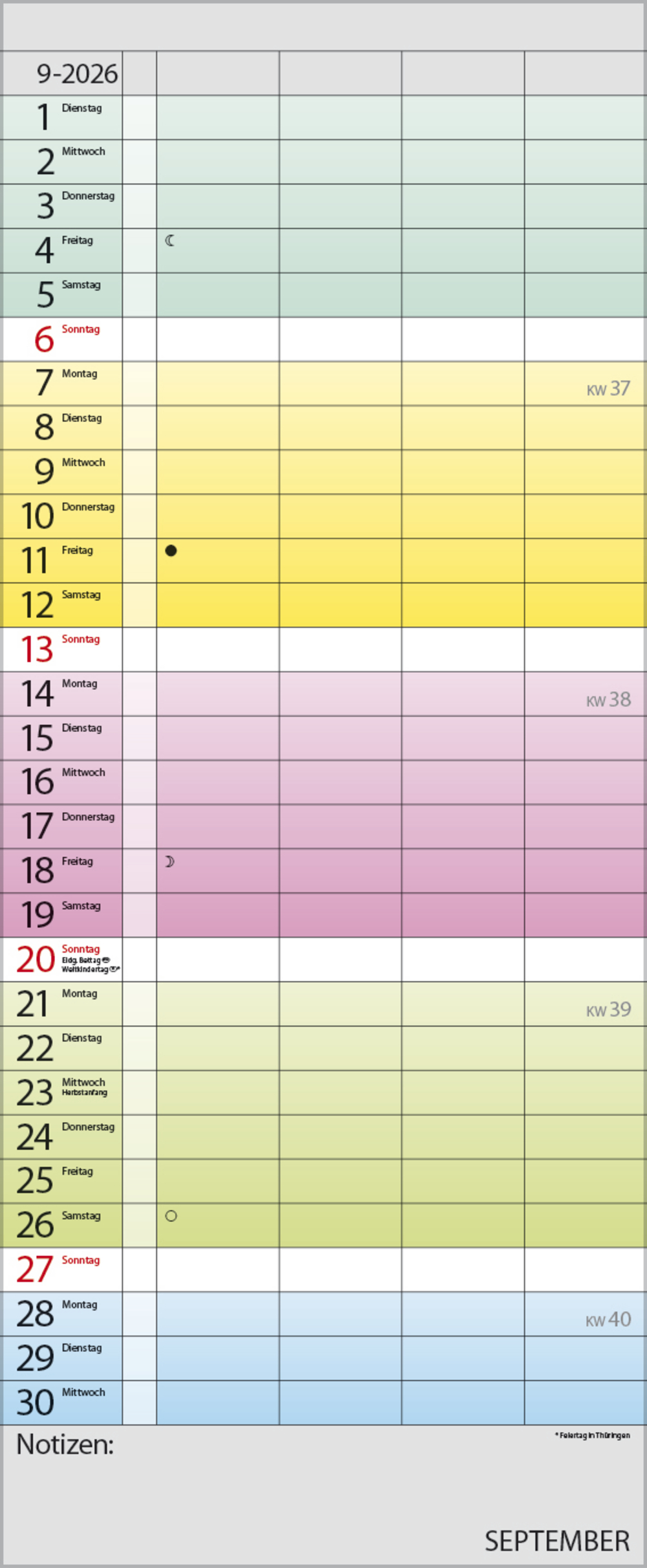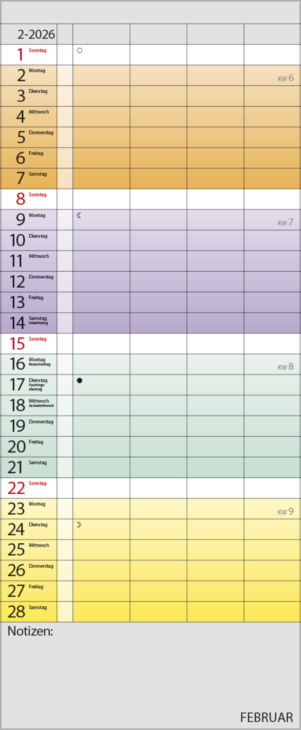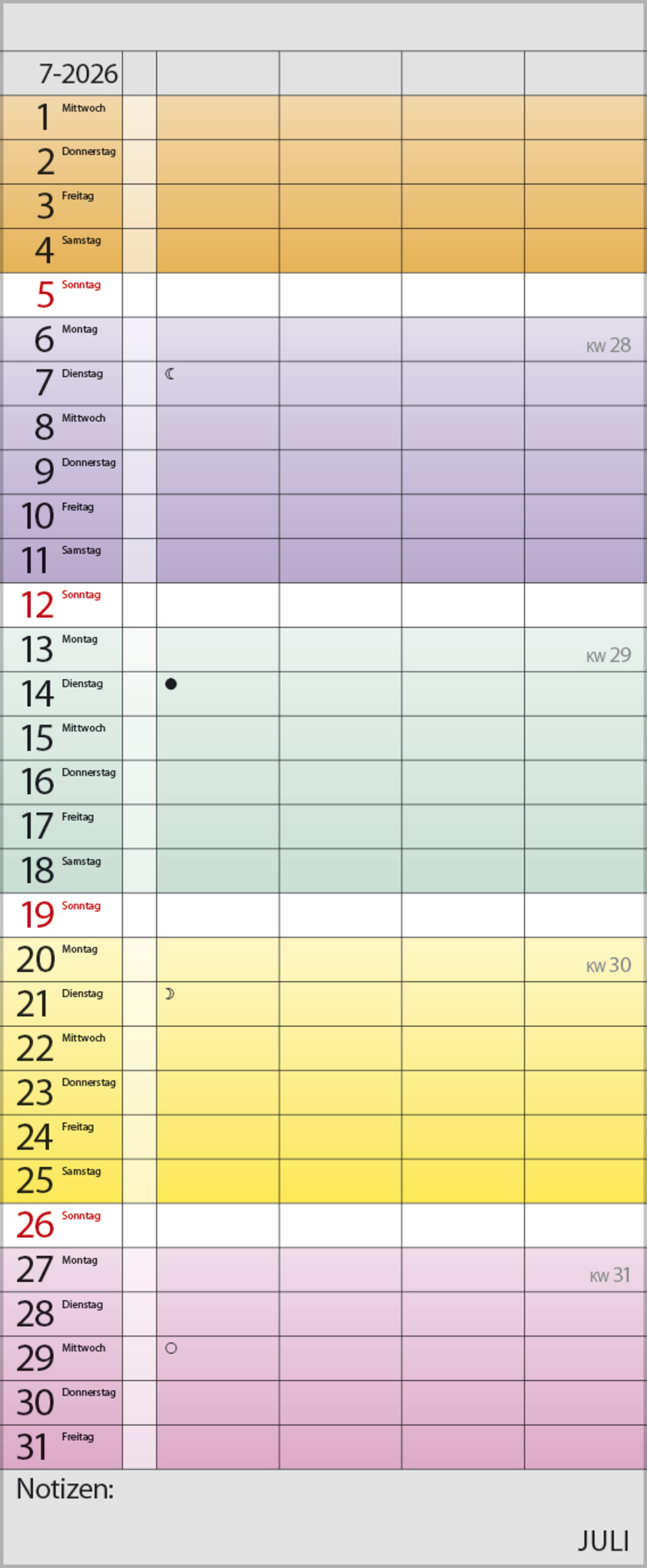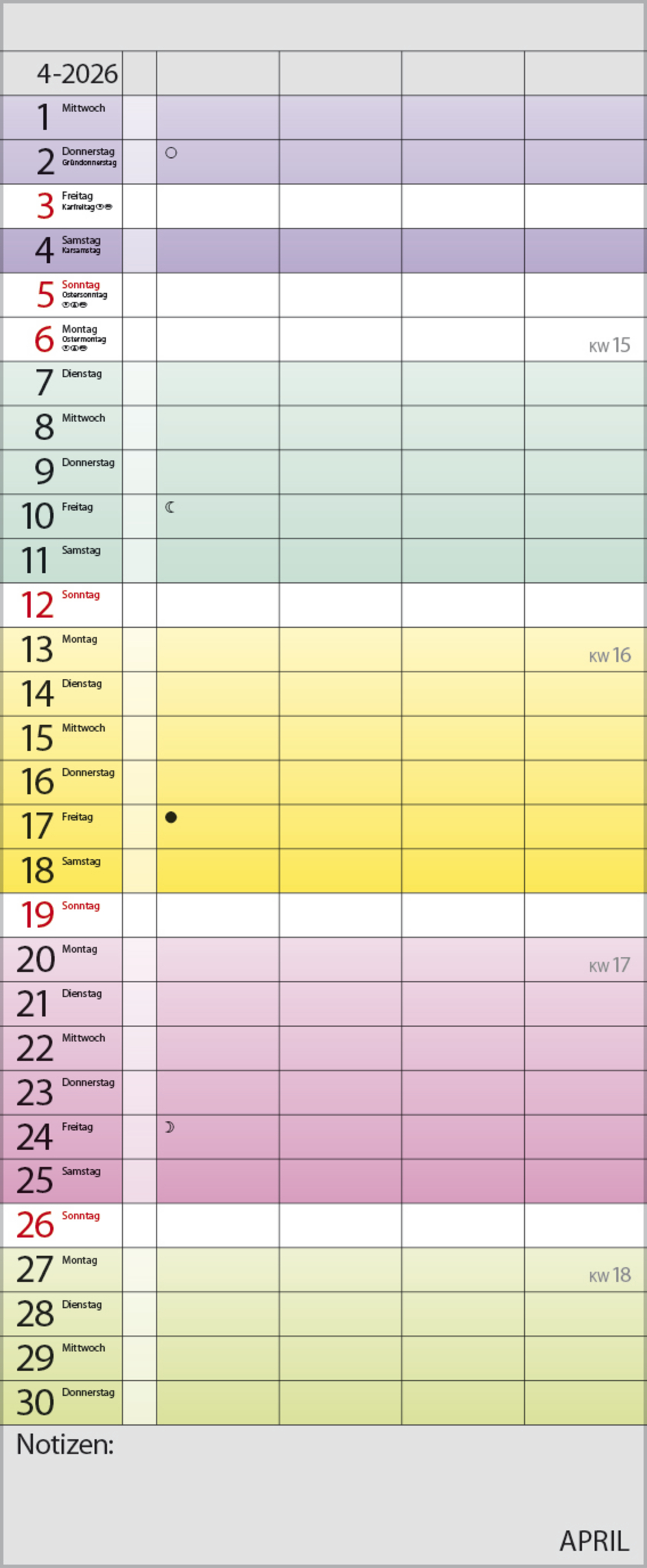 • Wöchentlich wechselnde moderne Farben mit viel Platz für Eintragungen, ohne störende Bilder in den Spalten