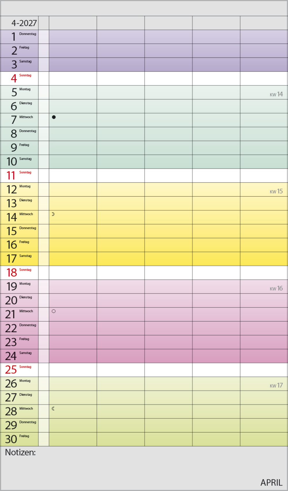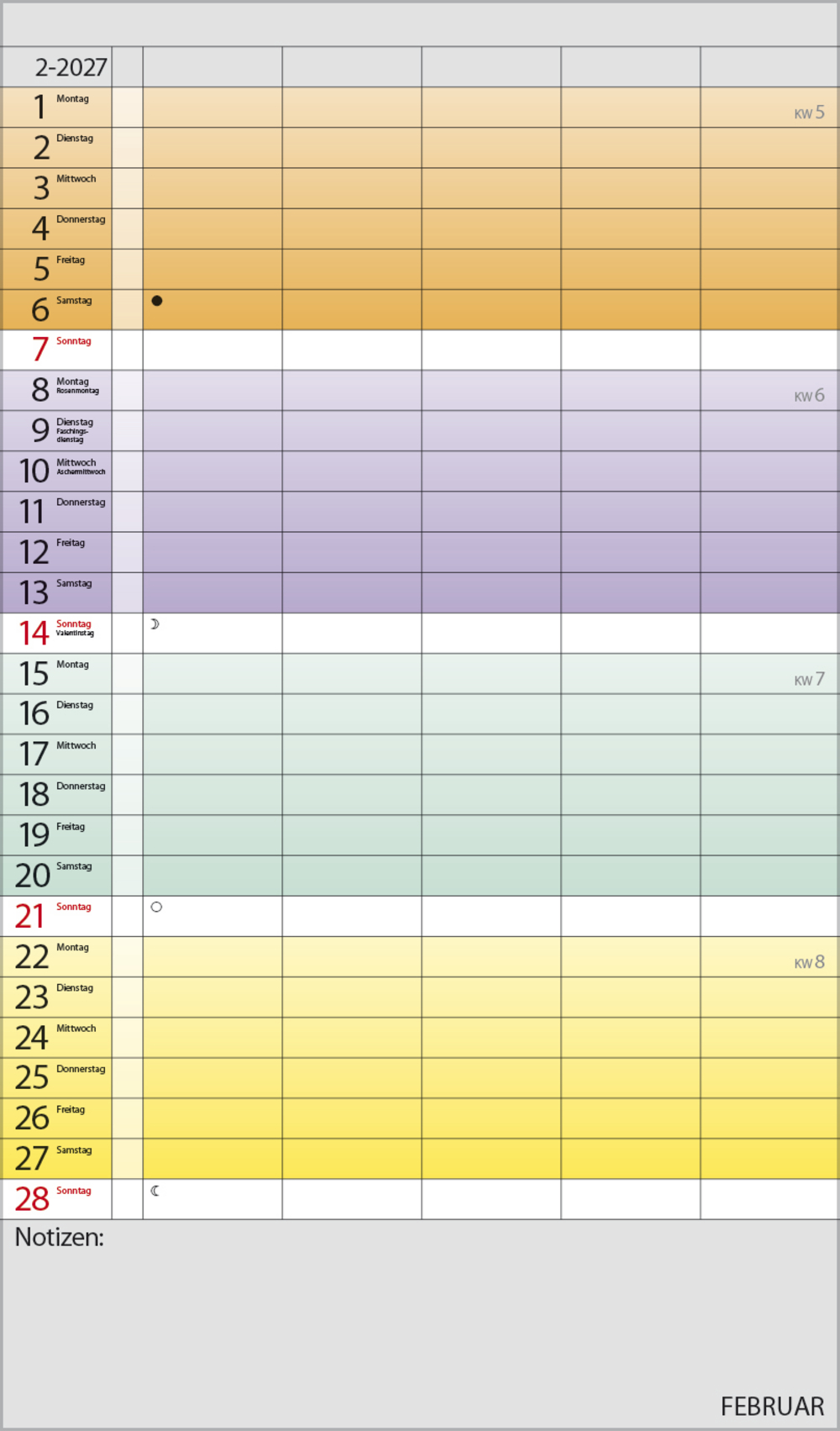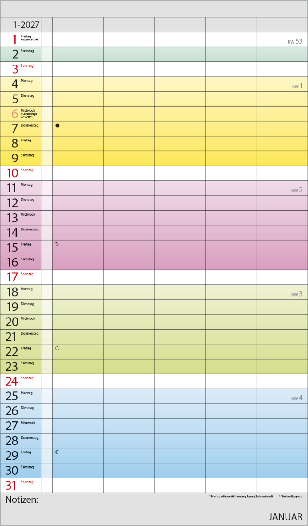 - Wöchentlich wechselnde moderne Farben mit viel Platz für Eintragungen, ohne störende Bilder in den Spalten