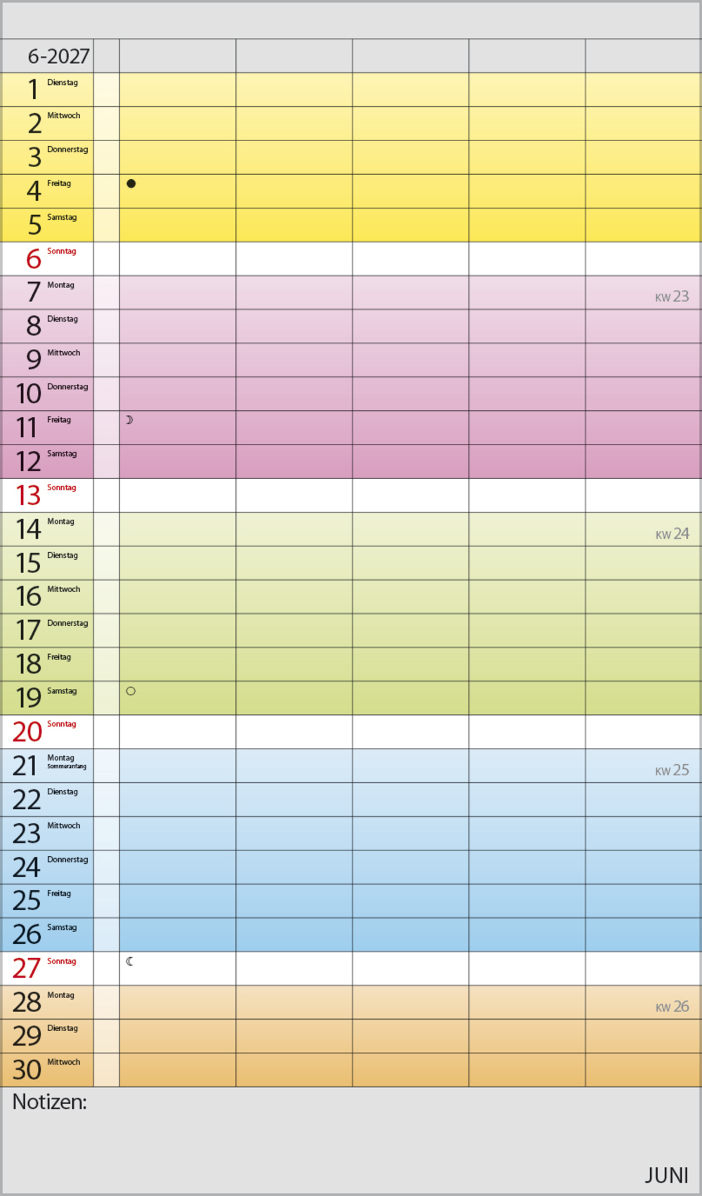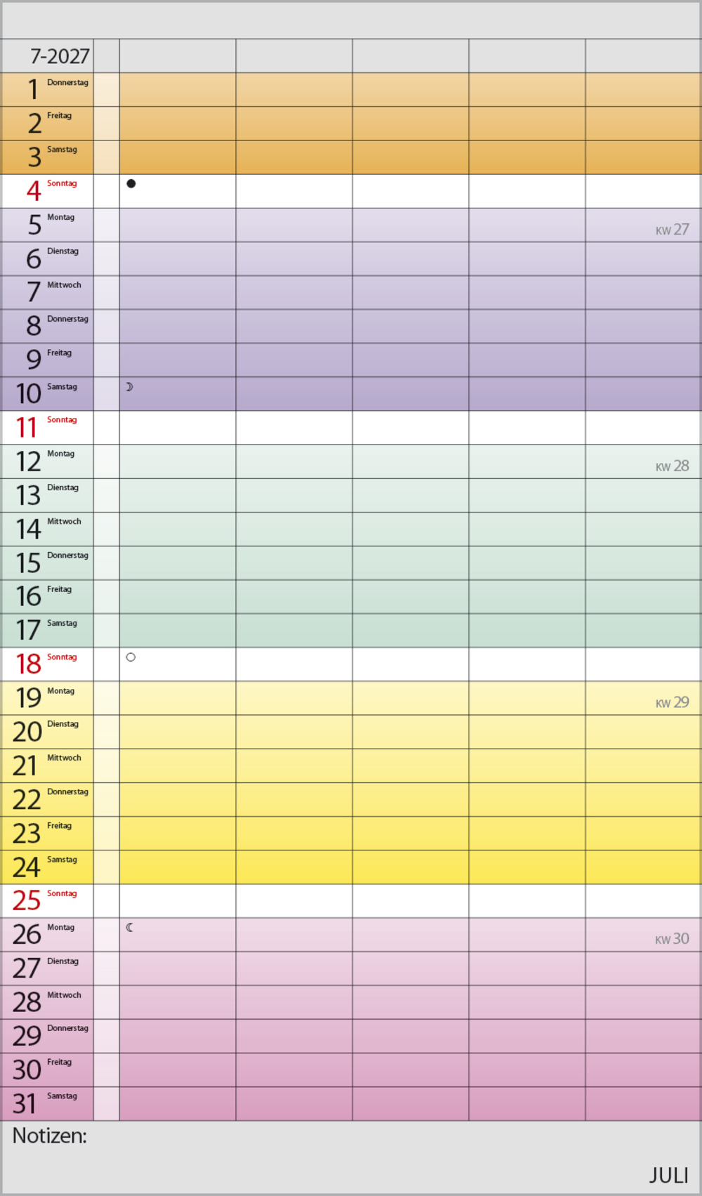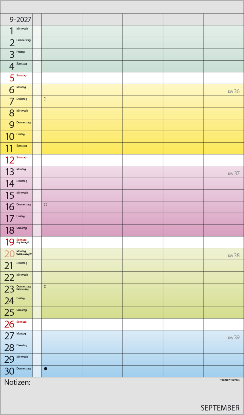 - Wöchentlich wechselnde moderne Farben mit viel Platz für Eintragungen, ohne störende Bilder in den Spalten