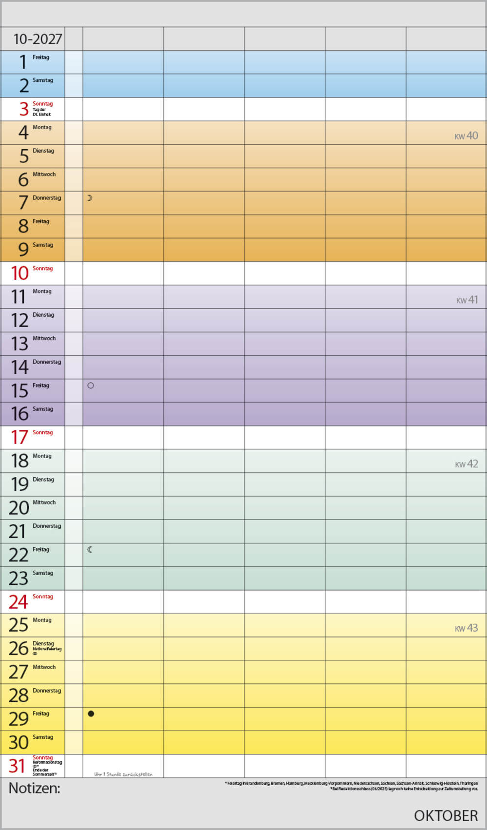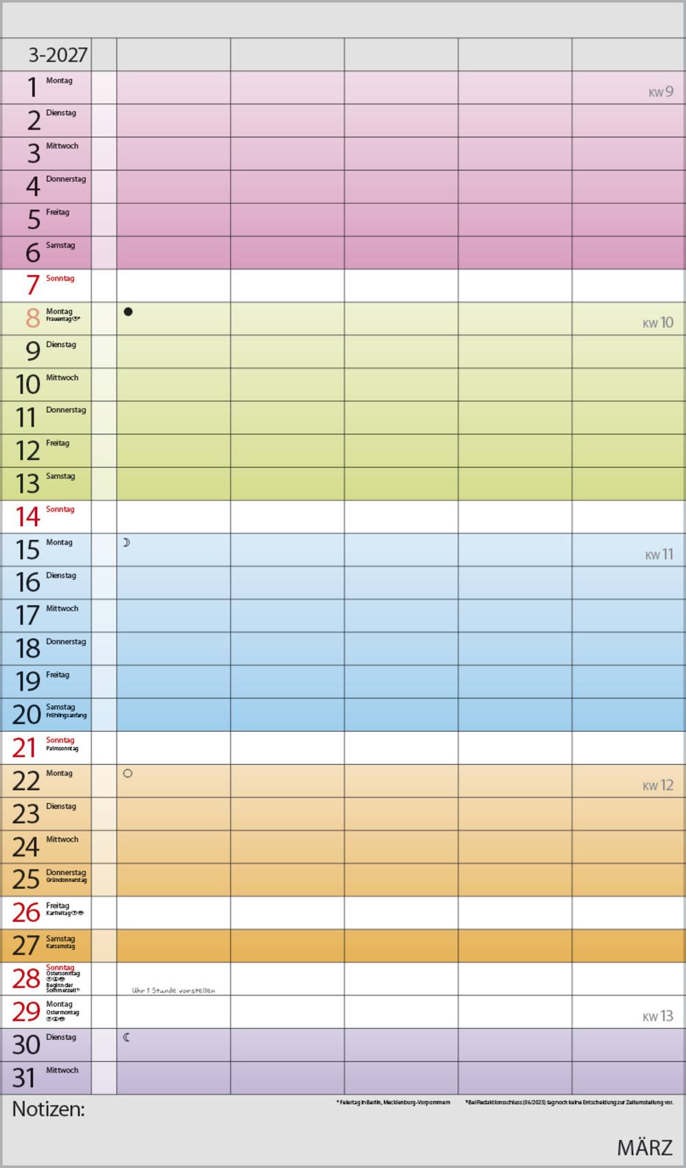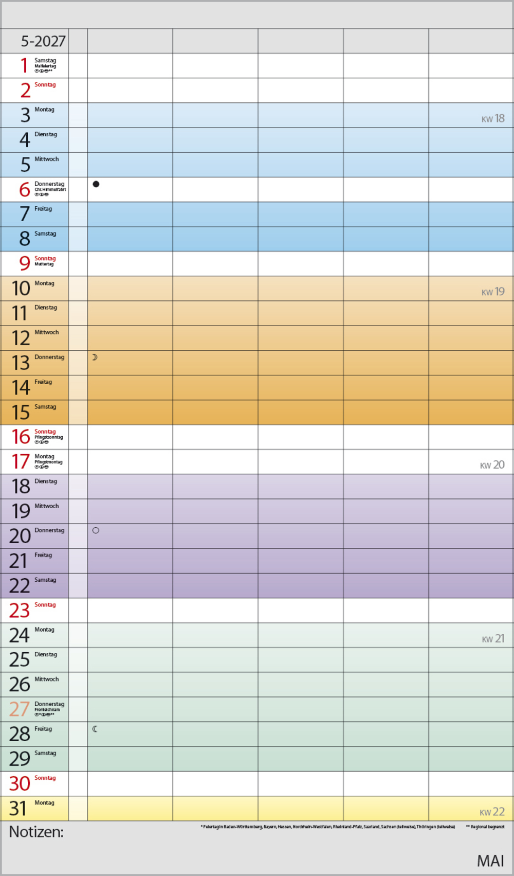 Hinzu kommen farblich hervorgehobene Sonn- und Feiertage, sowie die Anzeige der Zeitumstellung, damit kein Termin mehr übersehen wird. Weitere Informationen wie Mondphasen, Ferientermine und Feiertage (auch regionale) sowie deutlich lesbare Kalenderwochen runden den Kalender ab und sorgen für einen vollständigen Überblick Ihres Jahres.